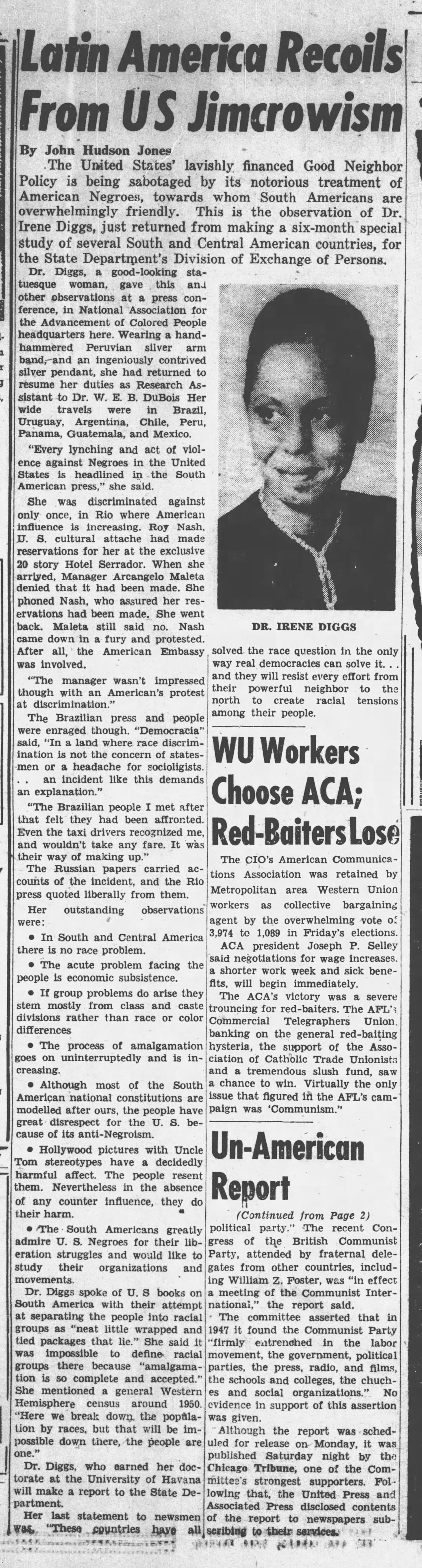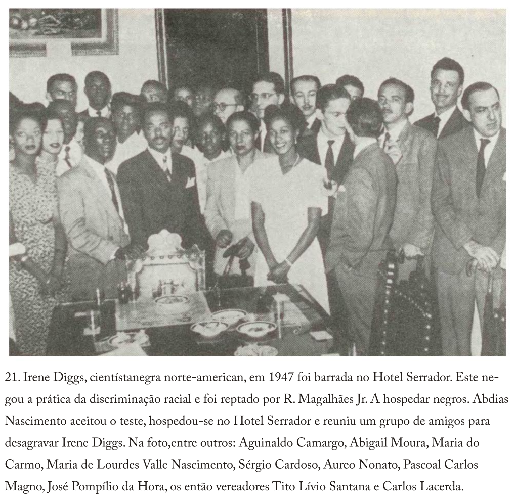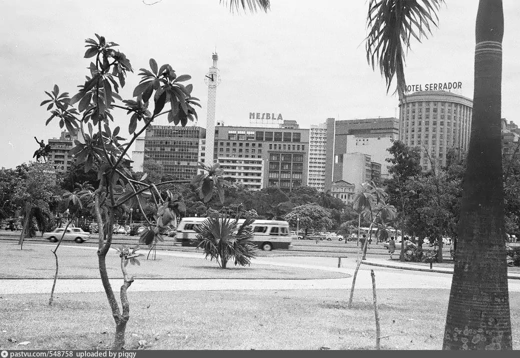 1947 article about Irene Diggs being turned away | 1947, demonstration against the Hotel Serrador, O negro revoltado | 1951, the Crisis asks, "Is Racial Prejudice on the Rise in Brazil", the Internet Archive | Undated photo of Paris Square with the Serrador Building in the background, Werner Haberkorn, Ipiringa Museum, Wikimedia Commons | 1974, pastvu.com | mid-1970s demolition photos of the Palácio Monroe with the Hotel Serrador in the background