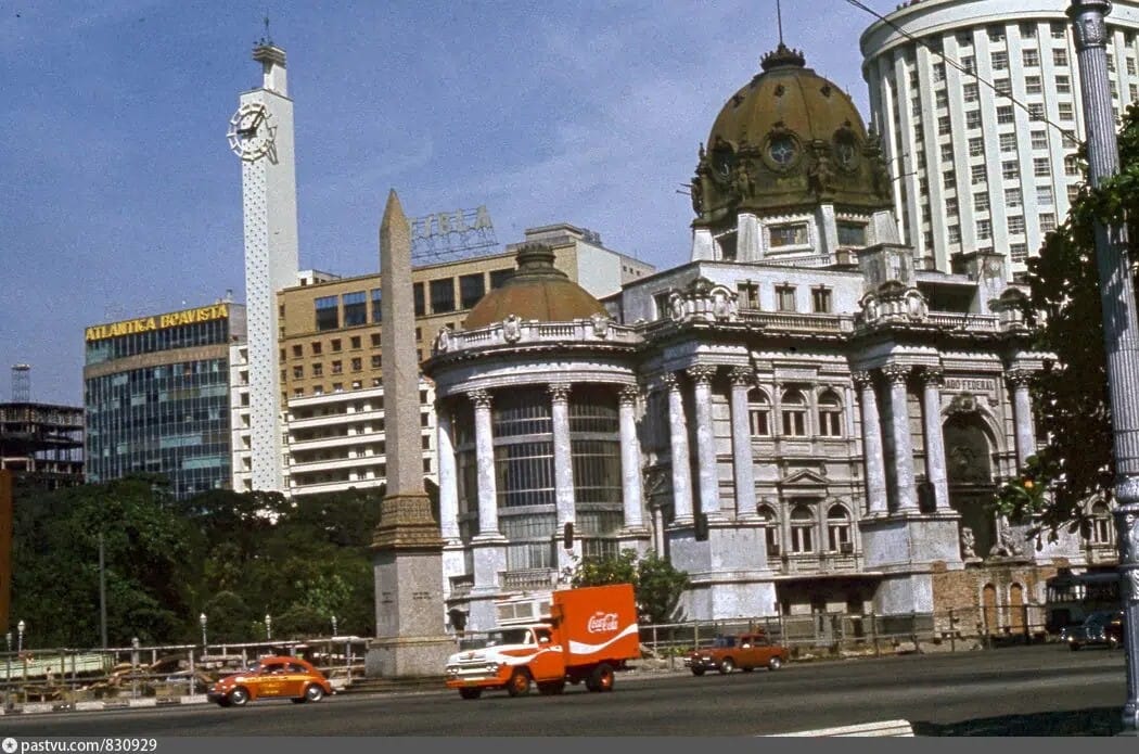 So, what’s changed? Well, first off, yeah, I flubbed the angle a little bit—I know—but there’s a mildly exculpatory excuse: when this postcard was published, the Palácio Monroe stood in front of the Edifício Serrador. When it was demolished in 1976 and replaced with the Praça Mahatma Gandhi, the reconfiguration of the streets for the new plaza claimed the little promenade this photo was taken from—it’s now a service road (but yes, I mostly just bungled this, but I won’t be back in Rio anytime soon so). The other notable change is the activation of the top floor and the addition on top, part of a 2009 renovation.