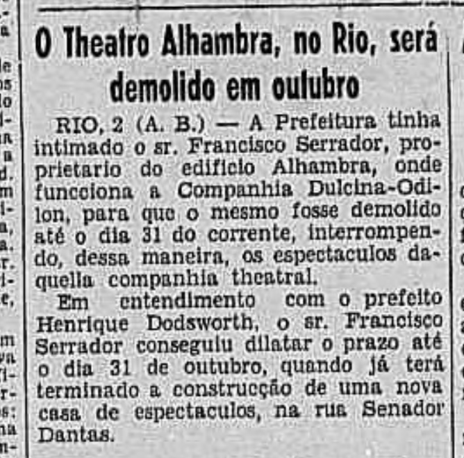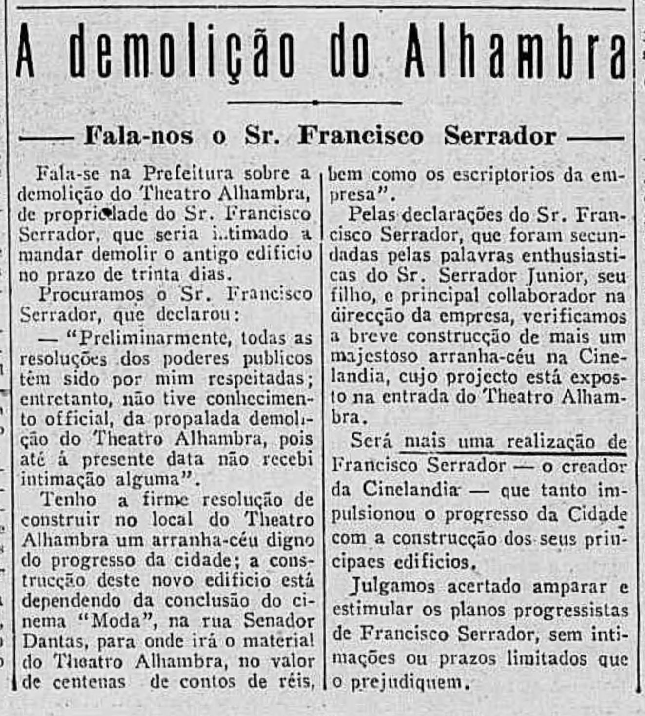 Francisco Serrador, Wikimedia Commons | Cine Alhambra, BNDigital | 1939 articles about the demolition of the Alhambra, the Internet Archive | 1940 articles about the Alhambra fire, the Internet Archive