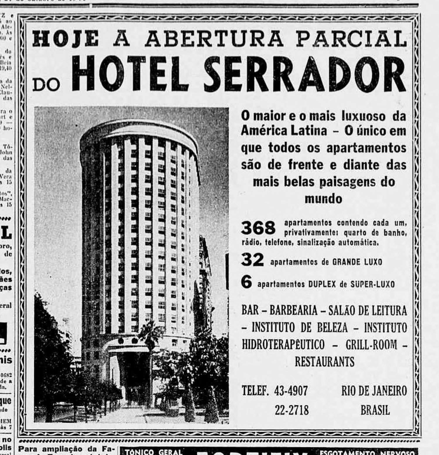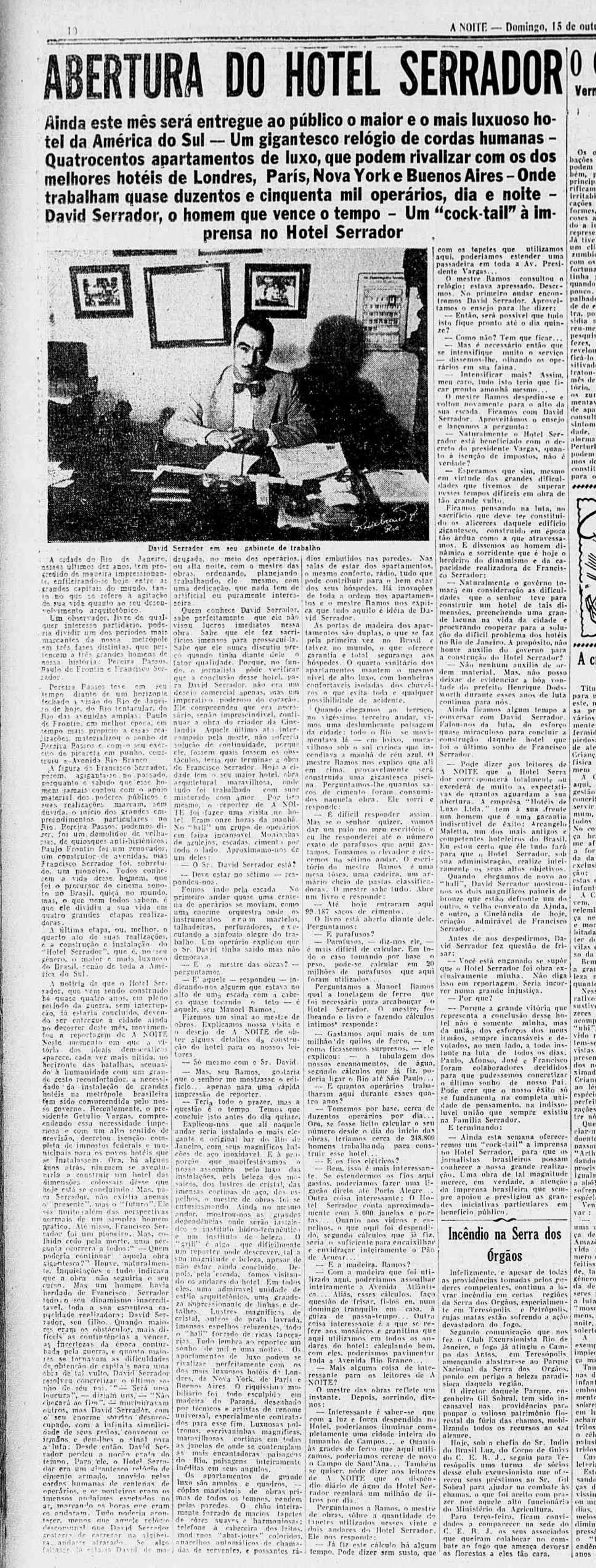1941, Serrador Obituary, the Internet Archive | ~1942 construction photo | 1943 construction photo, A Cena Muda | 1944 articles about the dedication and opening of the Hotel Serrador, the Internet Archive | Hotel Serrador luggage tag