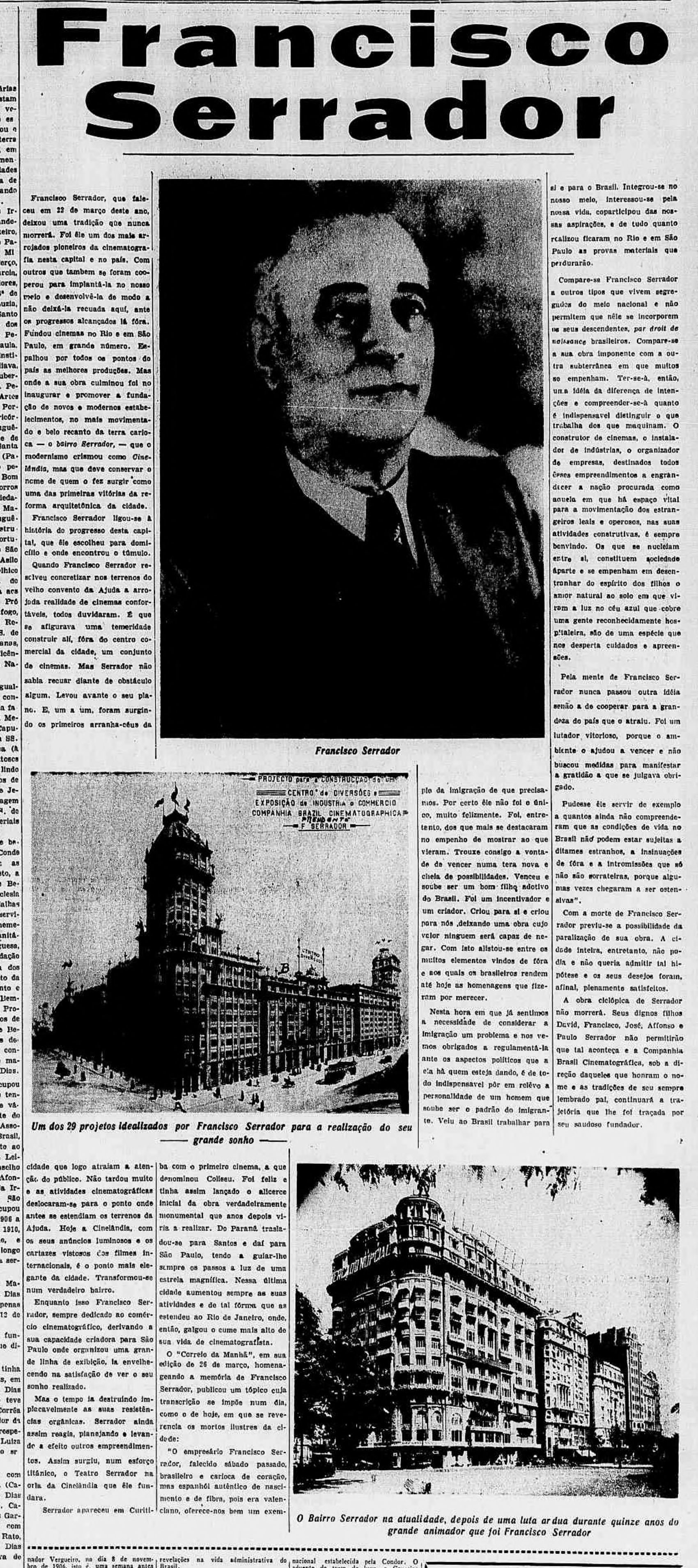A Spanish immigrant to Brazil, Francisco Carbonell Serrador built an early cinema empire in São Paulo, one that launched him into Rio in the late 1910s, where his company swelled into a film distribution and exhibition giant that dominated the market. Inspired by Times Square and Broadway, the Serrador spent the 1920s and 1930s amassing an entertainment empire of cinemas, hotels, casinos, and theaters that turned the neighborhood around Praça Floriano into Cinelândia.