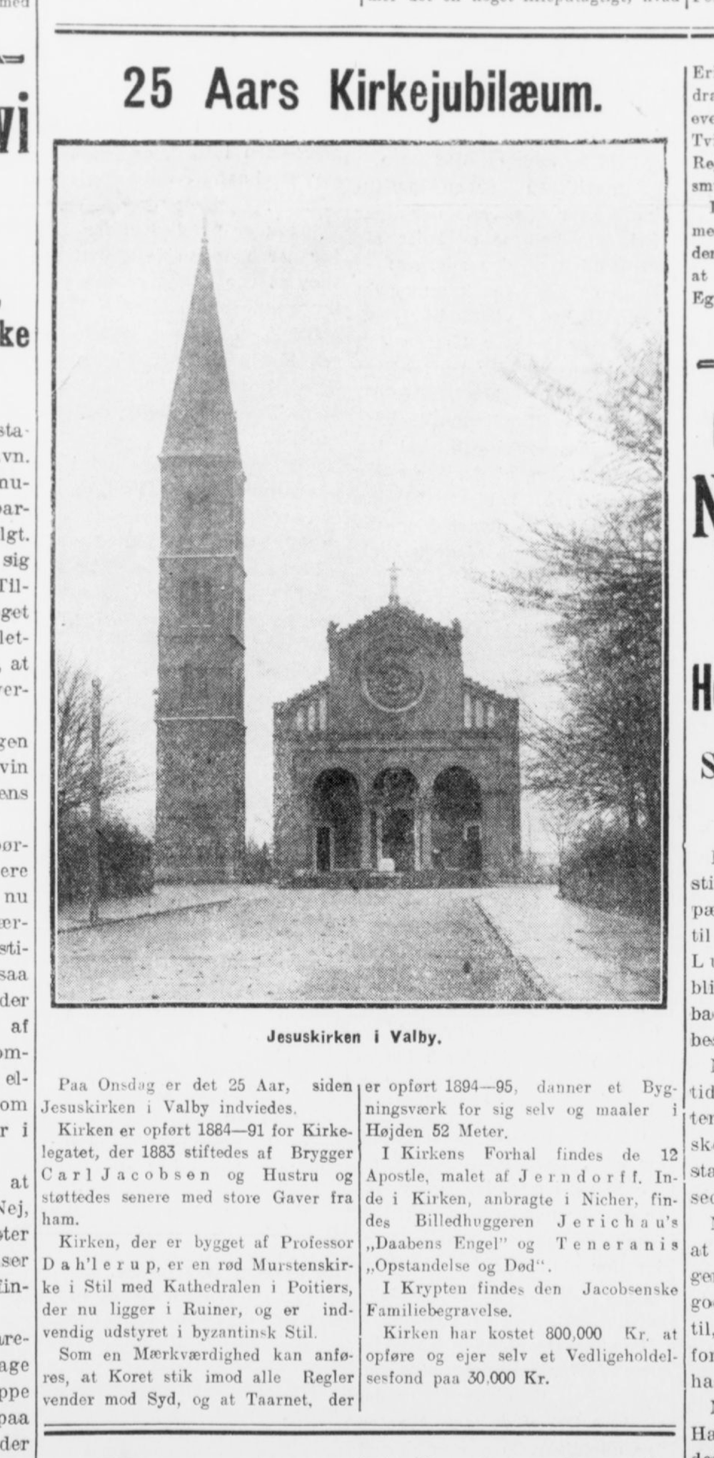 The cornerstone was laid in 1885, and Jesuskirken—finished without the tower—was dedicated in 1891. A testament to Jacobsen’s pull, the Crown Prince of Denmark, Minister of Culture, Minister of the Navy, and Minister of War all attended the dedication. With the campanile missing, the church was described as “incomplete” and “bald” when completed.