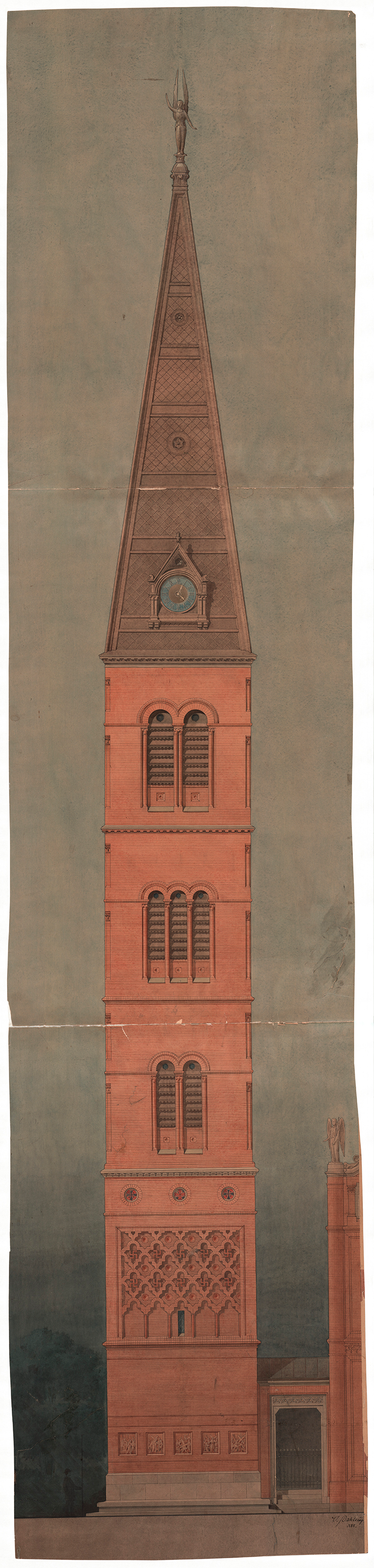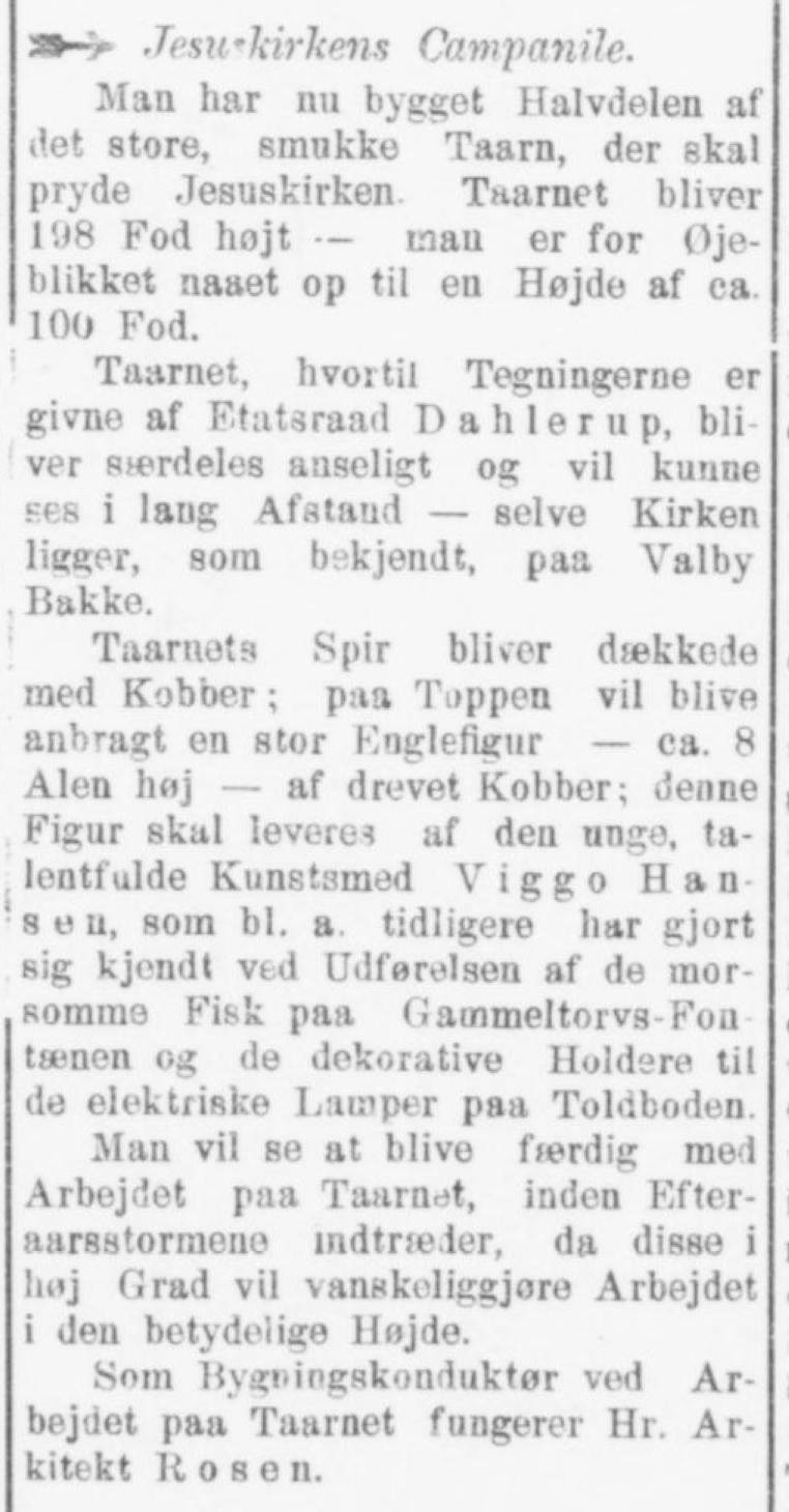 1889, construction update | 1891 dedication article | 1891 description article | Early 1890s photo, pre-campanile, Det Kgl. Bibliotek | Sketch pre-campanile, Det Kgl. Bibliotek | 1894 article on the construction of the campanile