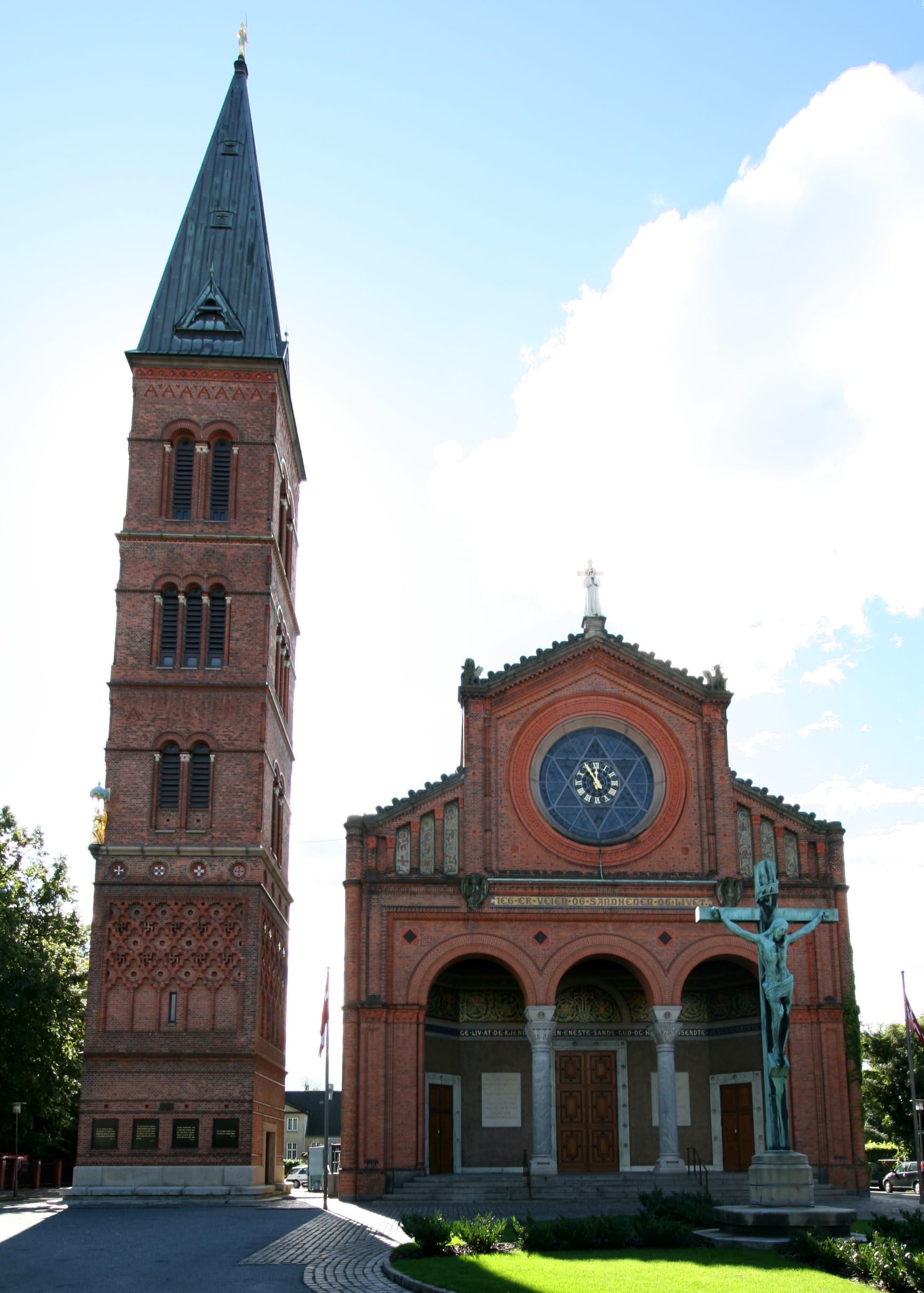 Jacobsen had strong ideas about what kind of church he wanted built, inspired by the Basilica of San Vitale and Notre-Dame-la-Grande in Poitiers (again, notice they’re Catholic churches), and hired his architect-of-choice to translate his ideas into something buildable. Trying to reconcile Jesuskirken as a monument to the Jacobsen family, as a functional parish church, and as implicit competition to Marmorkirken, the design process here swung from free-spending exuberance to thrifty retreat to luxurious compromise. You can see that dynamic in the brick and in the tower—initial plans specified munkesten, a bigger style of Danish brick from the Middle Ages, but pivoted to regular brick to cut costs, and the campanile wasn’t built at all first after the project greatly overran its budget.