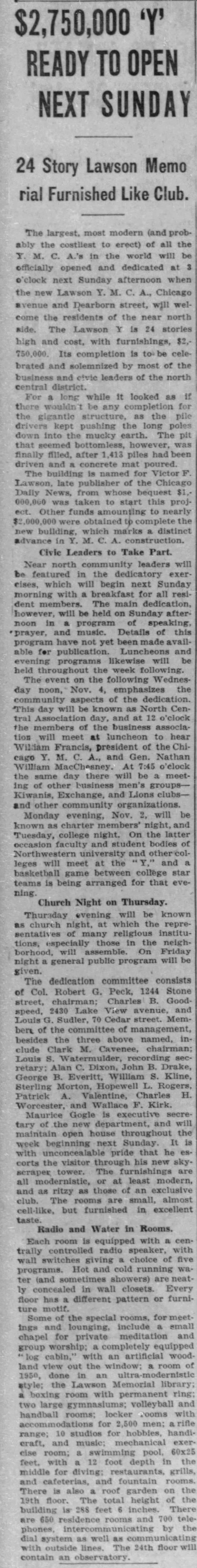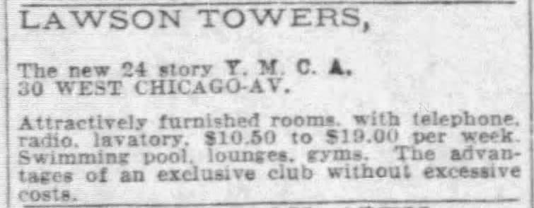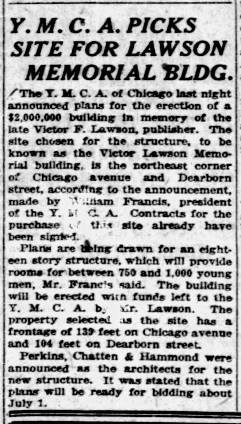 The Young Men's Christian Association grew rapidly across the US in the first decades of the 20th century, developing a vast infrastructure of housing, gyms, and education for Evangelical men. In Chicago, Chicago Daily News publisher Victor L. Lawson goosed that development with a $3.5m bequest when he died in 1925, a gift worth more than $60m in 2024 dollars. By 1927, a 900 room addition to the YMCA Hotel on Wabash had turned it into the second-largest hotel in town, but growth was so exuberant that only two year later the YMCA of Metropolitan Chicago made plans for a massive new hotel and administrative headquarters on Chicago Avenue–named for the benefactor whose bequest helped finance it.