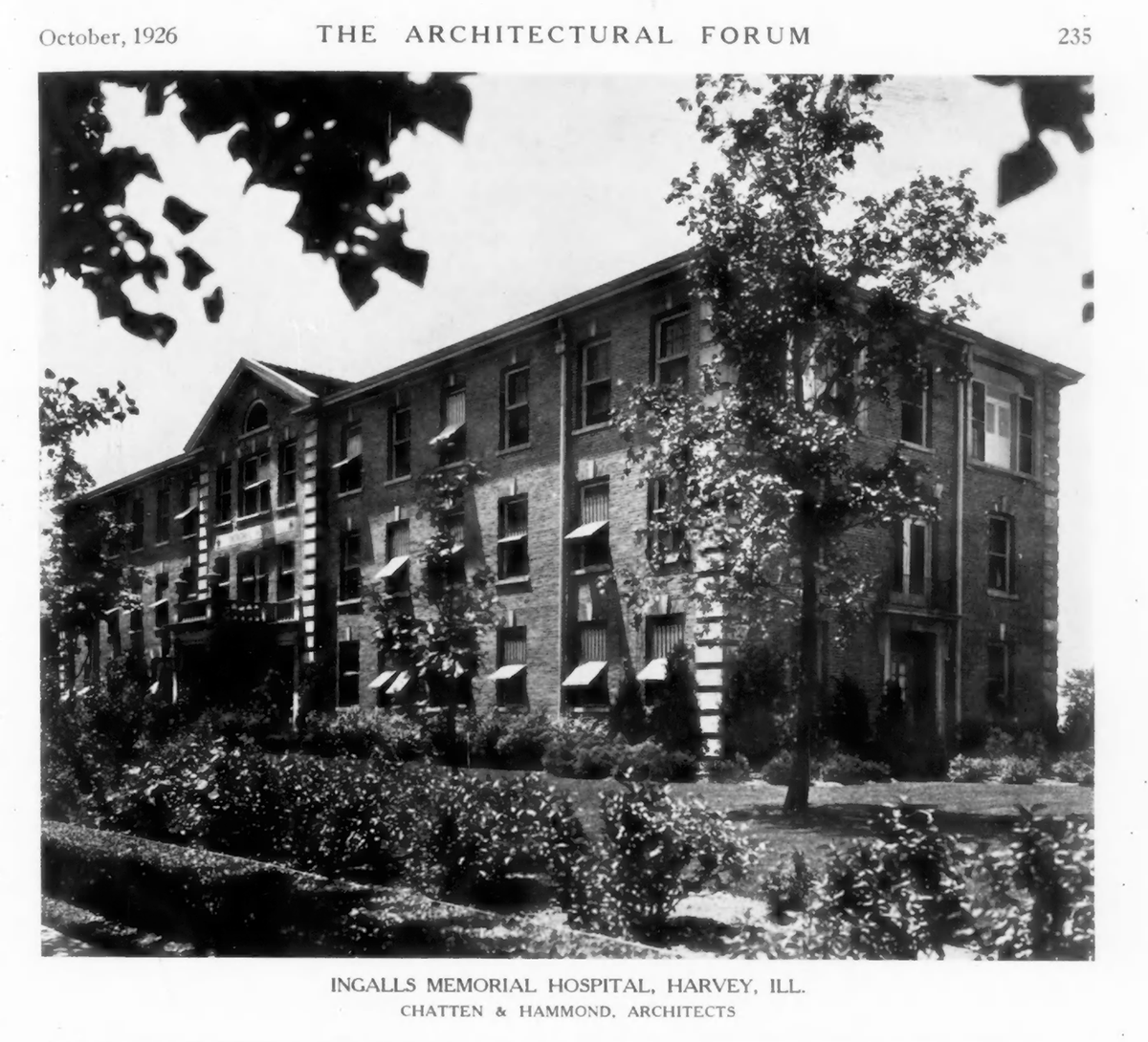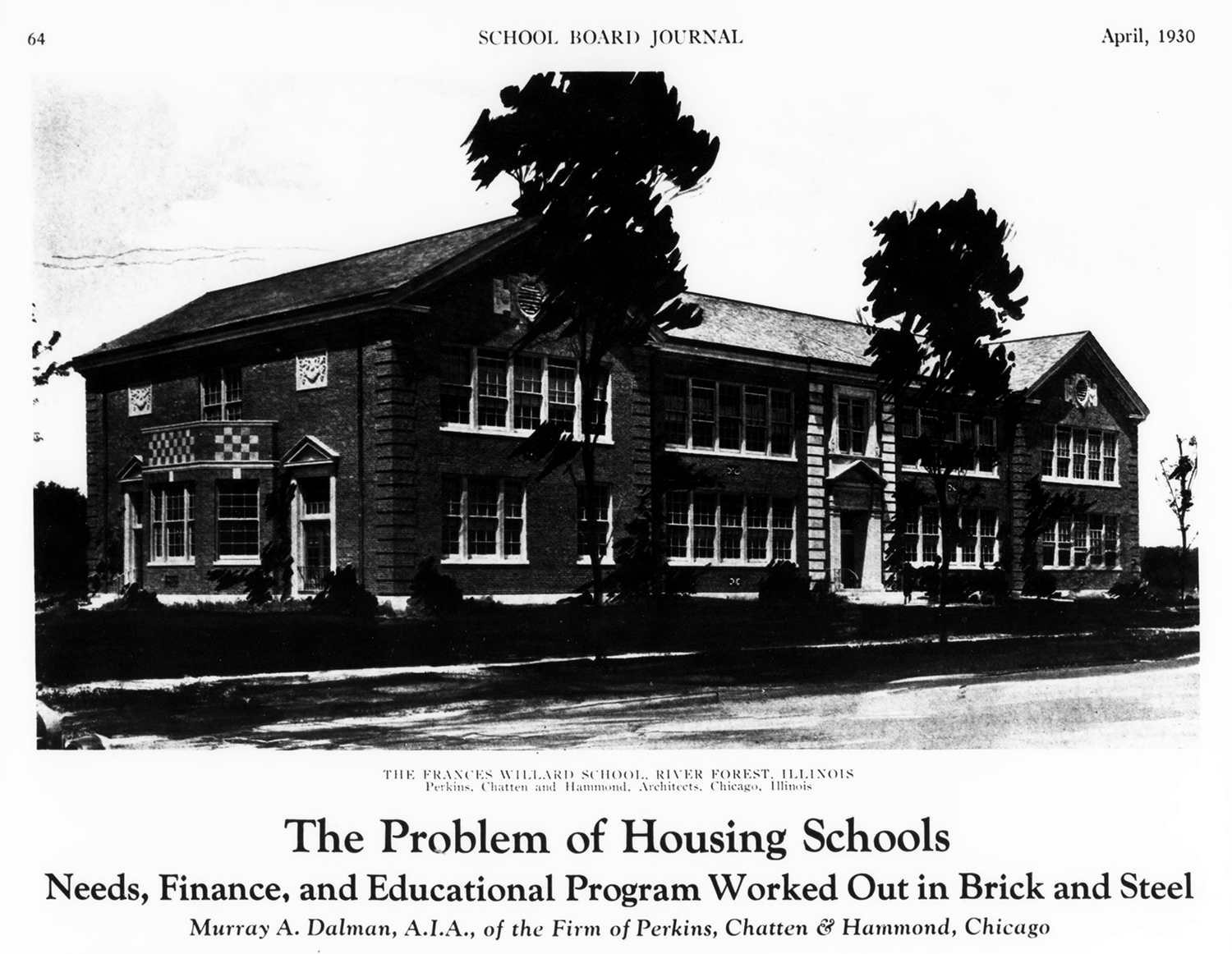 Frances Willard School in American School Board Journal, 1930, the Internet Archive | Armory and residence, 1934, Architecture | Ingalls Memorial Hospital in Harvey, 1926, Architectural Forum | Lincoln School in Park Ridge | Northwest Tower in Wicker Park