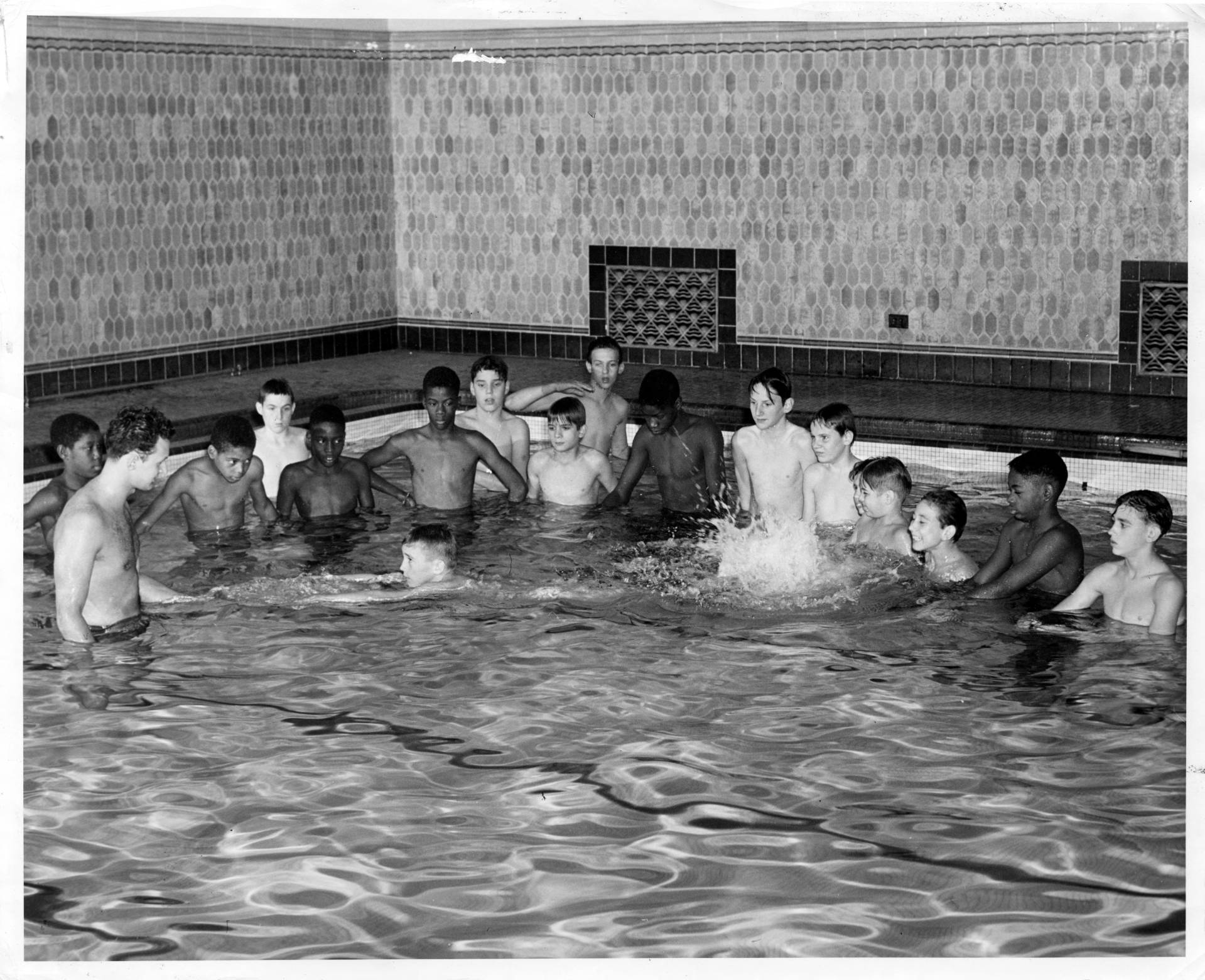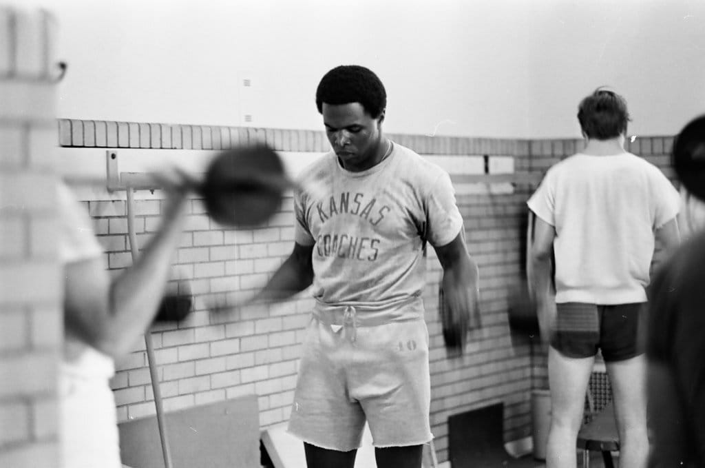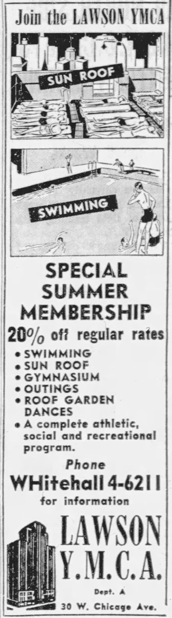 Swimming lessons, 1951, AG Falk, University of Minnesota | 1980 gym ad, Arch, Moody Bible School, the Internet Archive | Gale Sayers working out in the gym, Dave Fornell, ST-50000151-0027, Chicago Sun-Times collection, Chicago History Museum | 1955 gym ad, Chicago Tribune