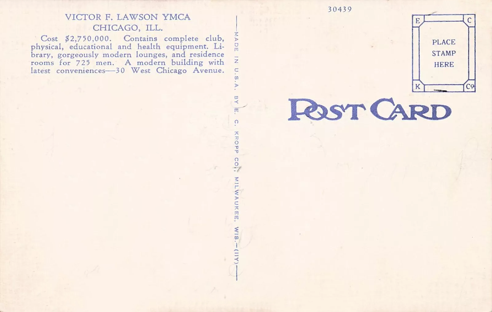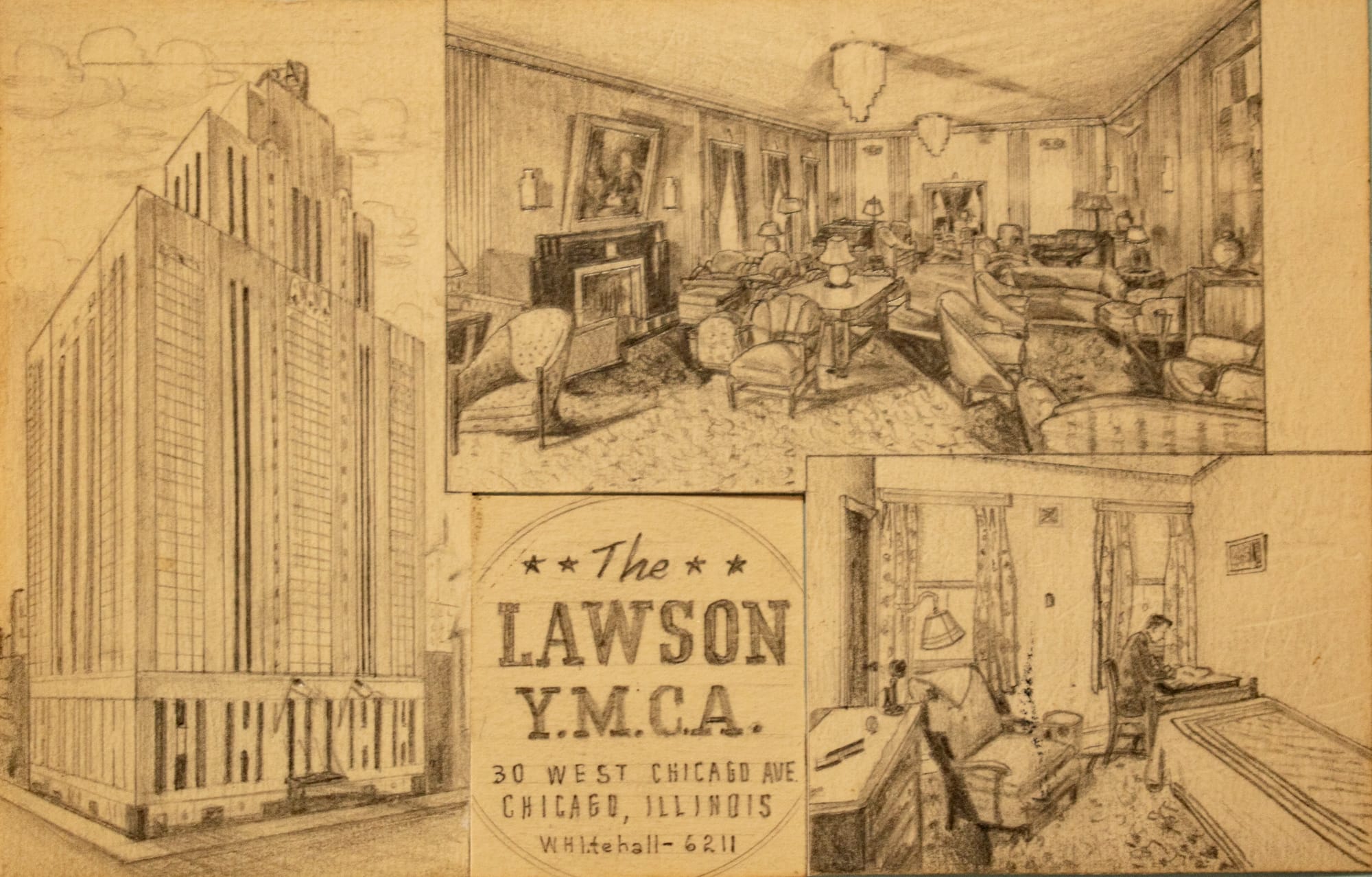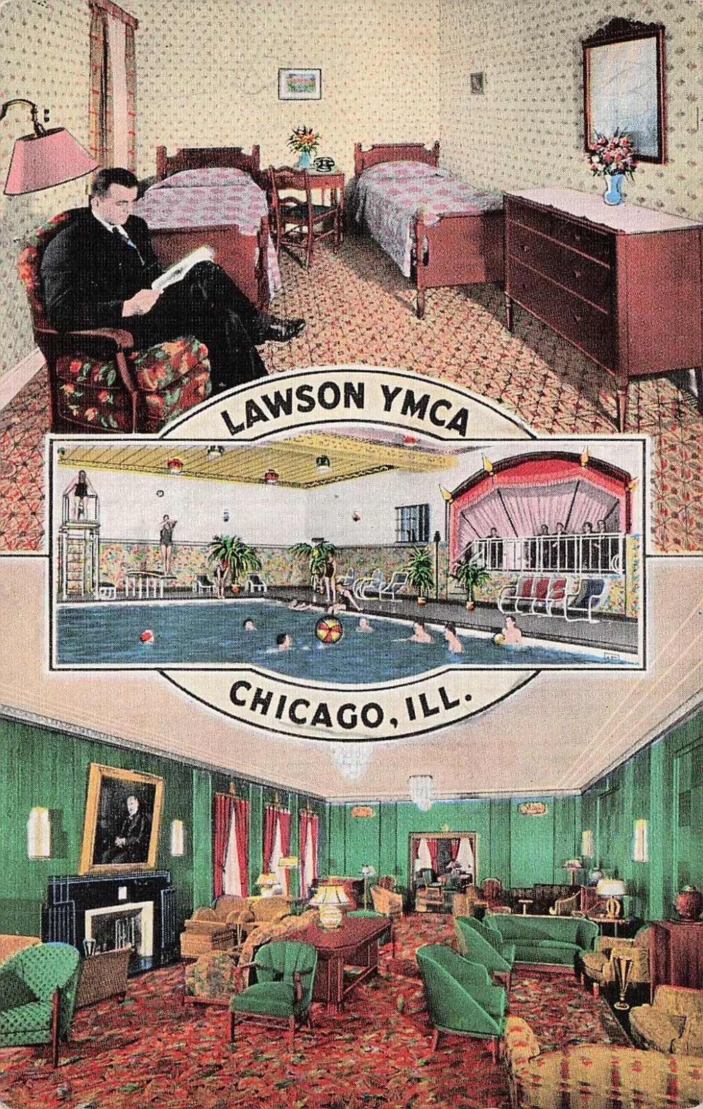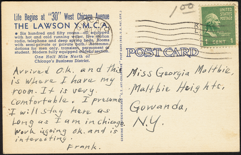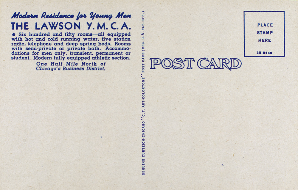 Postcard versos for various Lawson YMCA postcards, including one from the Cliff Smith YMCA Postcard Collection, Digital Commonwealth | 1942 production file, Curt Teich Postcard Archives, Newberry Library via the Internet Archive | Interior Postcard, Cliff Smith YMCA Postcard Collection, Digital Commonwealth | Aerial Postcard, Cliff Smith YMCA Postcard Collection, Digital Commonwealth | Postcard, Cliff Smith YMCA Postcard Collection, Digital Commonwealth