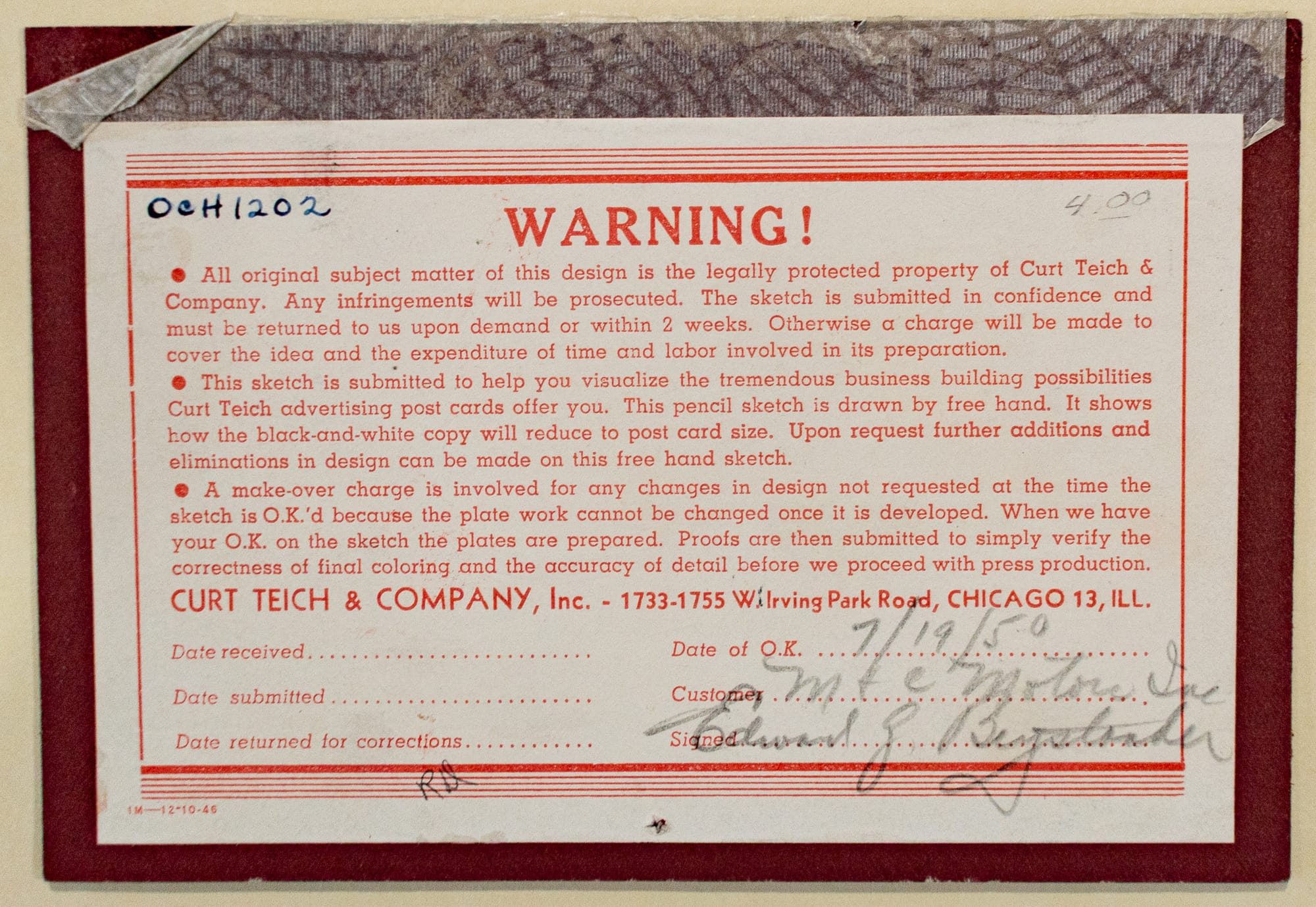 You also have some of the production progression from a retouched photo to a design sketch to print proofs, plus the text for the verso, then a production order buying 25,000 postcards.