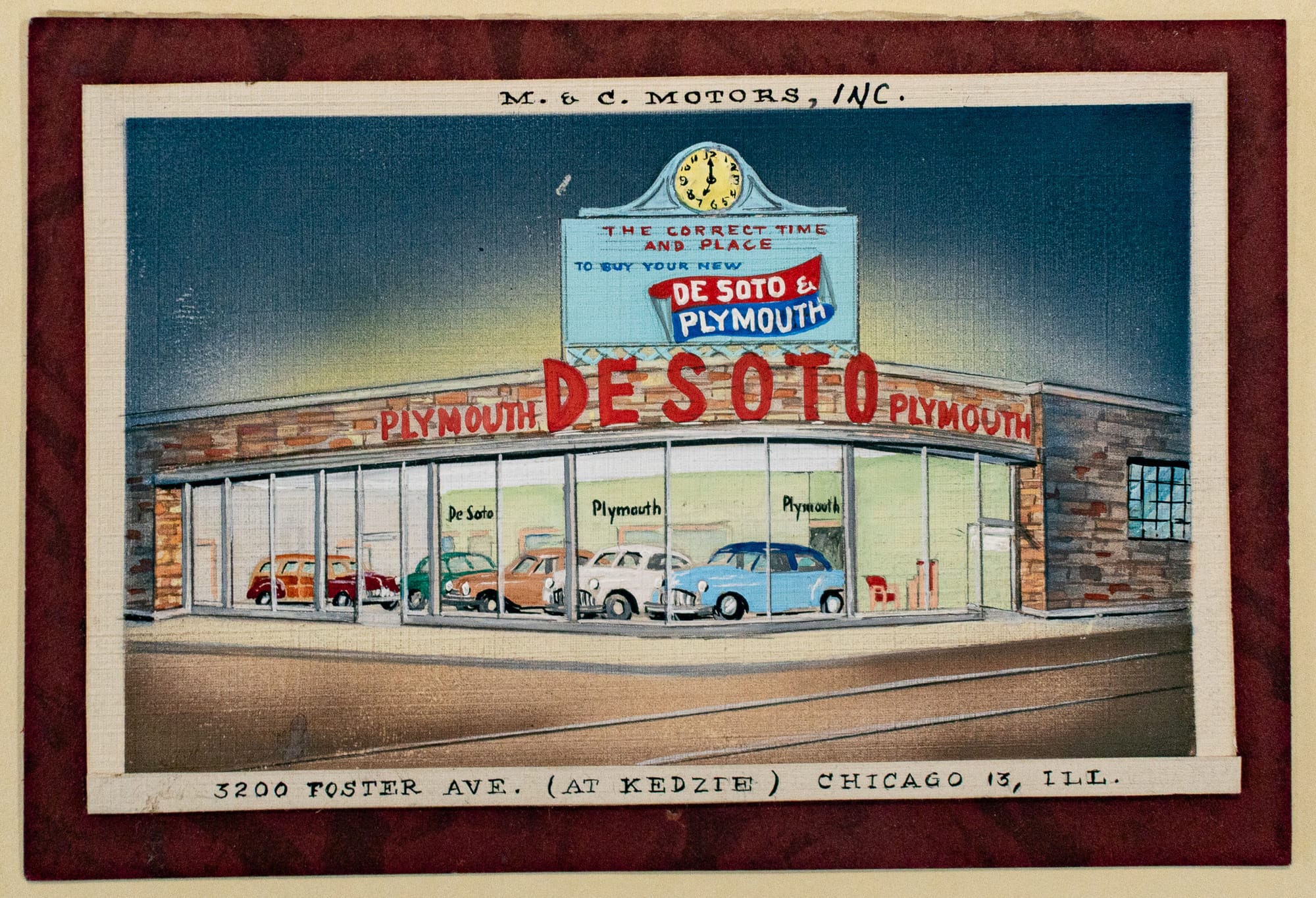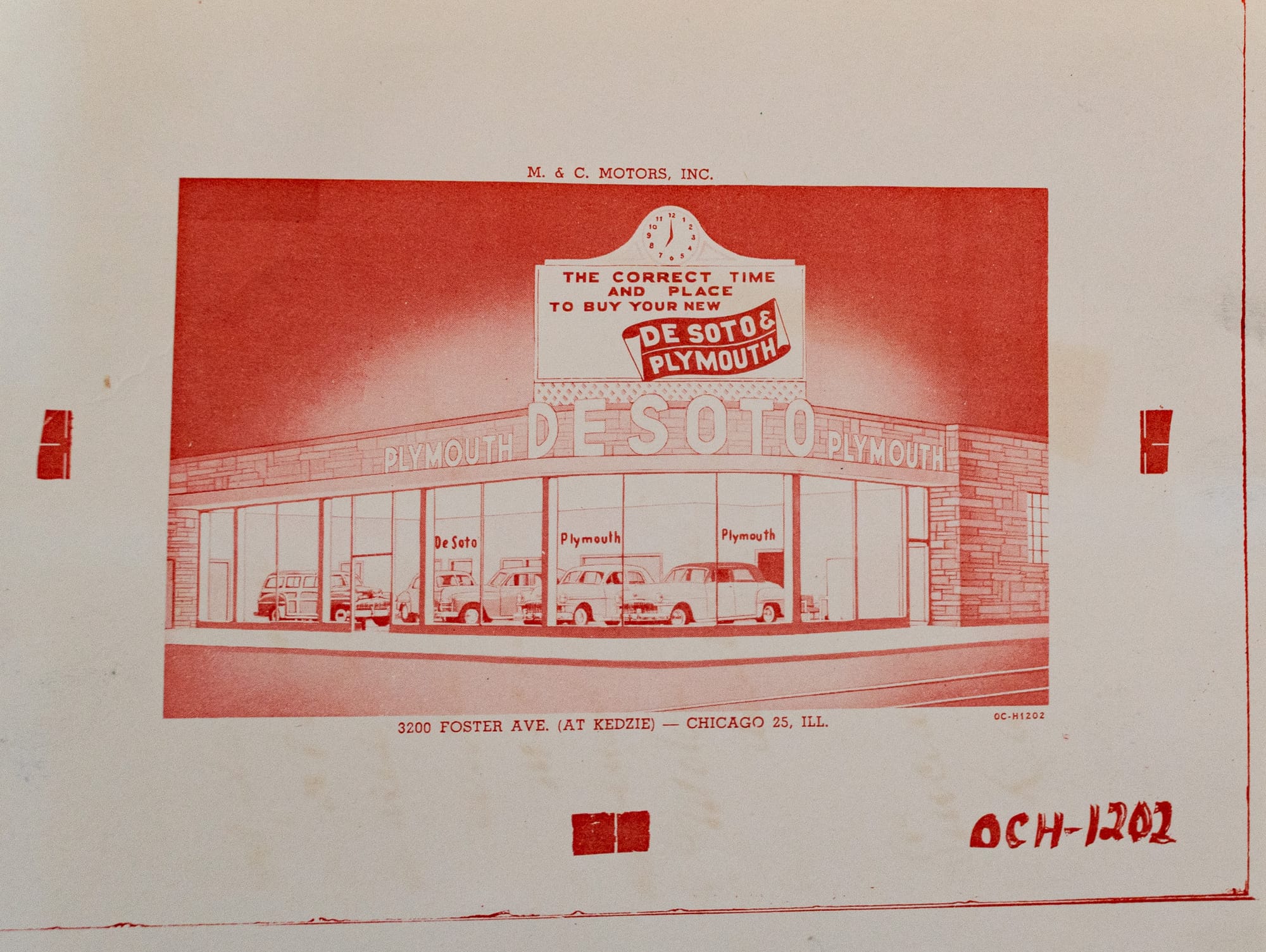 Established in the late 1930s, M&C Motors spent most of the 1940s down the block at 5129 N. Kedzie before moving here, at the intersection of Kedzie and Foster, in 1949. The dealership sold two Chrysler marques, with Plymouth Chrysler’s entry-level brand and DeSoto a midrange brand initially conceived to compete with Pontiac, Studebaker, Dodge, etc. The DeSoto brand became redundant almost immediately when–only months after launching the division–Chrysler went ahead and acquired Dodge. With too much overlap between Chrysler’s five brands–Plymouth, Dodge, DeSoto, Chrysler and Imperial–the company discontinued the DeSoto line in 1961. By that point M&C Motors had moved to Oak Park anyway, where the company survived into the early 2000s.