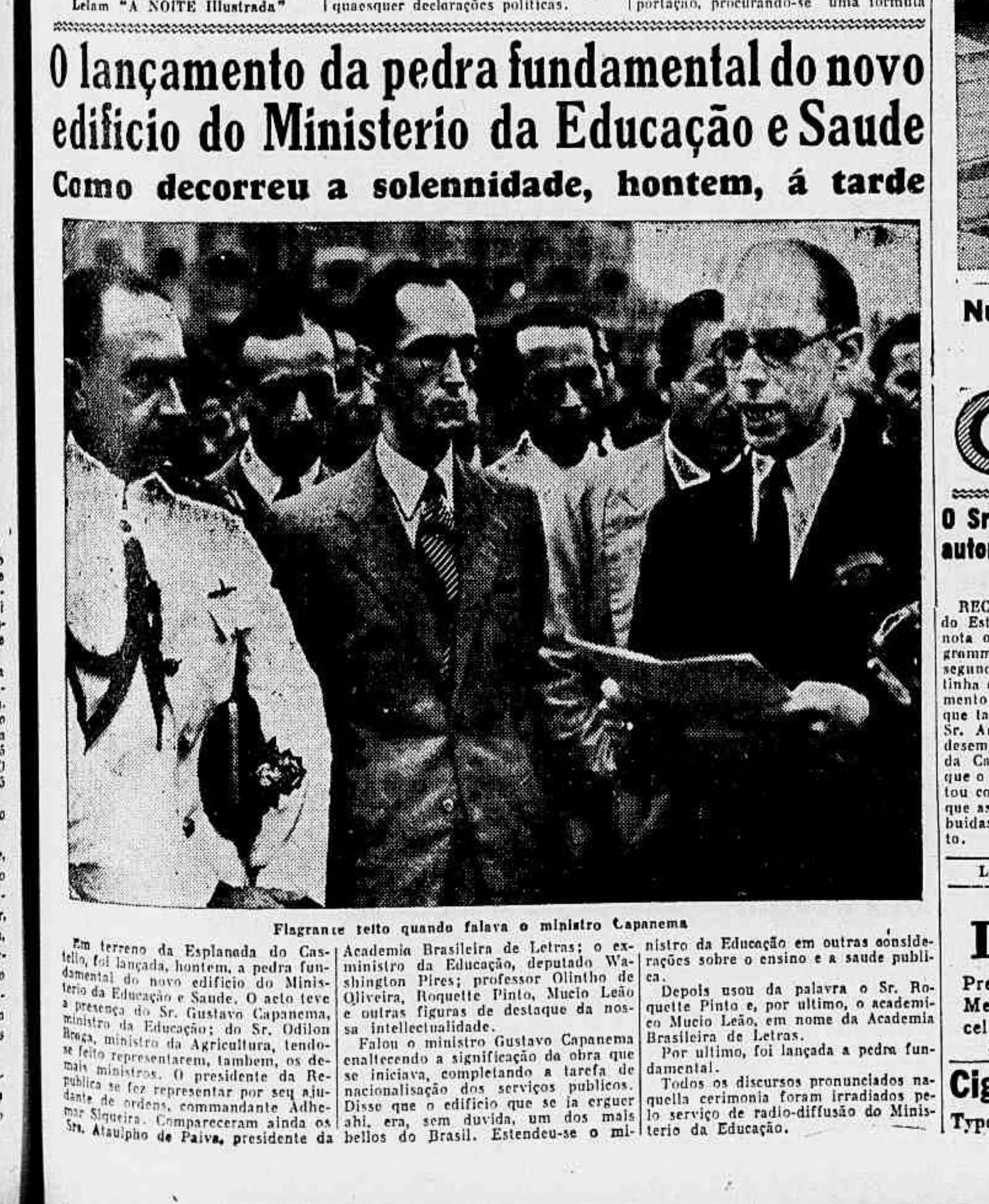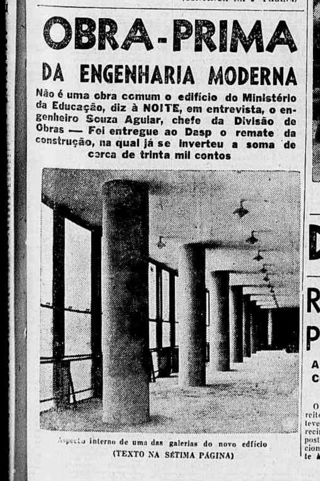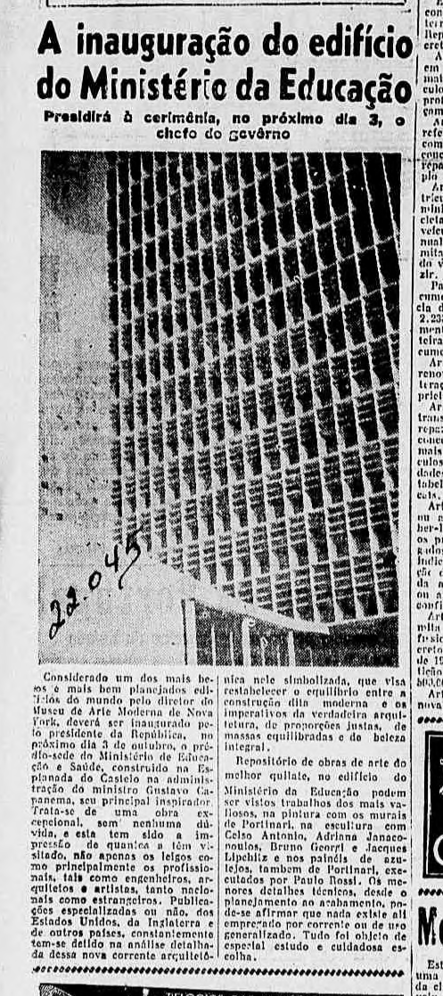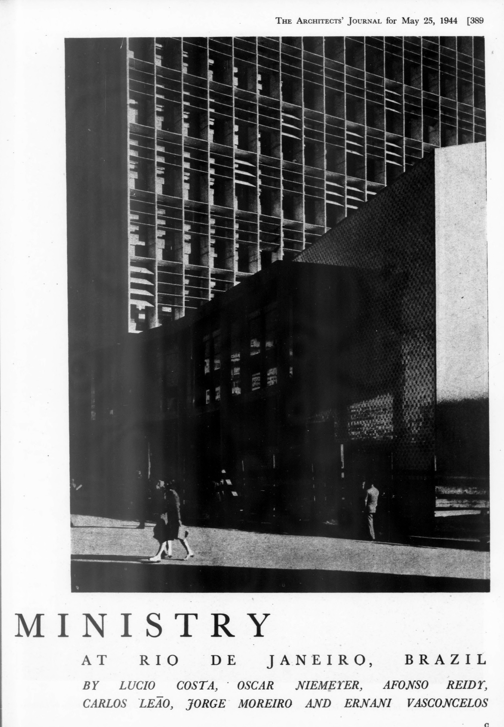 1936 O Jornal article, "Big Architect to Rio", the Internet Archive | 1937, cornerstone laying, the Internet Archive | Diagrams and sketches, 1944, The Architectural Review, the Internet Archive | 1944, "Brazil Outstrips US in Modern Architecture" | 1943, finishing up, A Noite, the Internet Archive | 1945, Inaugurated, the Internet Archive | 1944, the Architects' Journal, the Internet Archive