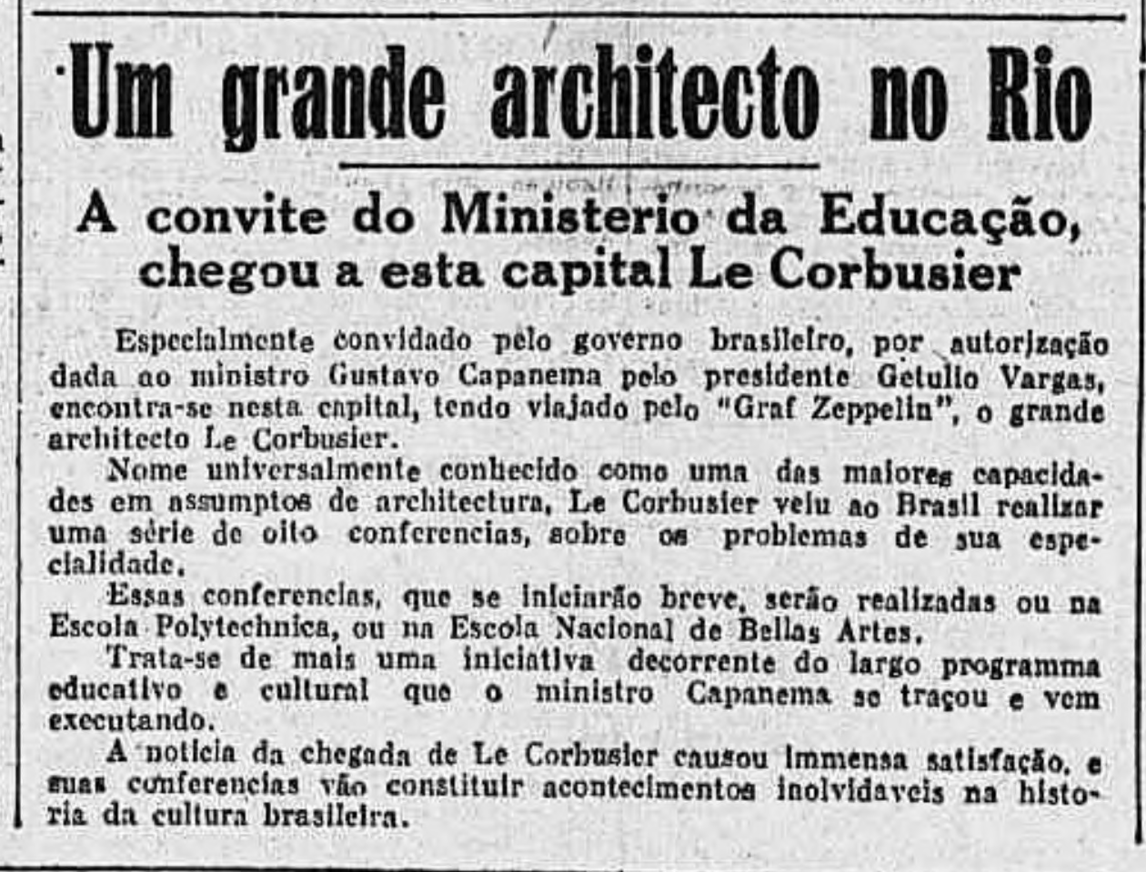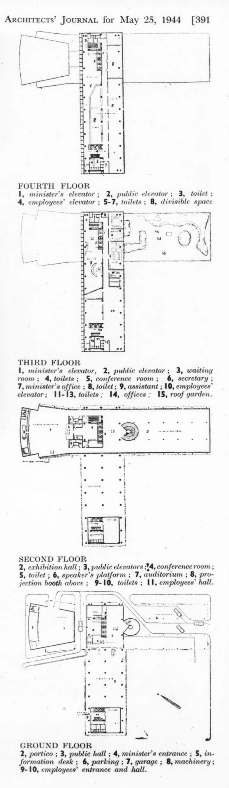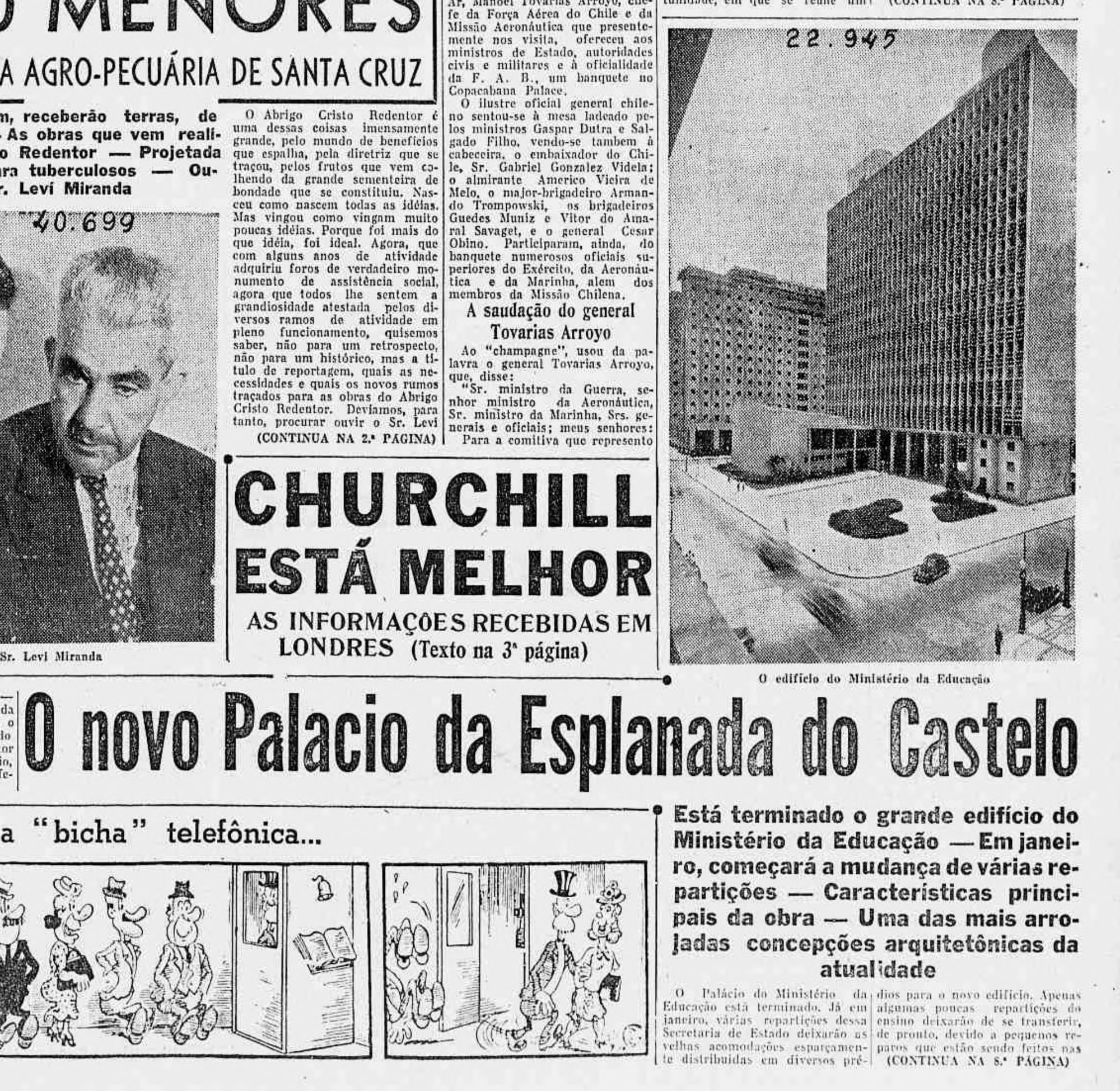 1936 O Jornal article, "Big Architect to Rio", the Internet Archive | 1937, cornerstone laying, the Internet Archive | Diagrams and sketches, 1944, The Architectural Review, the Internet Archive | 1944, "Brazil Outstrips US in Modern Architecture" | 1943, finishing up, A Noite, the Internet Archive | 1945, Inaugurated, the Internet Archive | 1944, the Architects' Journal, the Internet Archive