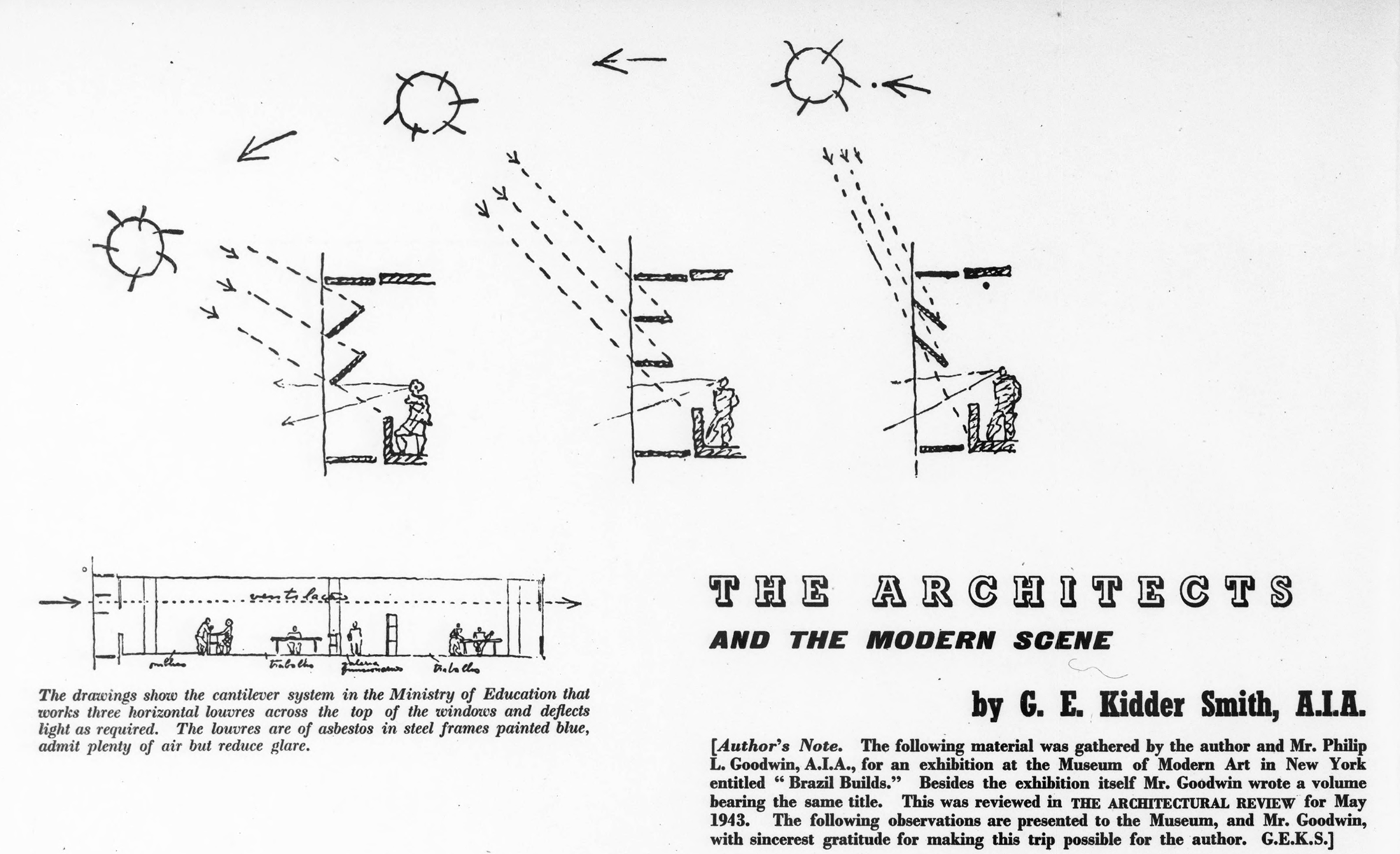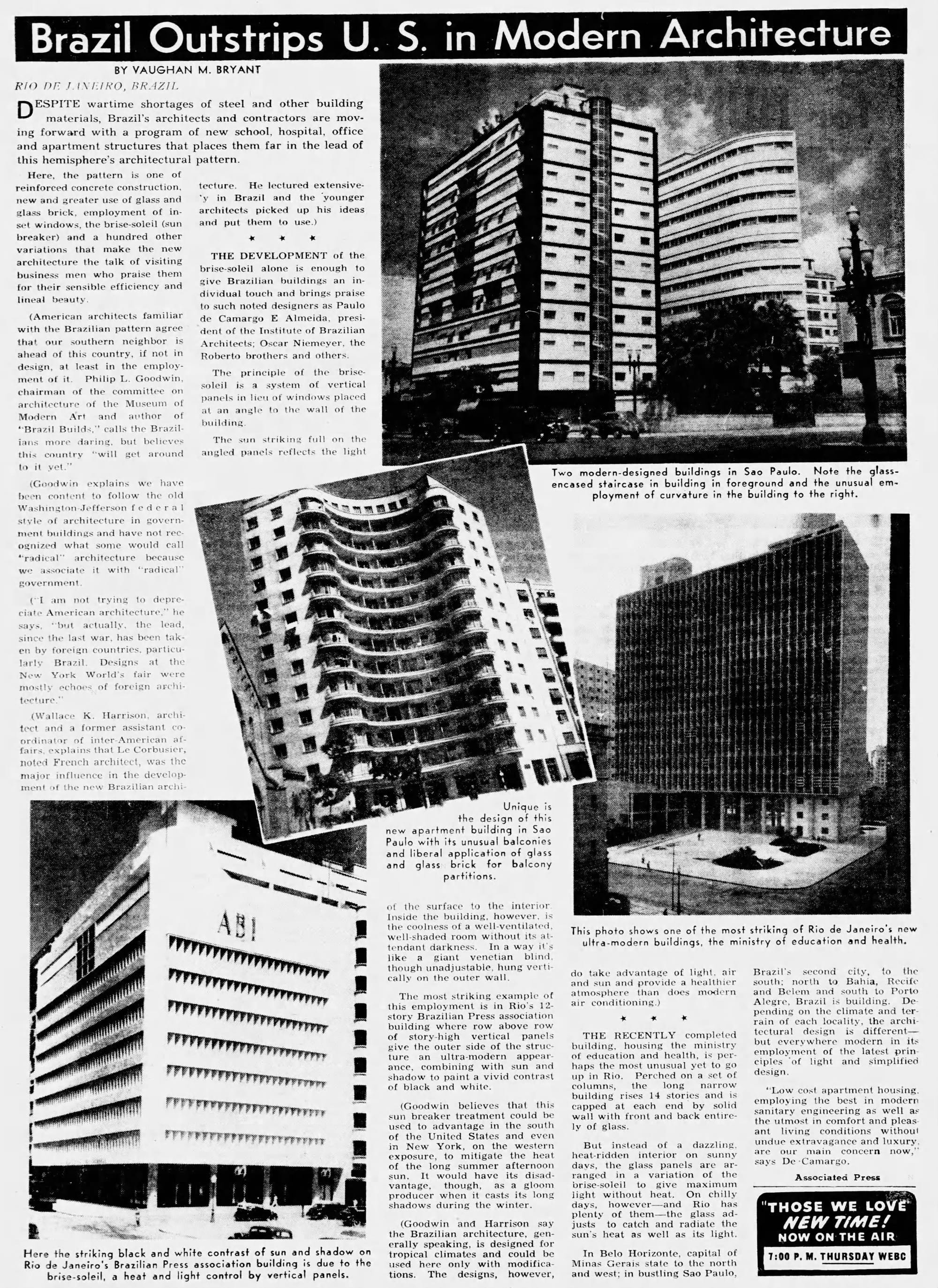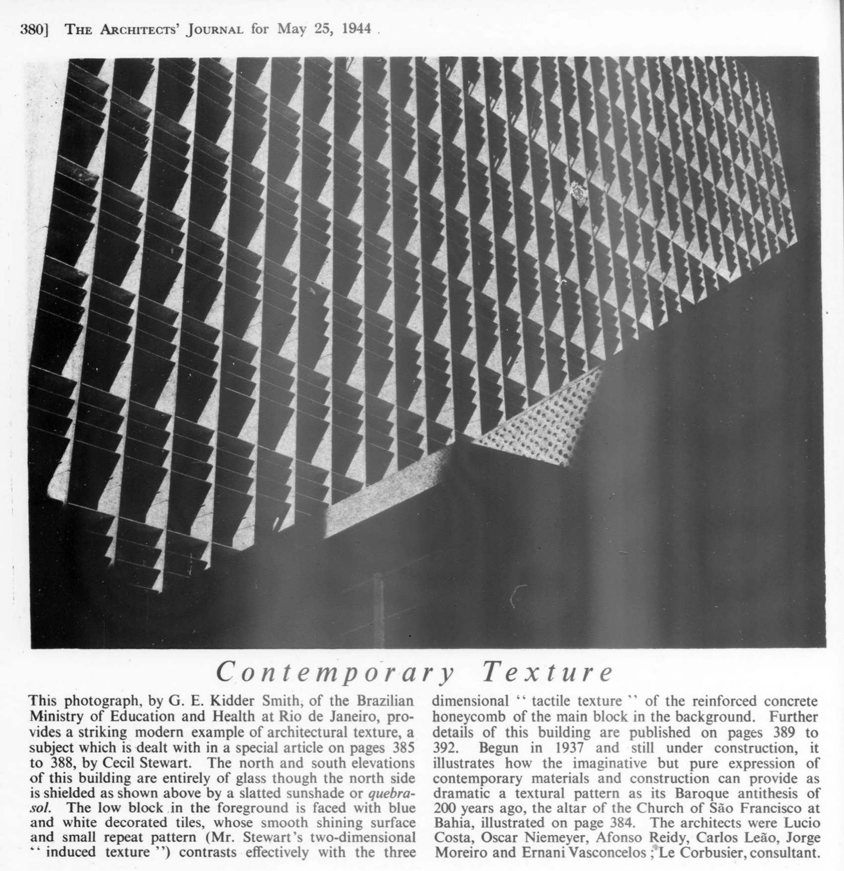 In the Architects' Journal, 1944, the Internet Archive | On the cover of Modern Architecture in Brazil, 1956 | 1953 photos from the Leonard Currie Slide Collection, Virginia Tech Libraries