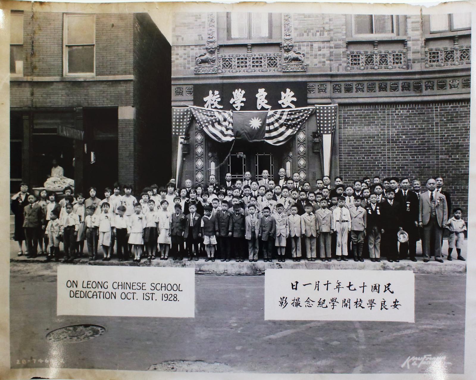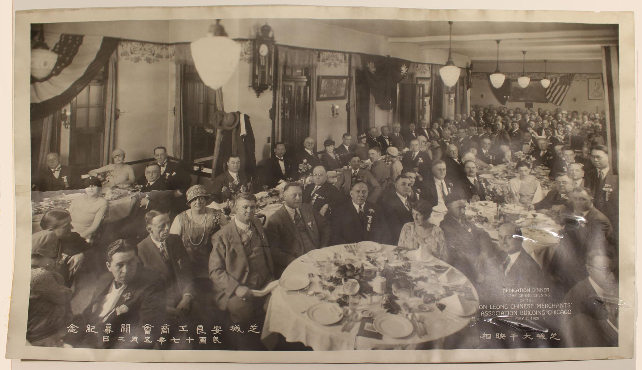 1920s photo of the old On Leong building on 22nd Street, Chinese American Museum of Chicago, via Chicago Collections | 1926-1927 articles on the widening of 22nd St and the planning and construction of the new On Leong building | 1928 postcard, "A Night View of the Grand Opening of the On Leong Association, Chicago", the Chinese American Museum of Chicago via Chicago Collections | 1928 Kaufmann and Fabry photo of the building, UIC Library via Chicago Collections | dedication dinner at the grand opening in 1928, Chinese American Museum of Chicago via Chicago Collections | On Leong Chinese school dedication in 1928, Chinese American Museum of Chicago via Chicago Collections