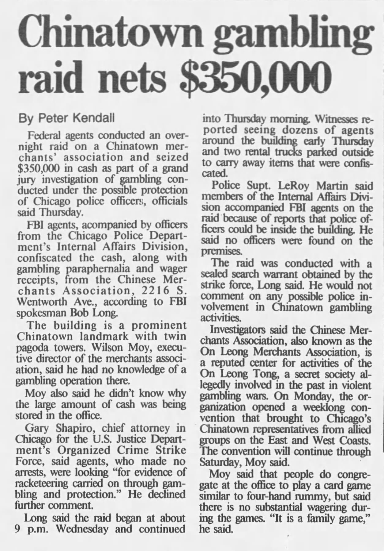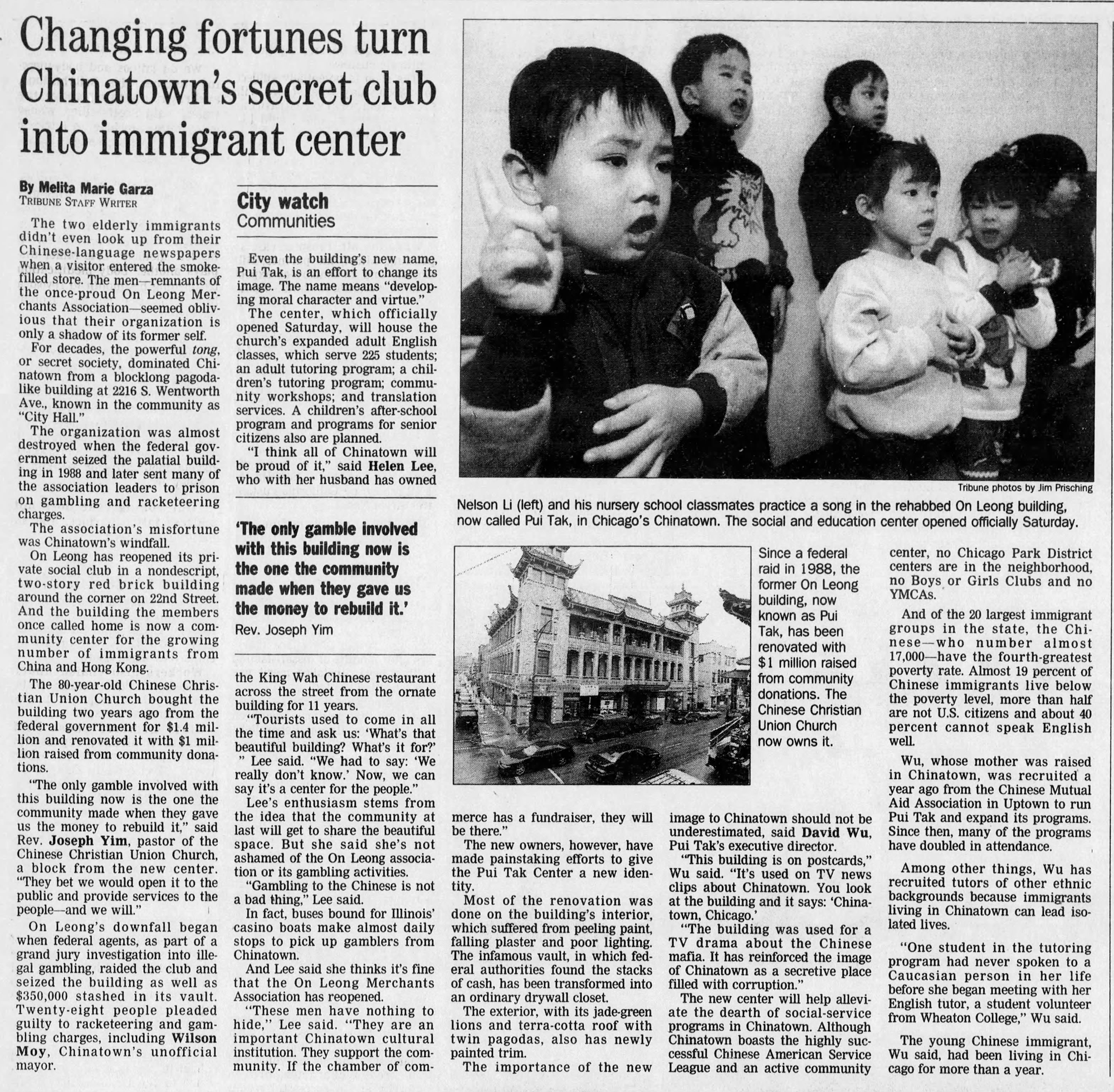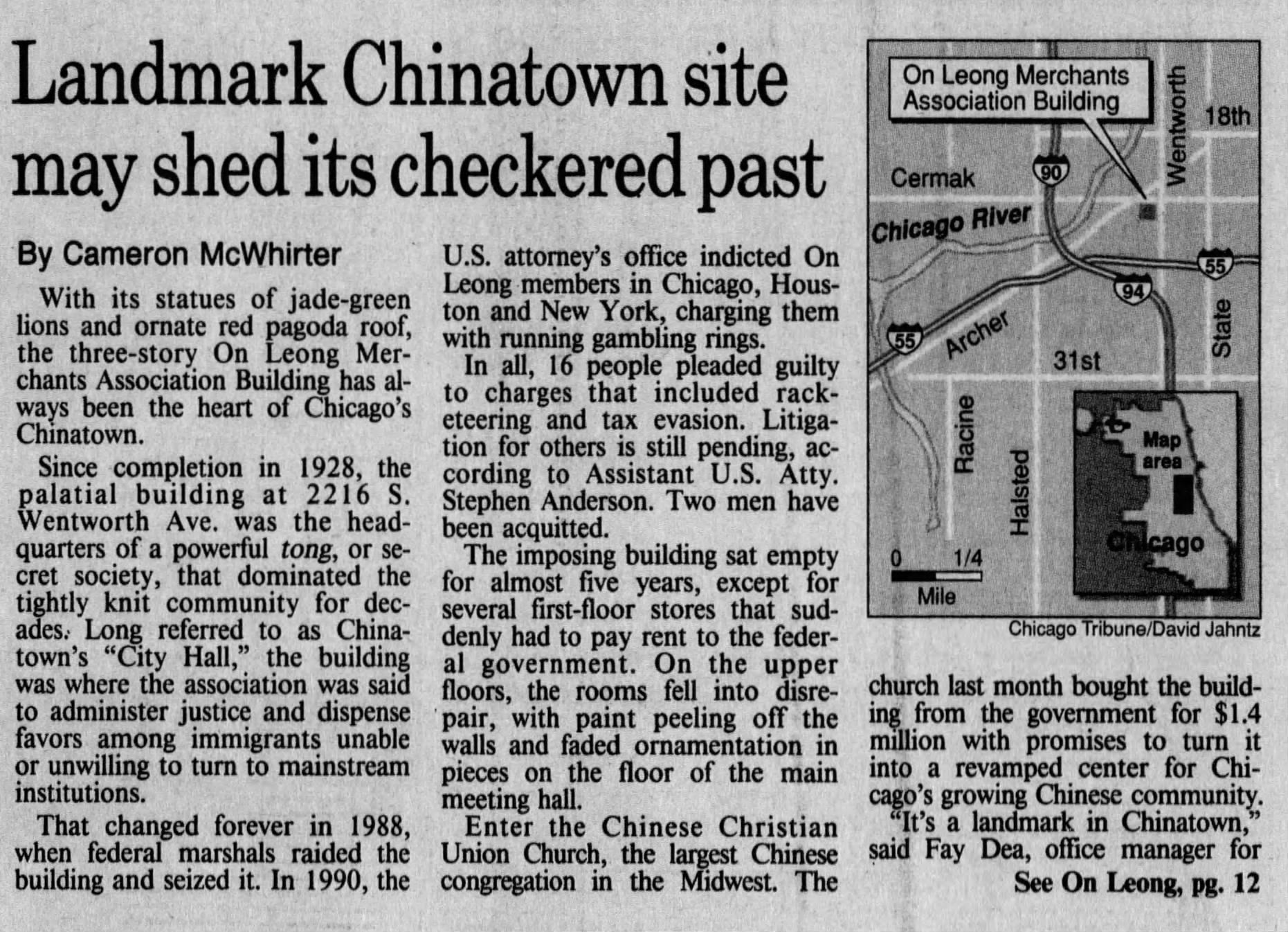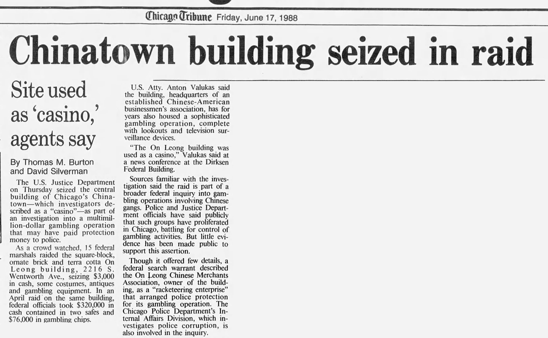1958 photo of the 54th National Convention of On Leong Chinese Merchants Association, Chinese American Museum of Chicago via Chicago Collections | seen in the 1962 Double Ten parade, Chinese American Museum of Chicago via Chicago Collections | 1977 Jonas Dovydenas photo, Chicago Ethnic Arts Project collection, Library of Congress | two undated photos from the Illinois State Historic Preservation Office, HARGIS | two 1988 articles about the seizure of the building after a gambling raid | 1993 and 1995 articles about the newly-opened Pui Tak Center in the building