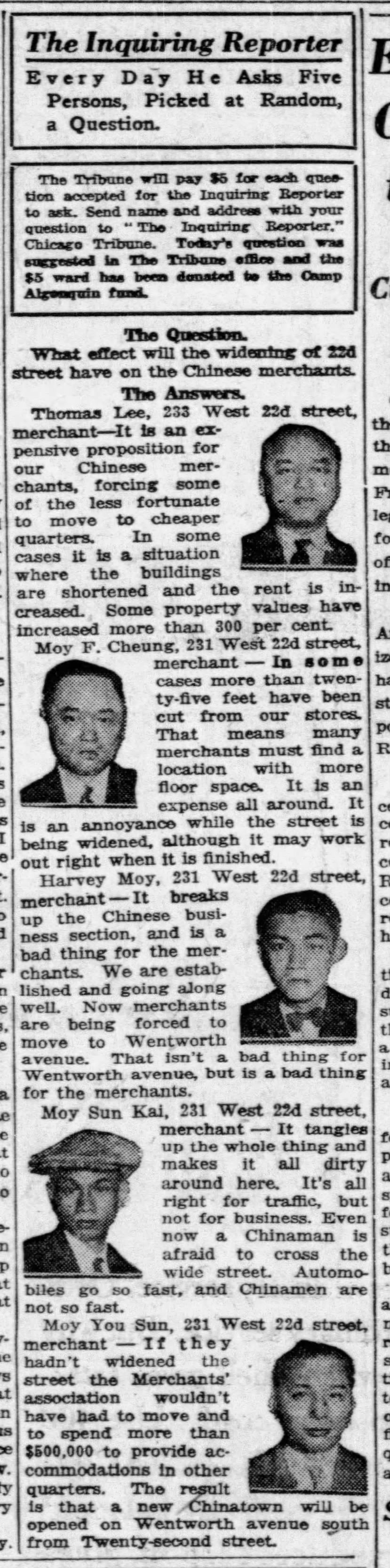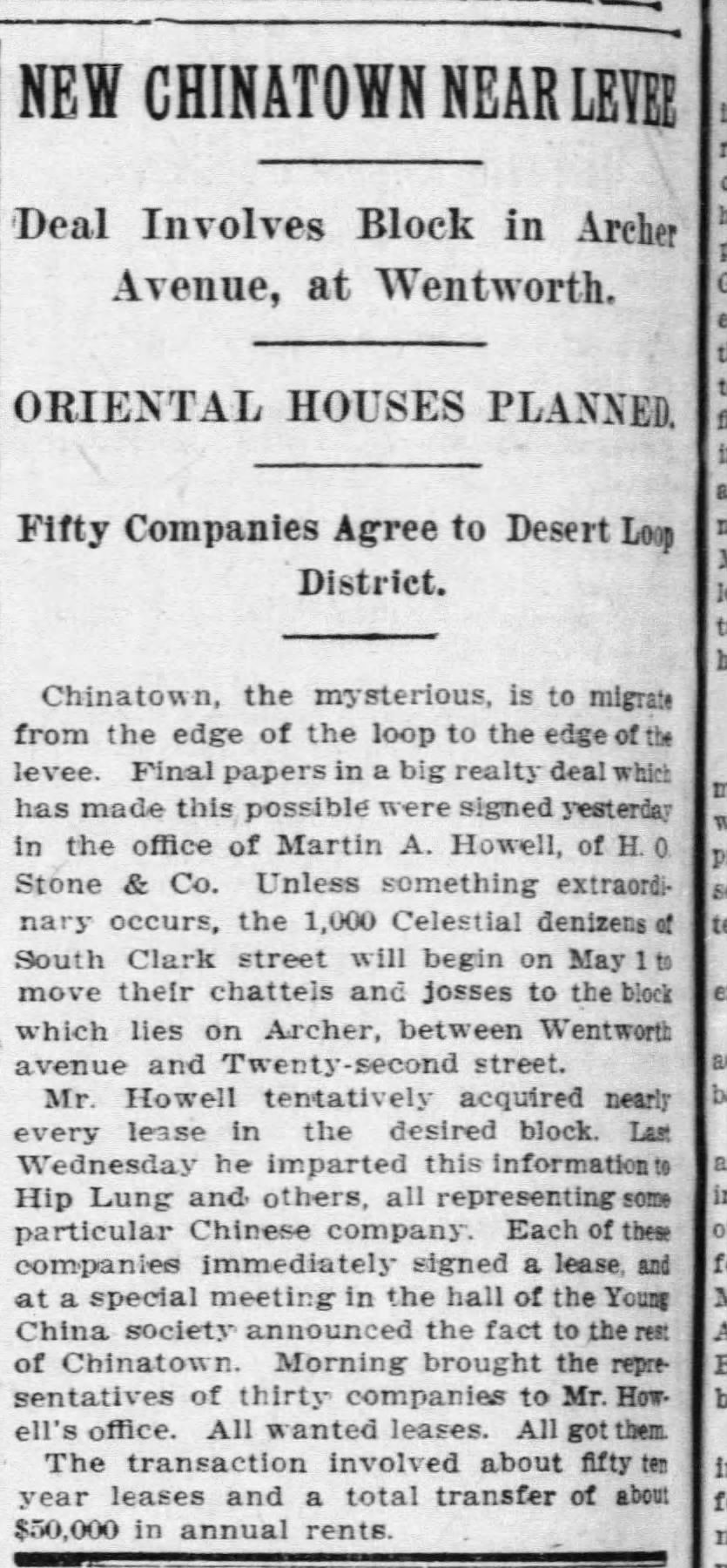 Two 1912 articles about Chinatown moving from Clark Street south to Wentworth and 22nd