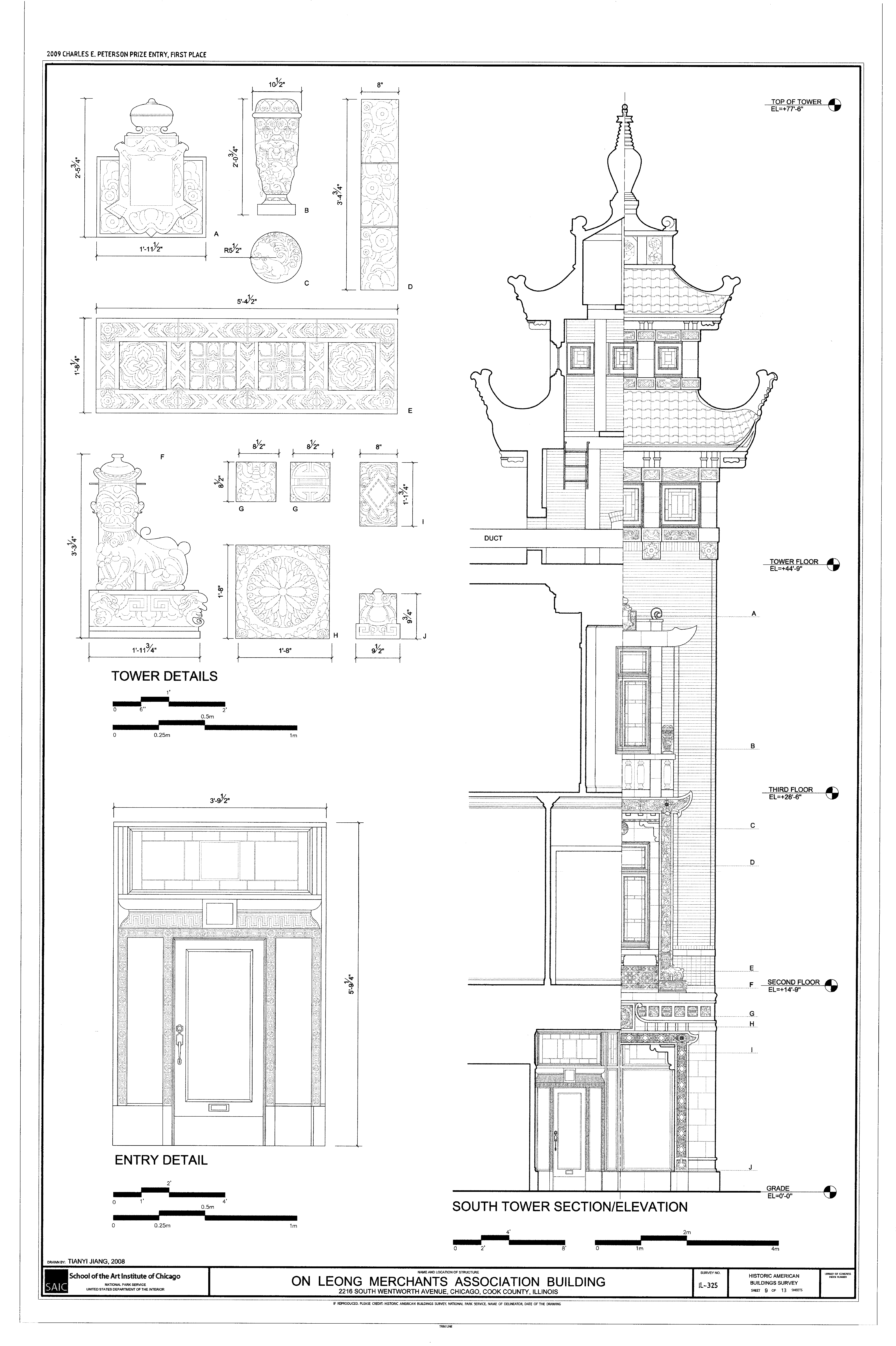 In 2009 students from the School of the Art Institute of Chicago Historic Preservation Department won the Charles E. Peterson Prize for measured drawings for the Historic American Buildings Survey for their work on these drawings of the On Leong building, Library of Congress