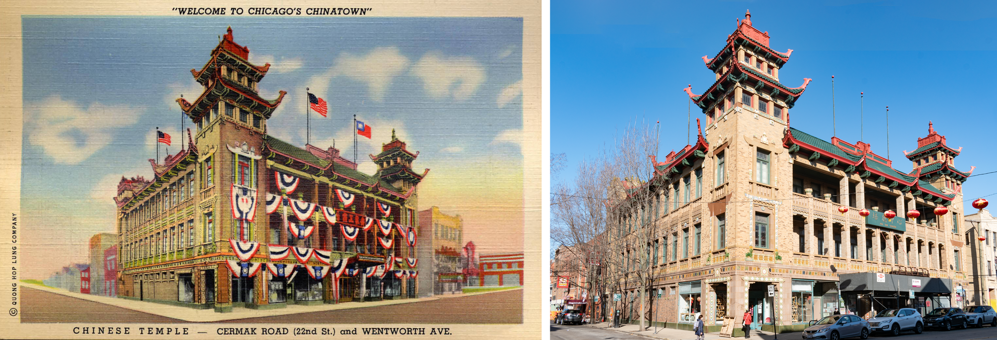 Basically a traditional Chicago union hall with a Chinese-inspired skin based on photos from a German architect's book and designed by Norwegian-American architects, Chinatown’s landmark On Leong Merchants Association Building is a quirky western reinterpretation of Chinese architectural forms. Discriminatory laws meant there were no Chinese architects licensed in Illinois when the tong needed to build itself a new home, but architects Christian Michaelsen & Sigurd Rognstad had designed On Leong director Jim Moy’s Peacock Inn restaurant in Uptown. So...good enough.