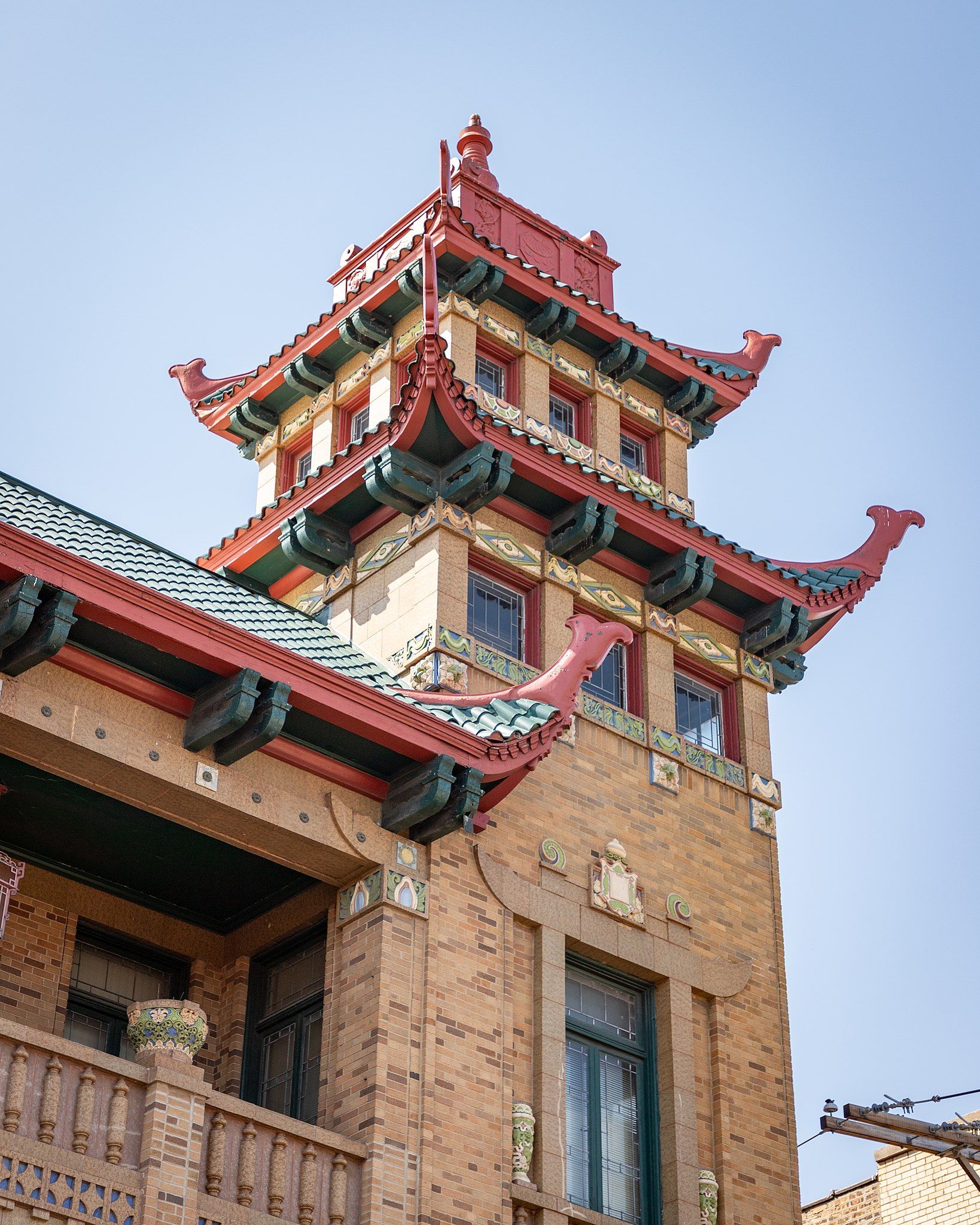 Lacking familiarity with Chinese culture, Michaelsen & Rognstad turned to German architect Ernst Boerschmann’s book Chinesische Architekture for inspiration. Predictably, as the Chinese American Museum of Chicago put it, "none of the motifs are truly Chinese — they were designed by a creative European-American who had seen very little real Chinese art or architecture". That's not really a criticism—it's a raucous example of early 20th century syncretic American design—but while the colorful grandeur of the building helped launch Michaelsen & Rognstad's career, it took decades for Asian architects in the US to overcome the racist barriers that boxed them out of the industry.