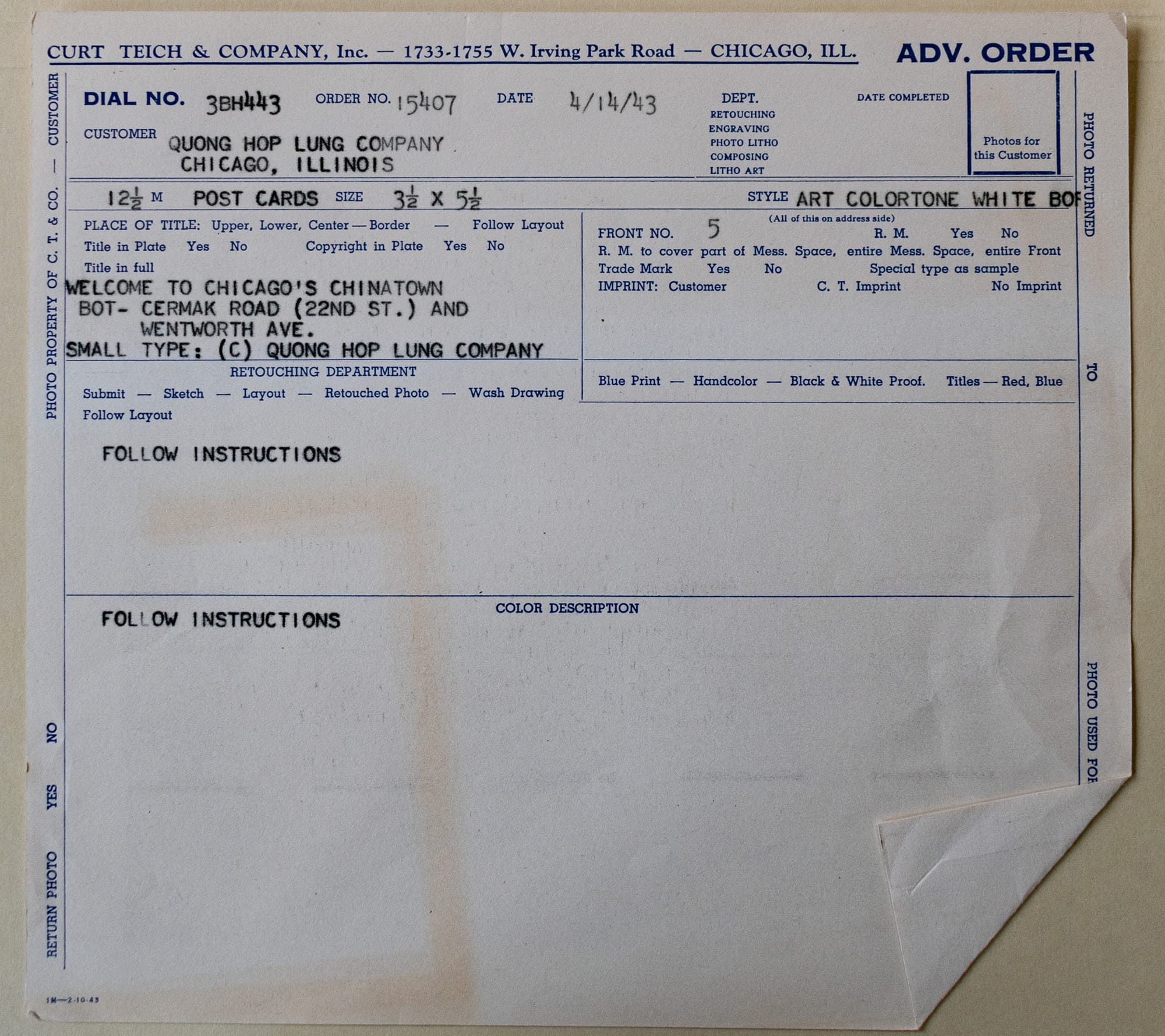 Interesting stuff in the production file in the Curt Teich Postcard Archive at the Newberry Library. A photo negative, the photo that was used to create the postcard, and a copyrighted photo that was emphatically not used for the postcard, but was included as a reference for what the flags and the entrance marquee should look like, as laid out in the instructions to the Curt Teich Order Department from the Advertising Sales Division. Also worth noting that Quong Hop Lung Co., the customer, paid the extra $2.00 to have their postcard copyrighted (equivalent to $40 in 2026).