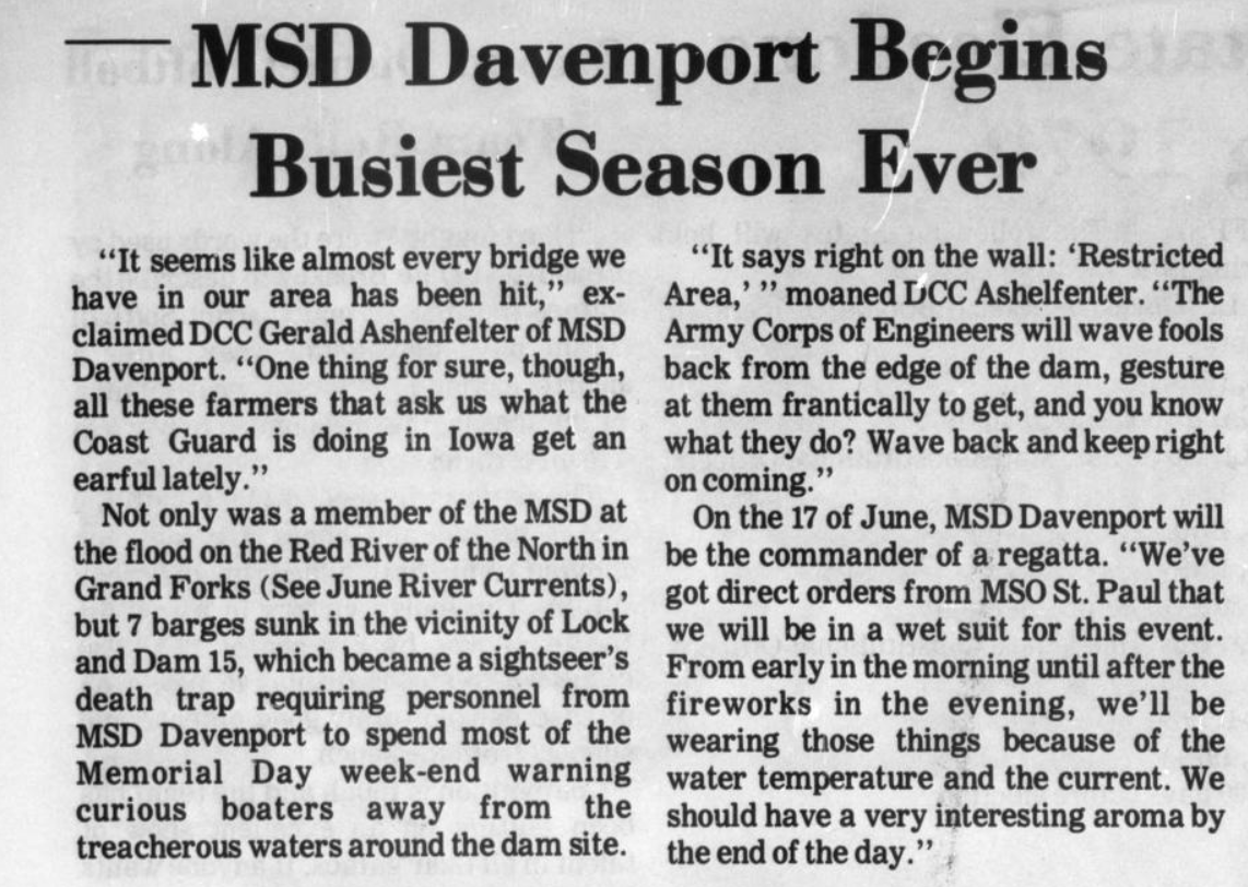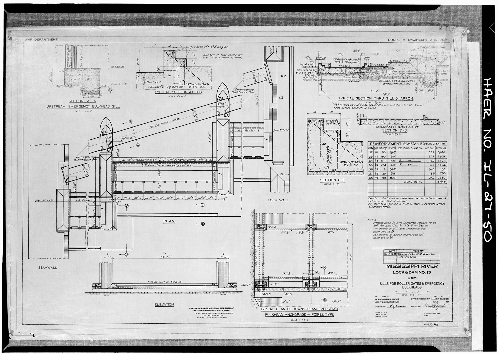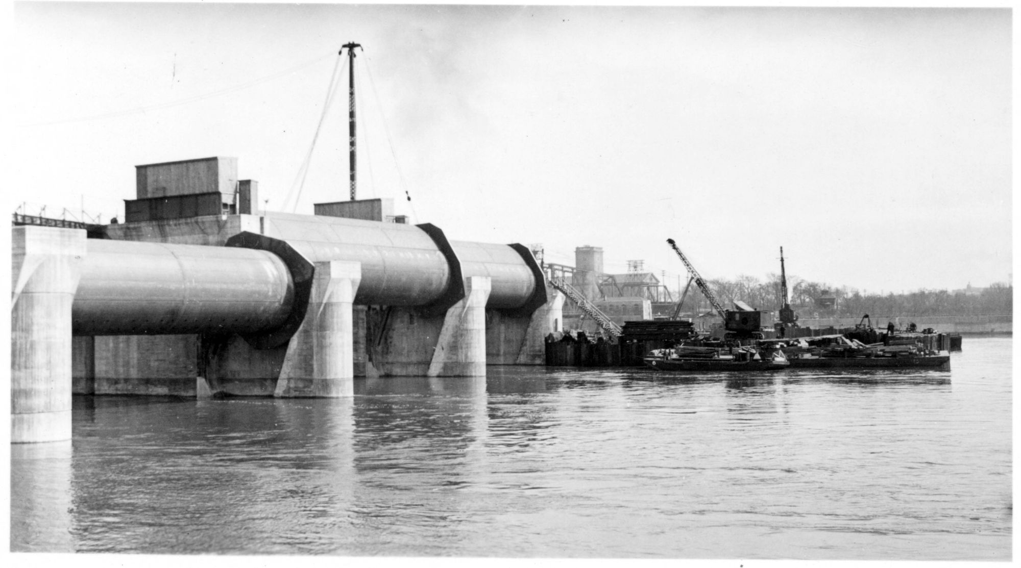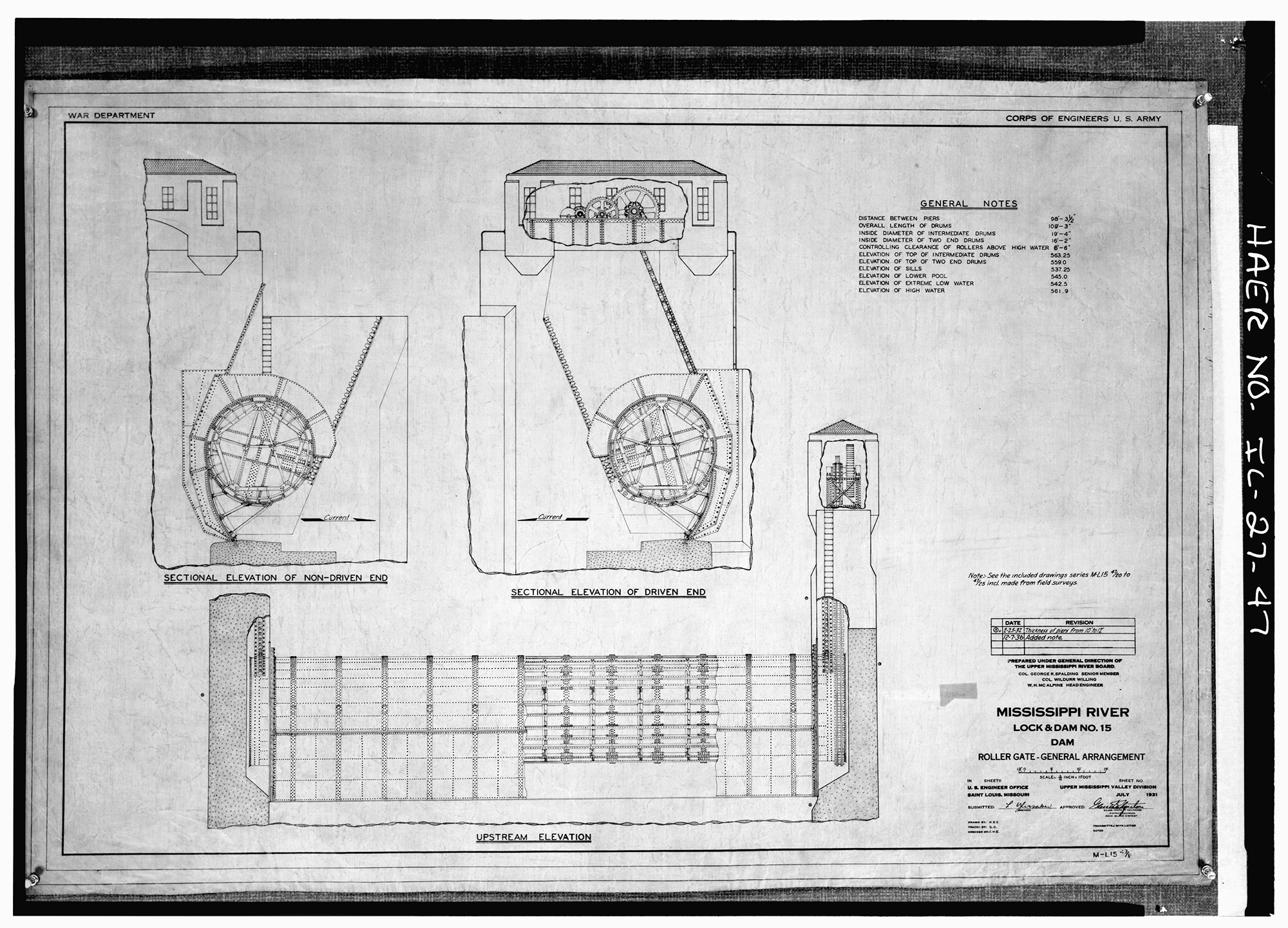 Narrower than in most of its course, with the once-fearsome Rock Island Rapids upstream, the Mississippi between Davenport and Rock Island sometimes caused problems for river shipping. The 9-foot Channel Navigation Project, authorized by the 1930 Rivers and Harbors Act after a long fight, aimed to tame the river's unpredictability. It compelled the USACE to devise a way to maintain a nine foot channel depth, at low water, with widths suitable for long-haul barge service. Basically, the Army Corps had to build a dam across that narrow stretch of the river to create a reliably deeper pool and submerge the rapids. Led by Head Engineer William McAlpin and, especially, Lenvik Ylvisaker, the USACE built a dam featuring nine roller gates plus two overflow gates that would hold back just enough water to create the upstream “river pool”, providing a consistent navigable channel. Each roller gate has its own pier house with a motor and gears to raise or lower the gate. The other half of the dam is a submerged “sill” that, when the gates are lowered onto it, combines to restrict the river’s flow and fill the river pool upstream. In high water conditions, the gates are raised all the way up and the river flows unencumbered over the concrete sill (but under the roller gates).