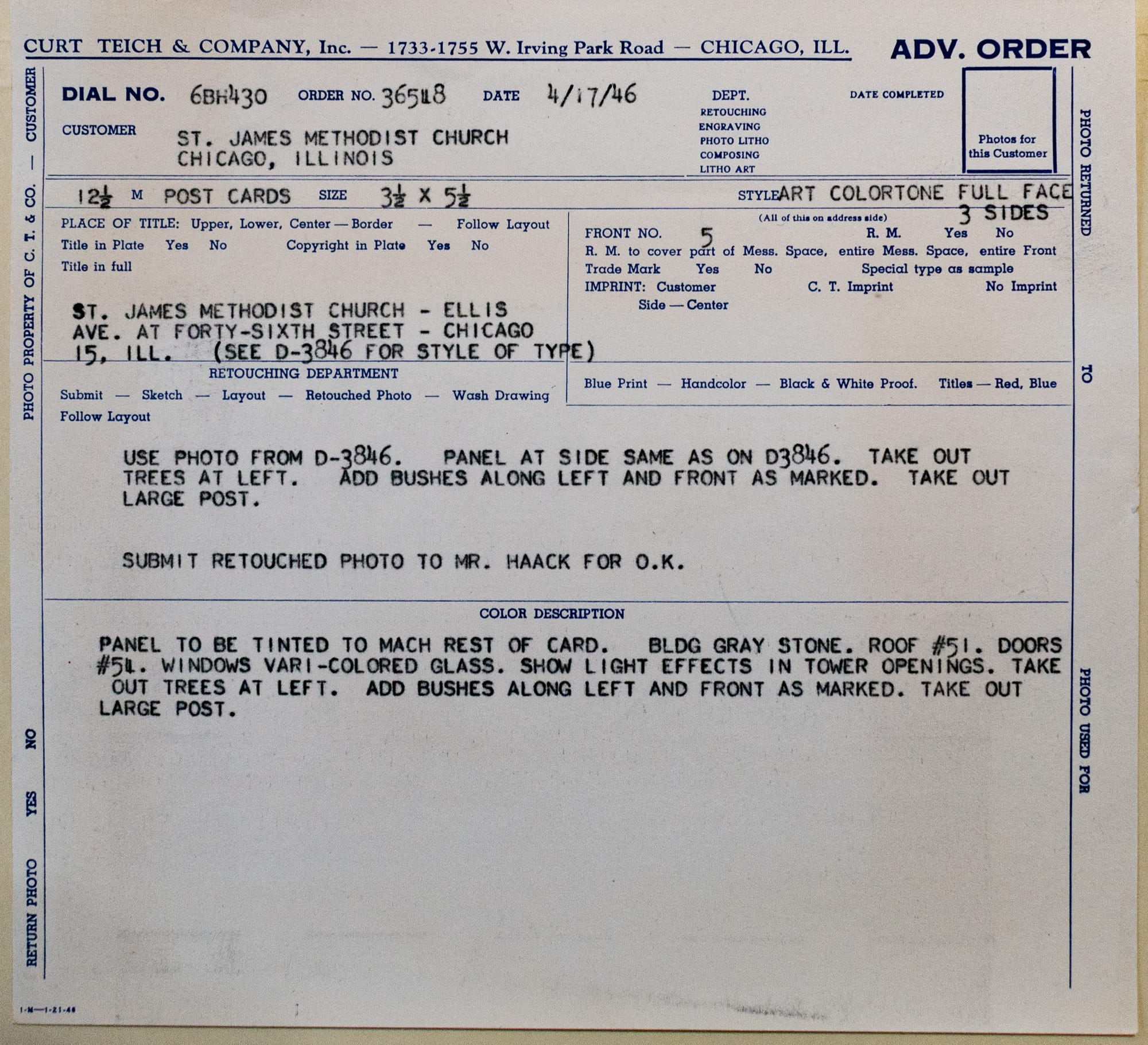 Some good stuff in the production file from the Curt Teich Archive at the Newberry Library. Not a ton of changes here, but they removed the light pole on the corner and—more confusingly—all the street trees.
