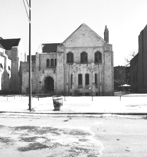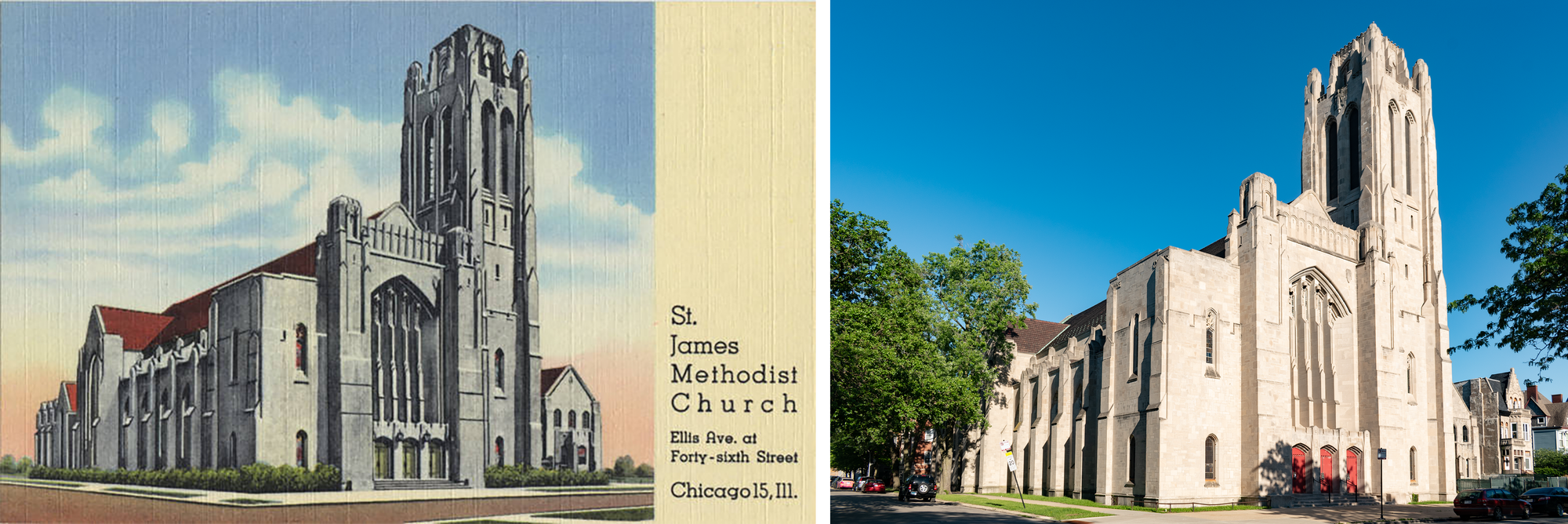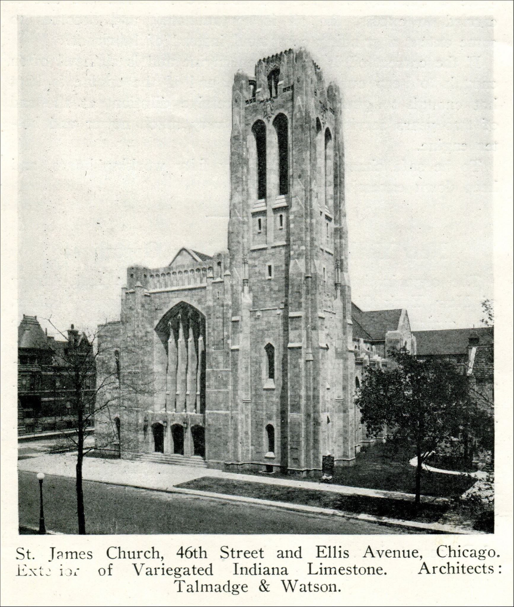 After the fire, St. James merged with Oakland Methodist Episcopal, and the combined congregation hired the high-profile firm of Tallmadge & Watson for their new church. Tallmadge & Watson were prolific Chicago architects, known for their Prairie-style homes and Gothic churches—here, you can even catch a hint of early Art Deco in the verticality and stripped down ornamentation.