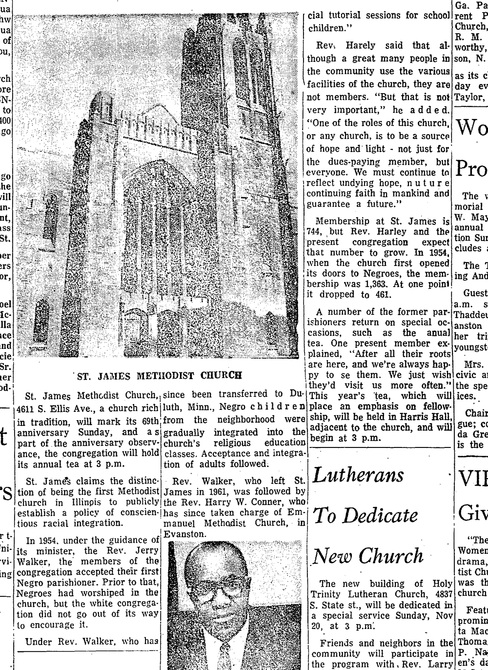 Not all at once—they started by opening a YMCA branch in the church to serve neighborhood kids—but integrating the church was an intentional response to the congregation’s declining numbers, to the extent that in the 1960s the Chicago Defender published an article headlined, “The St. James Story – Lesson in Integration”.