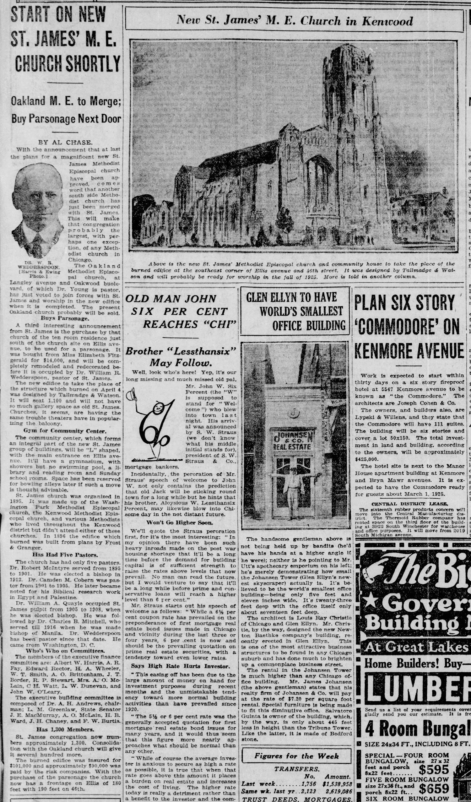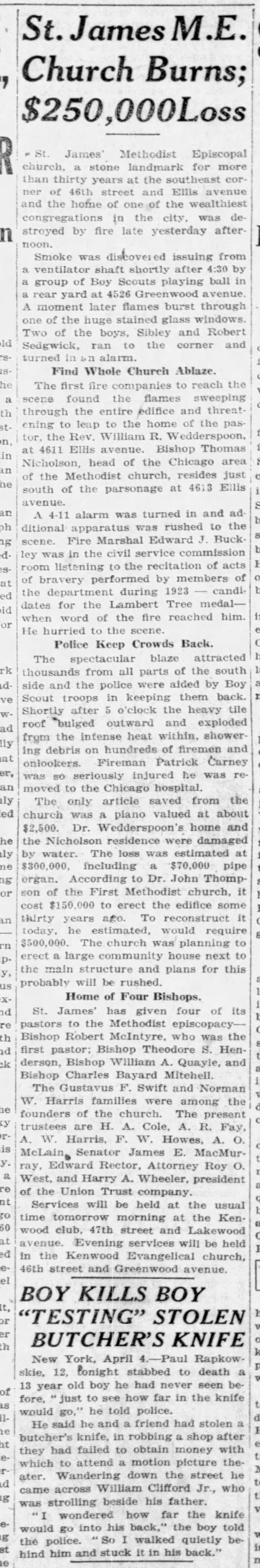 1924 articles on the fire that burned the previous church building, plans for rebuilding, and the start of construction