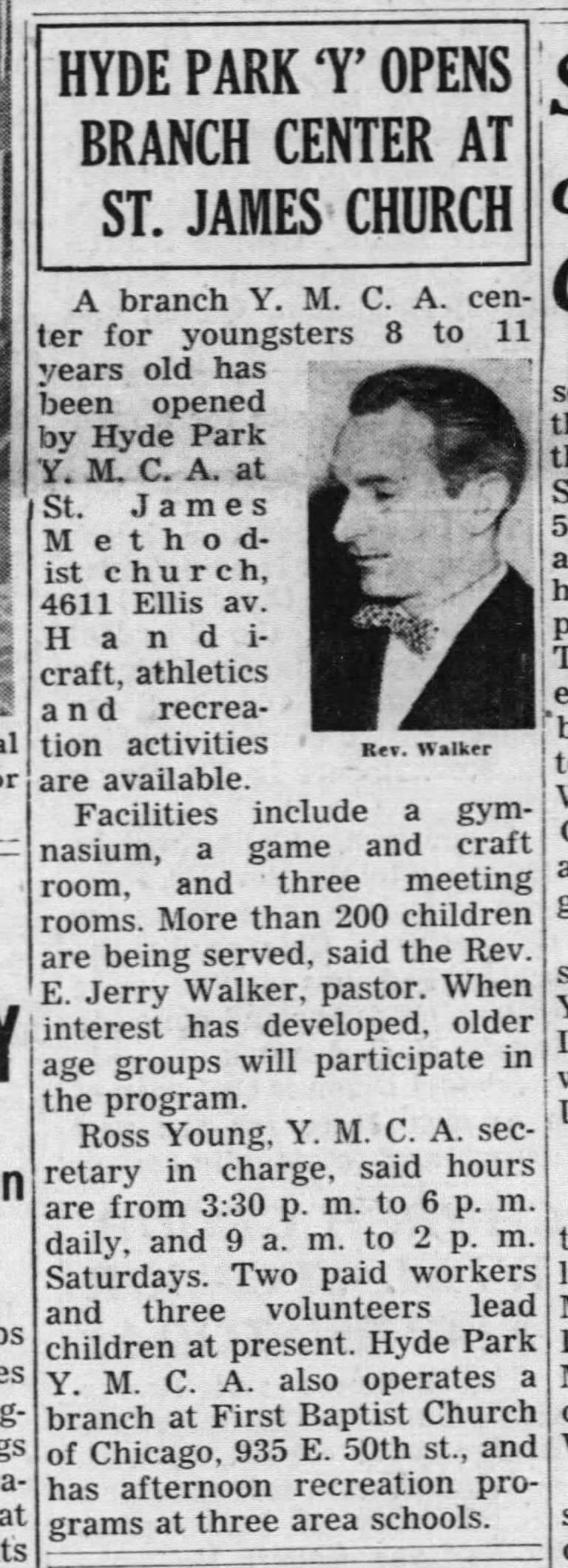 1954 article on the opening of a YMCA branch in the church | 1961 Chicago Defender article, 'A Lesson in Integration' | 1956 article on how the choice to integrate had reversed the church's membership slump | 1966 Chicago Defender article on the church's celebration of its 69th anniversary