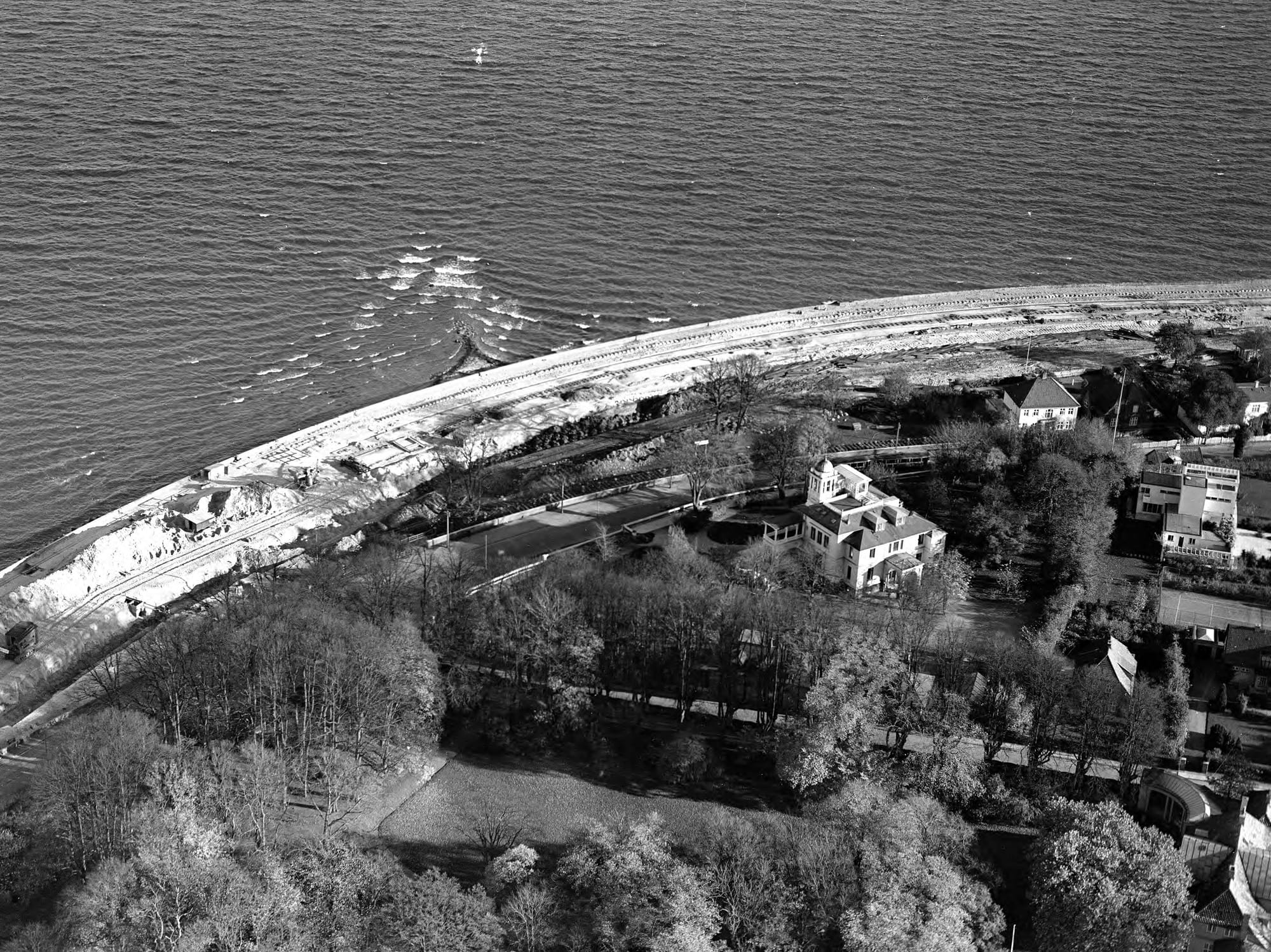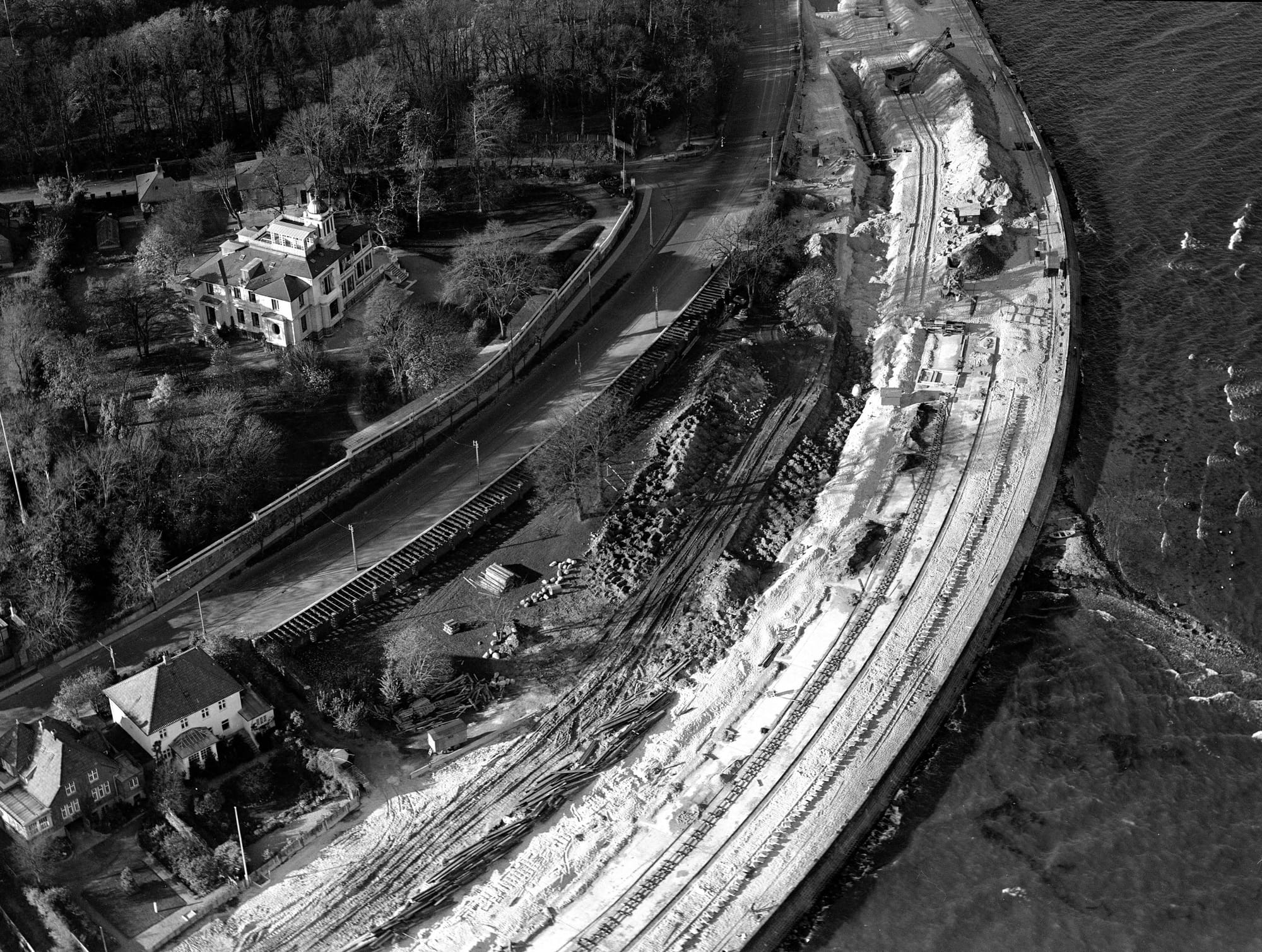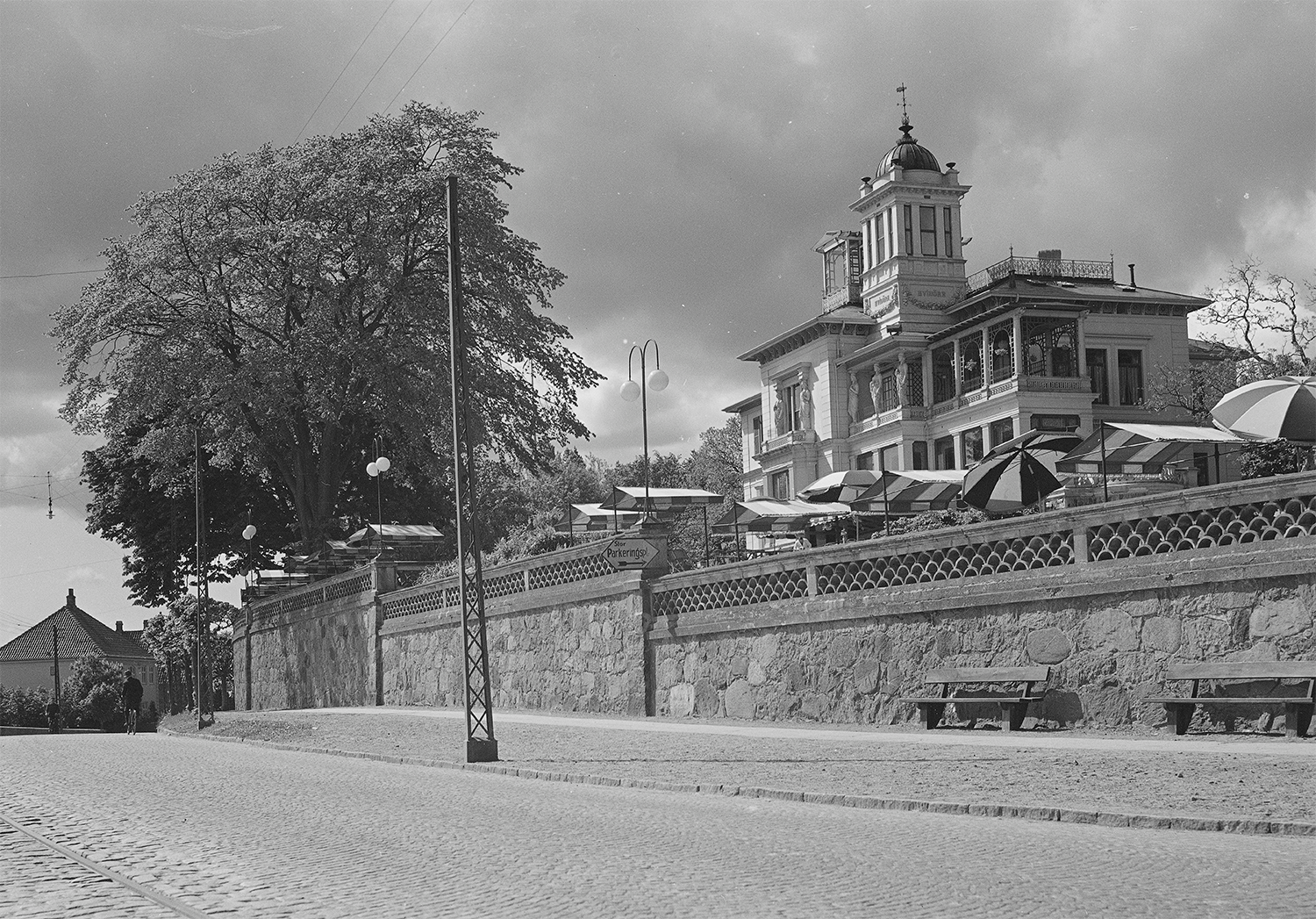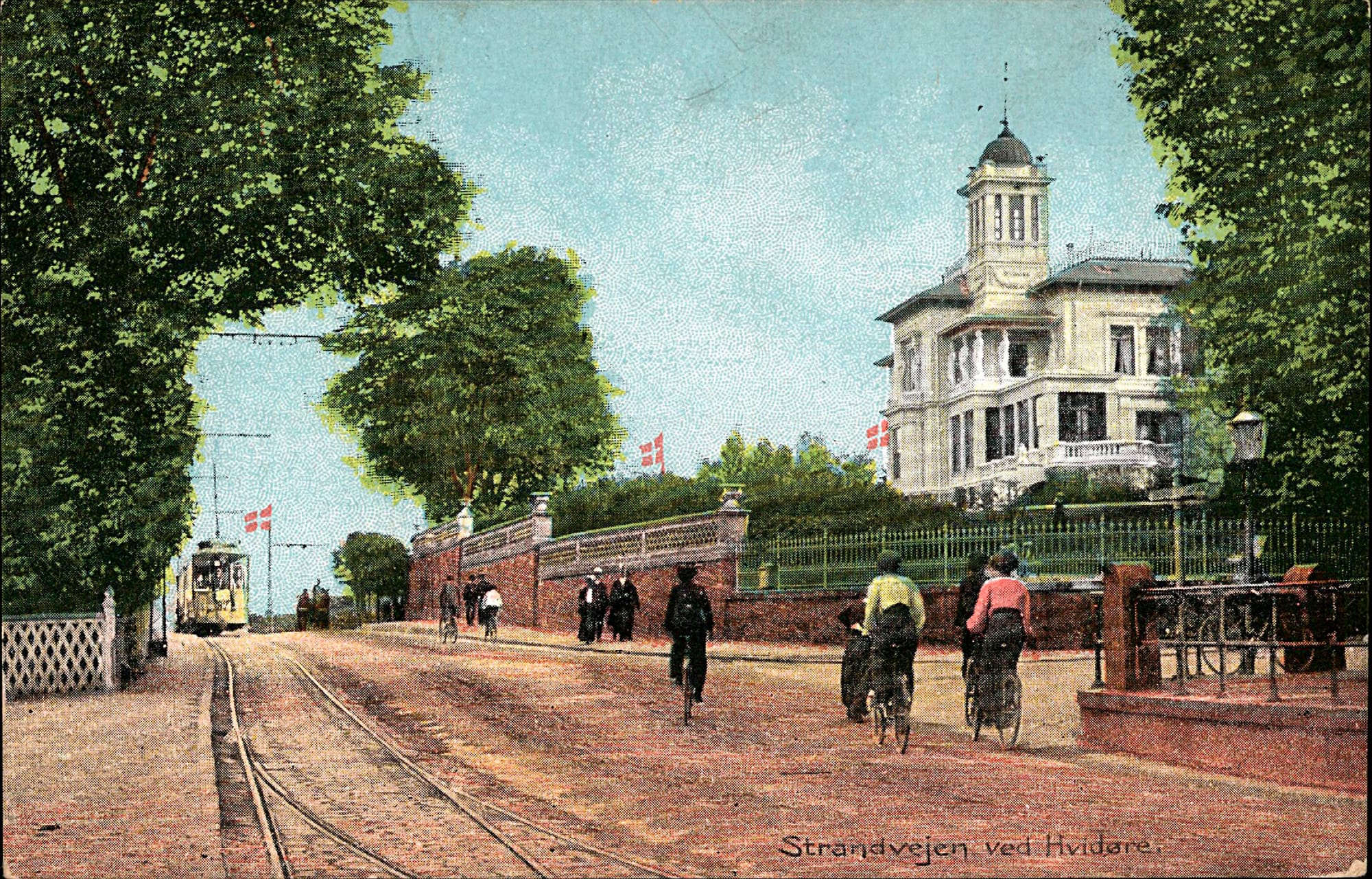 So, what’s changed? Obviously the catenary wires for the Tuborg-Klampenborg Elektriske Sporvej were torn down. Originally running as the 4, then as the 14, the Nordsjællands Elektricitets og Sporvejs Aktieselskab abandoned their tracks on Strandvejen in 1951—the entire line north from Copenhagen to Klampenborg converted to bus service in 1965. The villa in the background, now the embassy of Bangladesh, was built in 1920. In the foreground, the concrete corner of Emiliekildevej and Strandvejen returned to grass sometime after the 1940s.