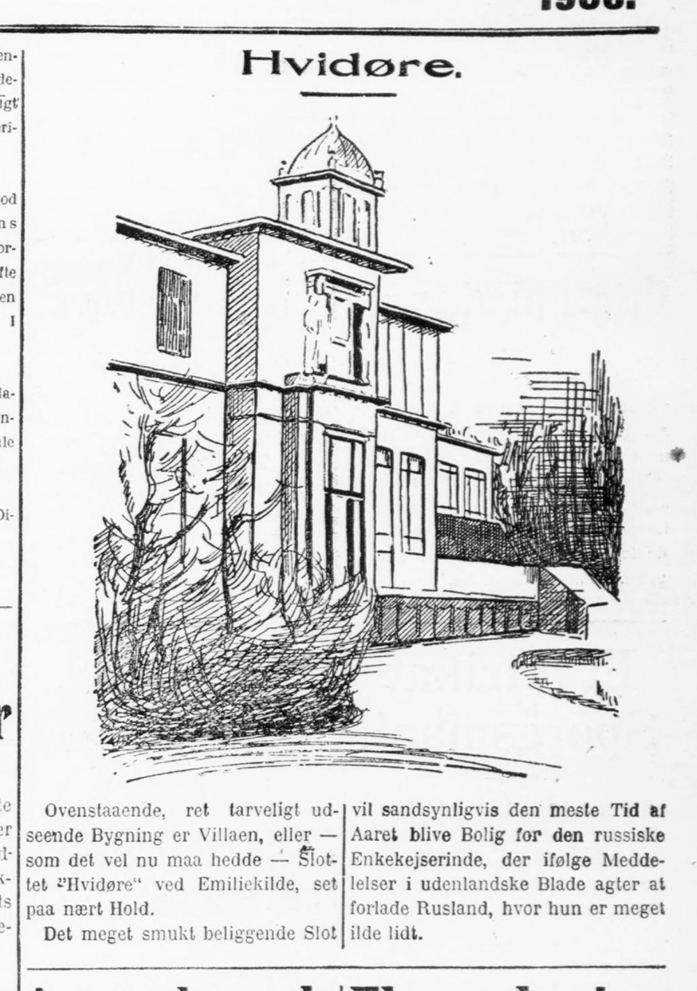 Post-1906 postcard with horsecart, Europeana | Postcard with snow, Det Kgl. Bibliotek | 1906 articles about the two queens purchasing and renovating Hvidøre | Undated, Vilhelm Tryde, the Museum of Copenhagen | Dowager Empress Maria Feodorovna in Anastasia (1997)