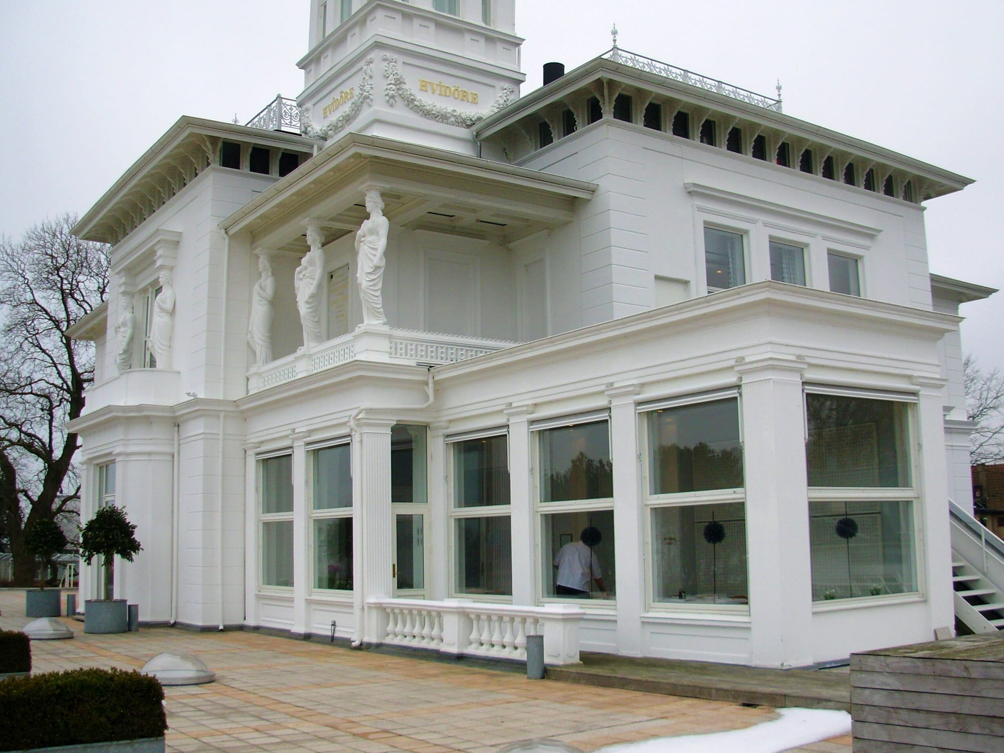 Hvidøre itself looks similar, but there are a few changes—if you look closely the upper balcony lost two of its caryatids. Sculpted by Otto Evens, they were removed during renovations commissioned by the Queens after they bought the house in 1906. Below that, you can spot the large windows of Dissing + Weitling’s addition, completed in 1980.