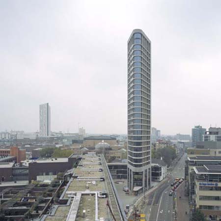 …oh, and the tower! The Vesteda Toren, an absurdly slender flatiron condo tower, opened in 2006. Designed by Jo Coenen & Co Architekten, it’s the 4th tallest building in Eindhoven and won the Association of Dutch Architectural Firms Building of the Year in 2007.