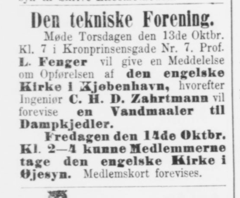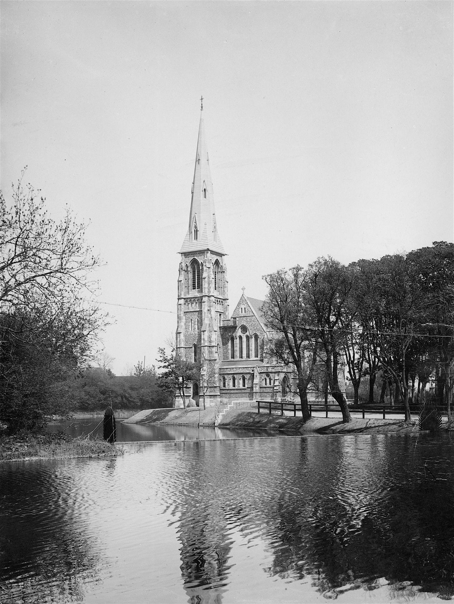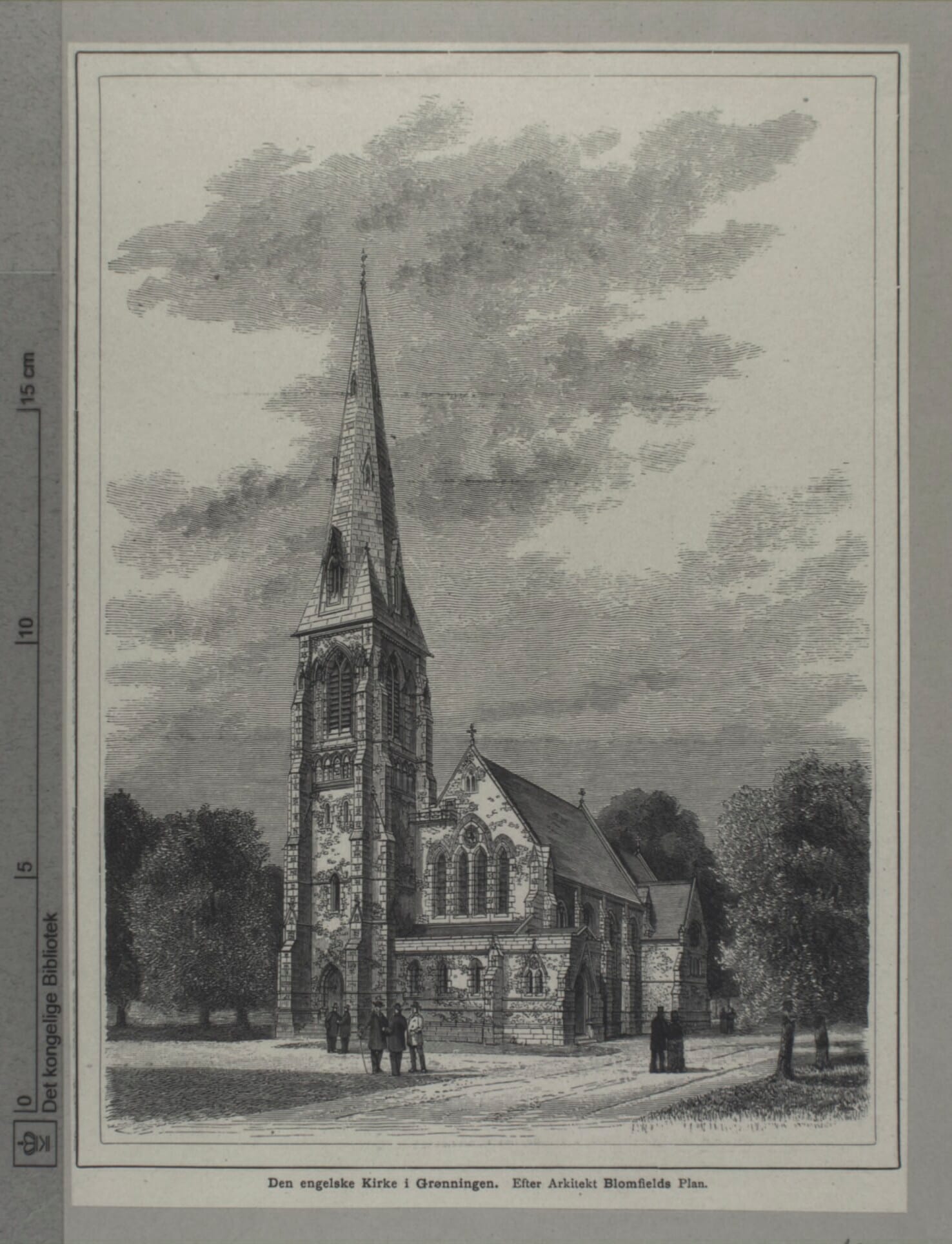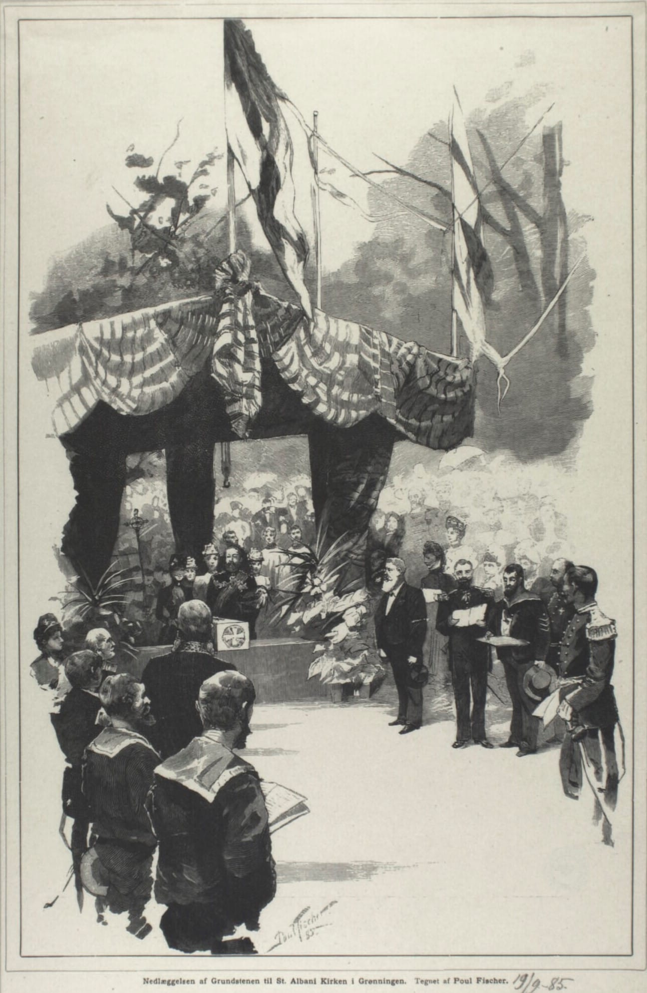 1885, cornerstone laying | 1885 cornerstone laying sketch, Paul Fischer, Wikimedia Commons | Sketch, Det Kgl. Bibliotek | 1887, Dedication | Interior, 1887, Wikimedia Commons | Dedication, 1887, Wikimedia Commons | Ludvig Fenger speaks about the English Church in 1887
