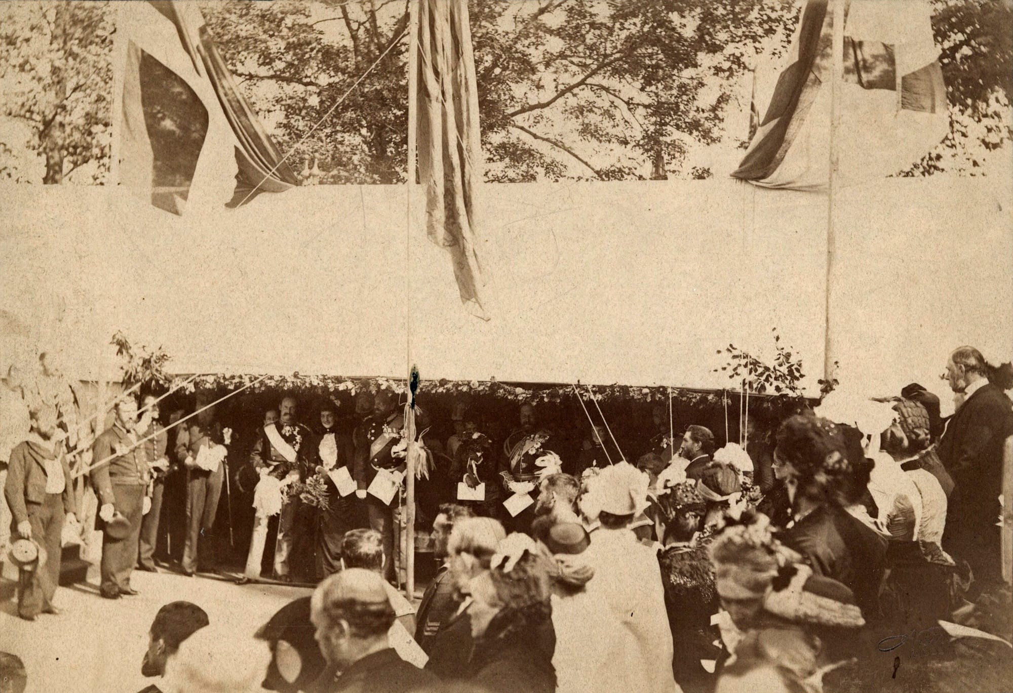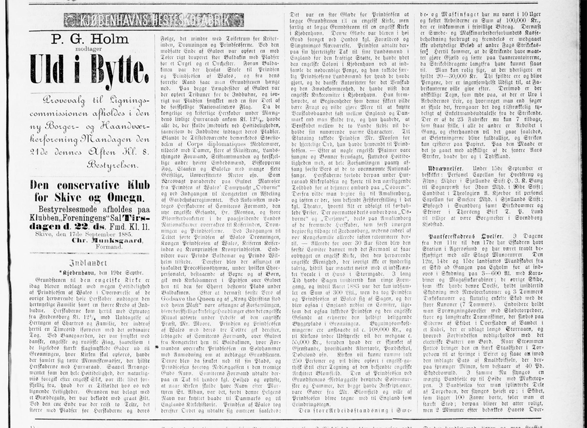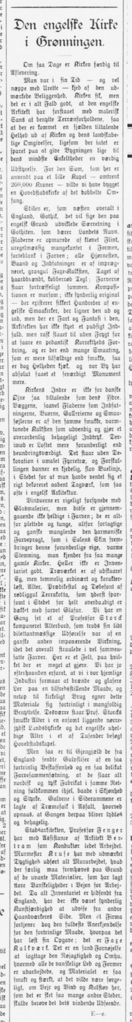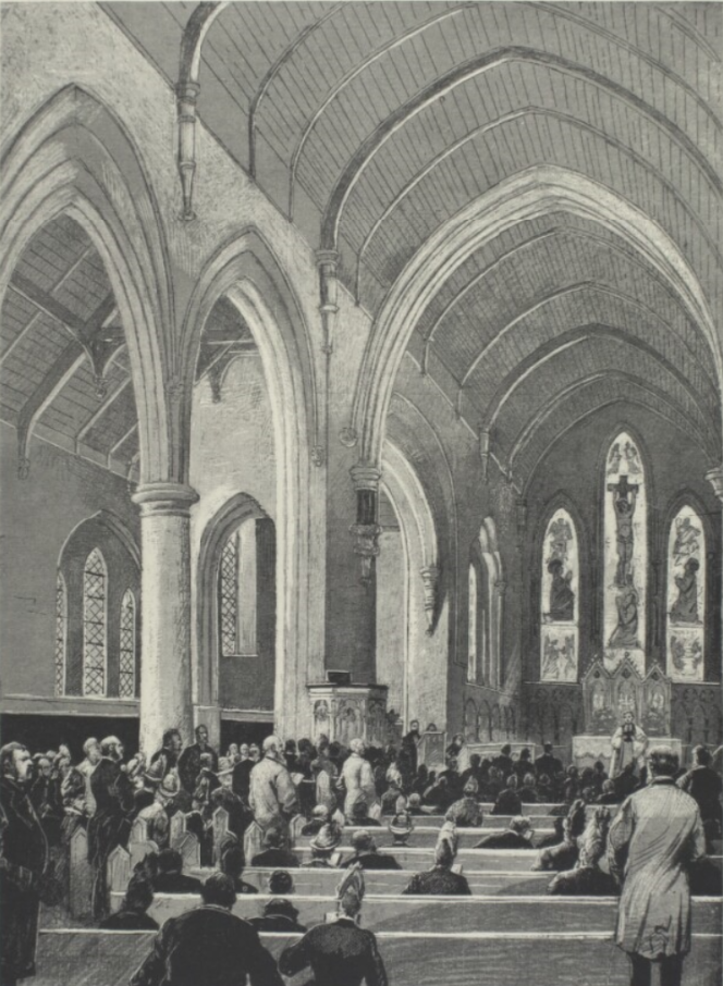 1885, cornerstone laying | 1885 cornerstone laying sketch, Paul Fischer, Wikimedia Commons | Sketch, Det Kgl. Bibliotek | 1887, Dedication | Interior, 1887, Wikimedia Commons | Dedication, 1887, Wikimedia Commons | Ludvig Fenger speaks about the English Church in 1887