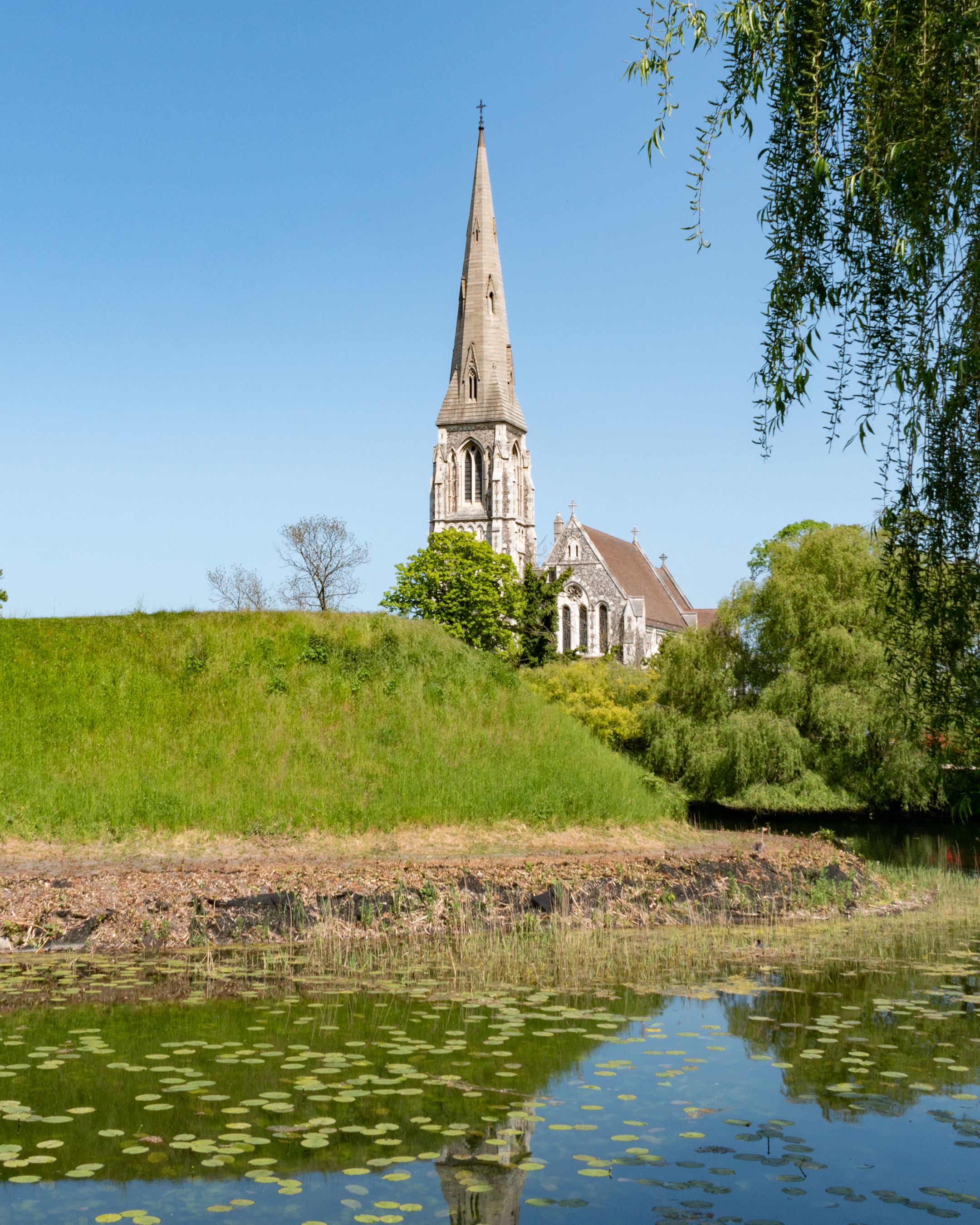 The small congregation quietly puttered along until a royal marriage won them a powerful patron—in 1863, Princess Alexandra of Denmark married Queen Victoria’s eldest son, Albert Edward. What gesture would better tie together the Princess of Wales’ adoptive country and her birth country than Alexandra helping construct the first Anglican church—the international branch of the Church of England—in Denmark? Suddenly a congregation with clout, backed by a future British queen and the daughter of the King of Denmark, the congregation secured financing and this posh-but-peripheral site on Kastellet’s moat.