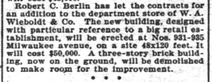 Less than a decade after arriving in Chicago from Germany, William A. Wieboldt opened his first shop in 1883 on Grand Avenue (in a building that, remarkably, is still there). Two years later, Wieboldt moved his store to the intersection of Milwaukee and Paulina—but initially across the street, on the northwest corner.