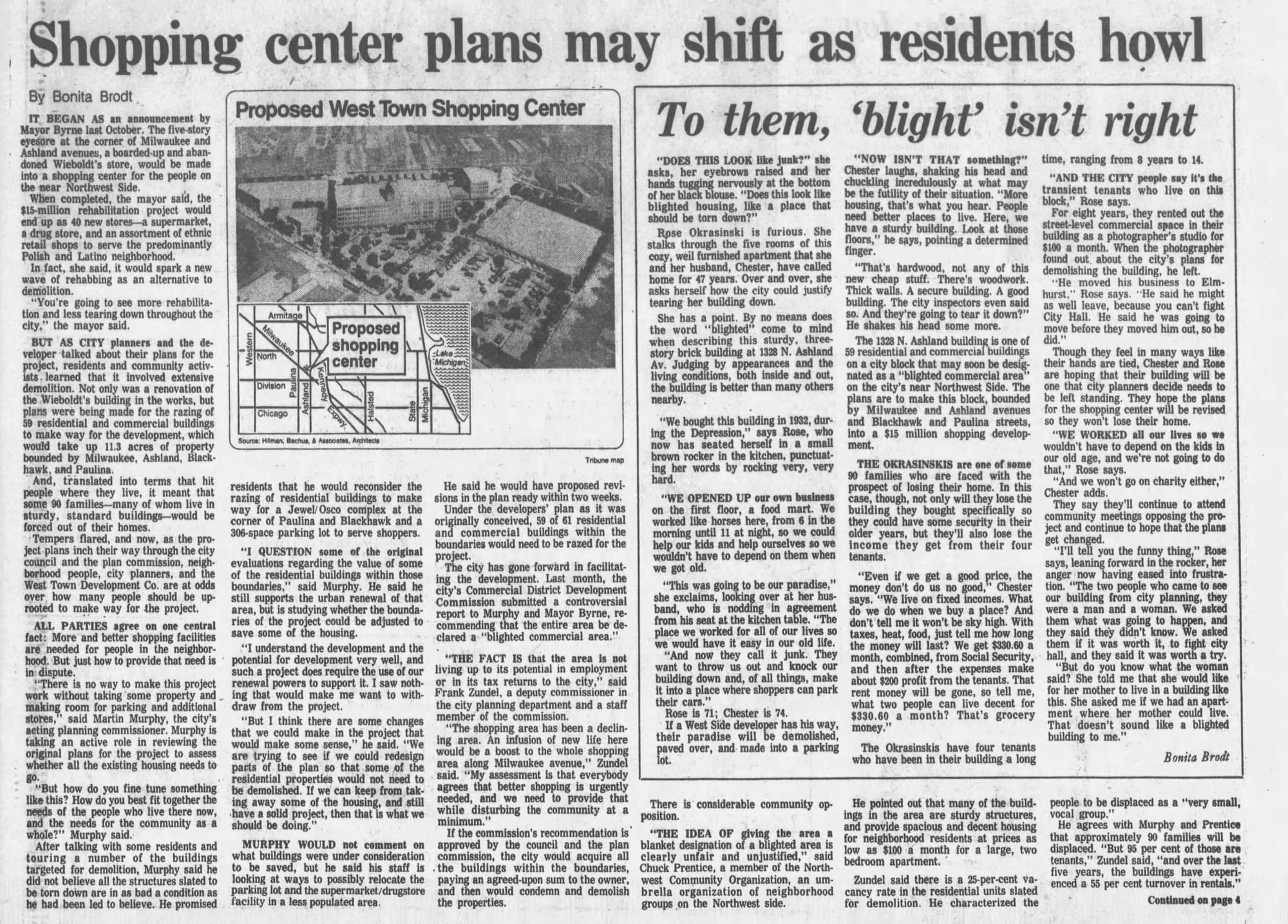 Wieboldt’s closure turned the building into a giant lifeless void on Milwaukee Avenue, and in response capital and government turned to their favorite mid-century tool—urban renewal. Flush with $3.7m ($17m today) in funding from the Department of Housing & Urban Development to condemn, acquire, and clear the site, a developer embarked on a $15m project to build “West Town Center”, renovating the empty Wieboldt’s building into a 40 store indoor mall, surrounded by hundreds of parking spaces and with a new, single-story shopping center. To pave the way for the development, the City of Chicago condemned 59 residential and commercial properties in the block bounded by Milwaukee, Paulina, Blackhawk, and Ashland.