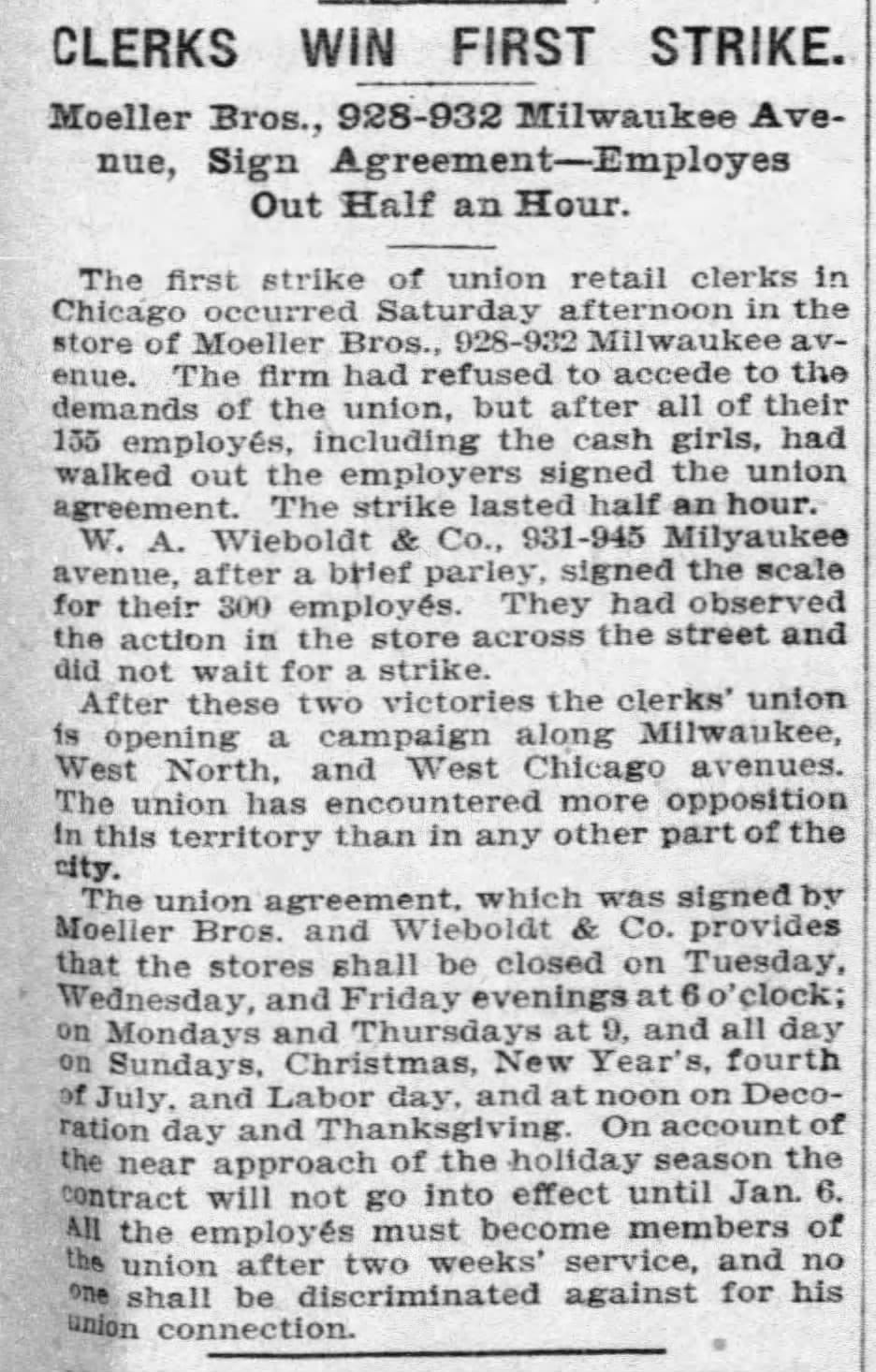 A growing retail empire with a powerful boss in a Chicago with a deep, bold, and highly organized labor movement—it will not surprise you to hear that there was conflict between workers and management here, in particular a months-long strike lead by Retail Clerks' National Protective Association organizer Emma Lanphere in 1904. Wieboldt’s had actually signed an initial contract with the union in 1902 without a strike, after the union struck the Moeller Bros. department store across the street. With the RCNPA growing from 16,000 to 60,000 members between 1900 and 1904, for the next contract the union came back asking for better working conditions, fewer working hours, and a day of rest on Sundays. Wieboldt’s refused. Lanphere and the clerks union strike included boycotts, organizing at churches, and—most powerfully—sympathy strikes, with aligned teamsters refusing to deliver to the department store (labor movement solidarity sufficiently threatened the power of rich assholes that the federal government outlawed sympathy strikes in 1947).