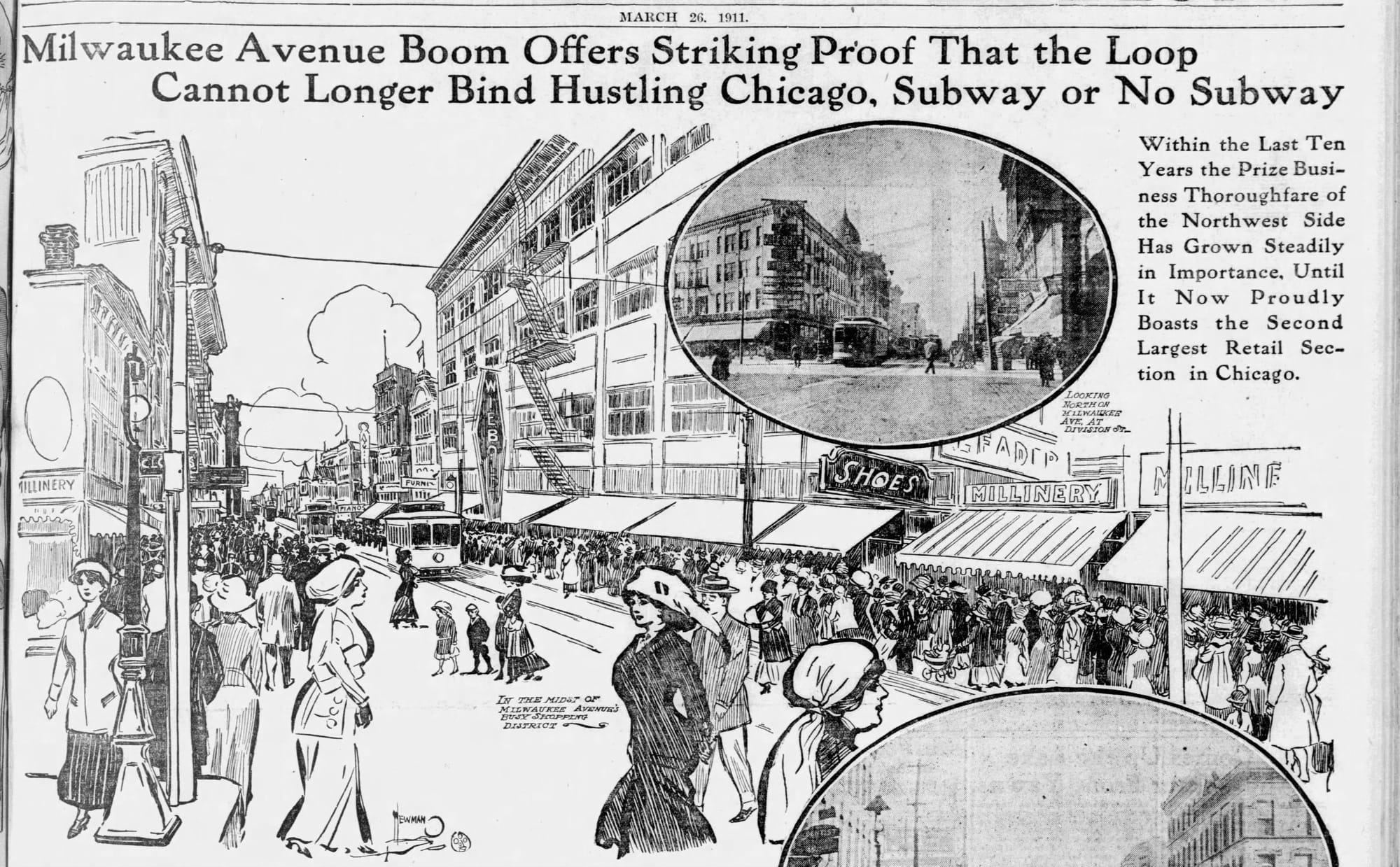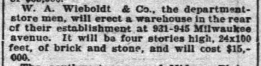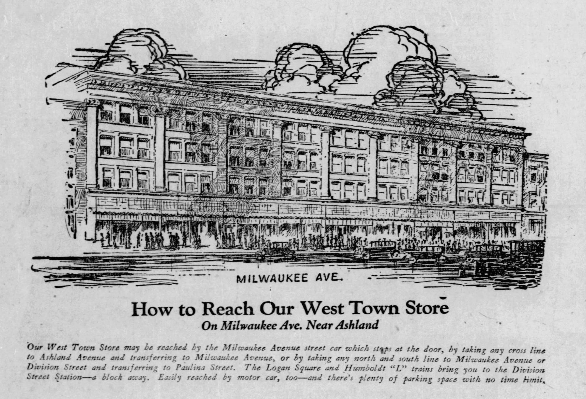 Less than a decade after arriving in Chicago from Germany, William A. Wieboldt opened his first shop in 1883 on Grand Avenue (in a building that—remarkably—is still there). Two years later, Wieboldt moved his store to the intersection of Milwaukee and Paulina—but initially across the street, on the northwest corner.