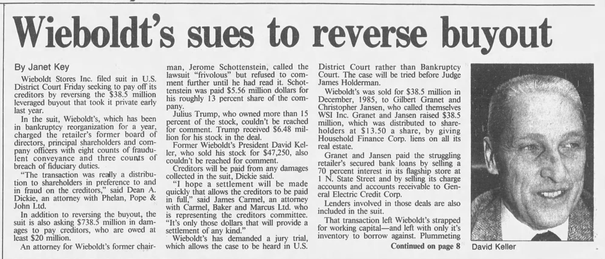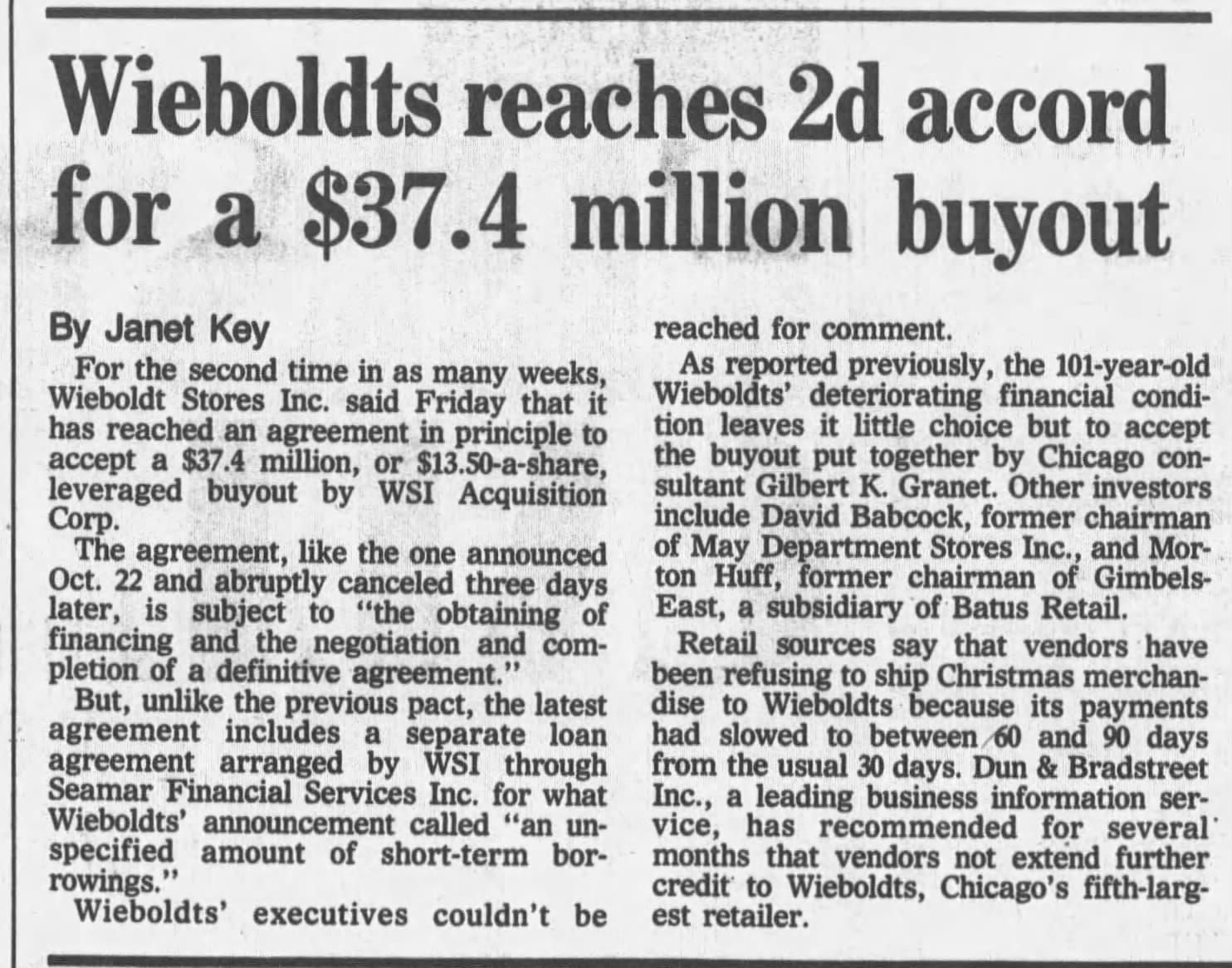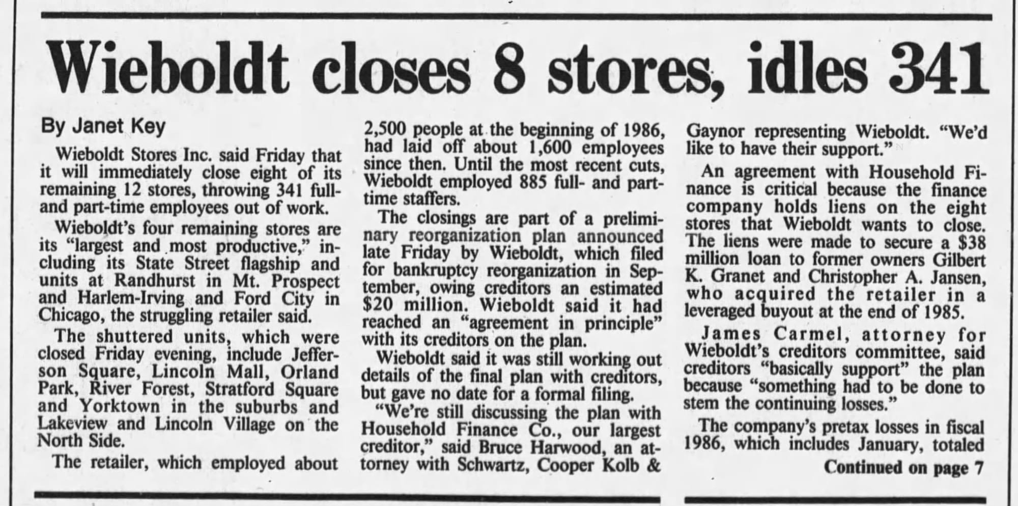…a leveraged buyout, of course. In 1985 Baytree Investors—Gilbert Granet, Bernard M. Krakower, and Christopher A. Jansen—took out a shitload of debt to buy Wieboldt’s and then immediately dumped that debt back onto the company. Shockingly, throwing millions of dollars of debt onto the balance sheet of a declining department store chain wasn’t helpful, and by 1987 Wieboldt’s had declared bankruptcy and was in liquidation. A fraud lawsuit in connection with the LBO was settled just before going to trial in 1991 (but one of the Baytree Investors, Chris Jansen, would later end up in prison for tax fraud). It’s hard to look at the state of department stores today and say that Wieboldt’s would still be around if not for the leveraged buyout, but the LBO certainly hastened the collapse of a local institution that still employed thousands of people in 1987.