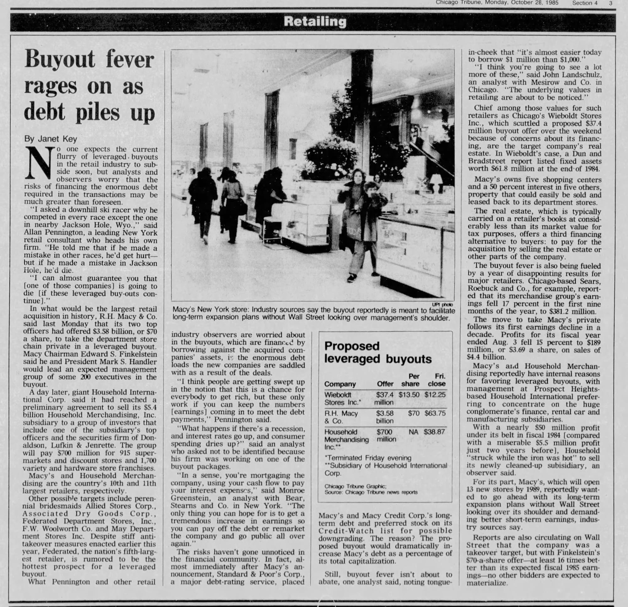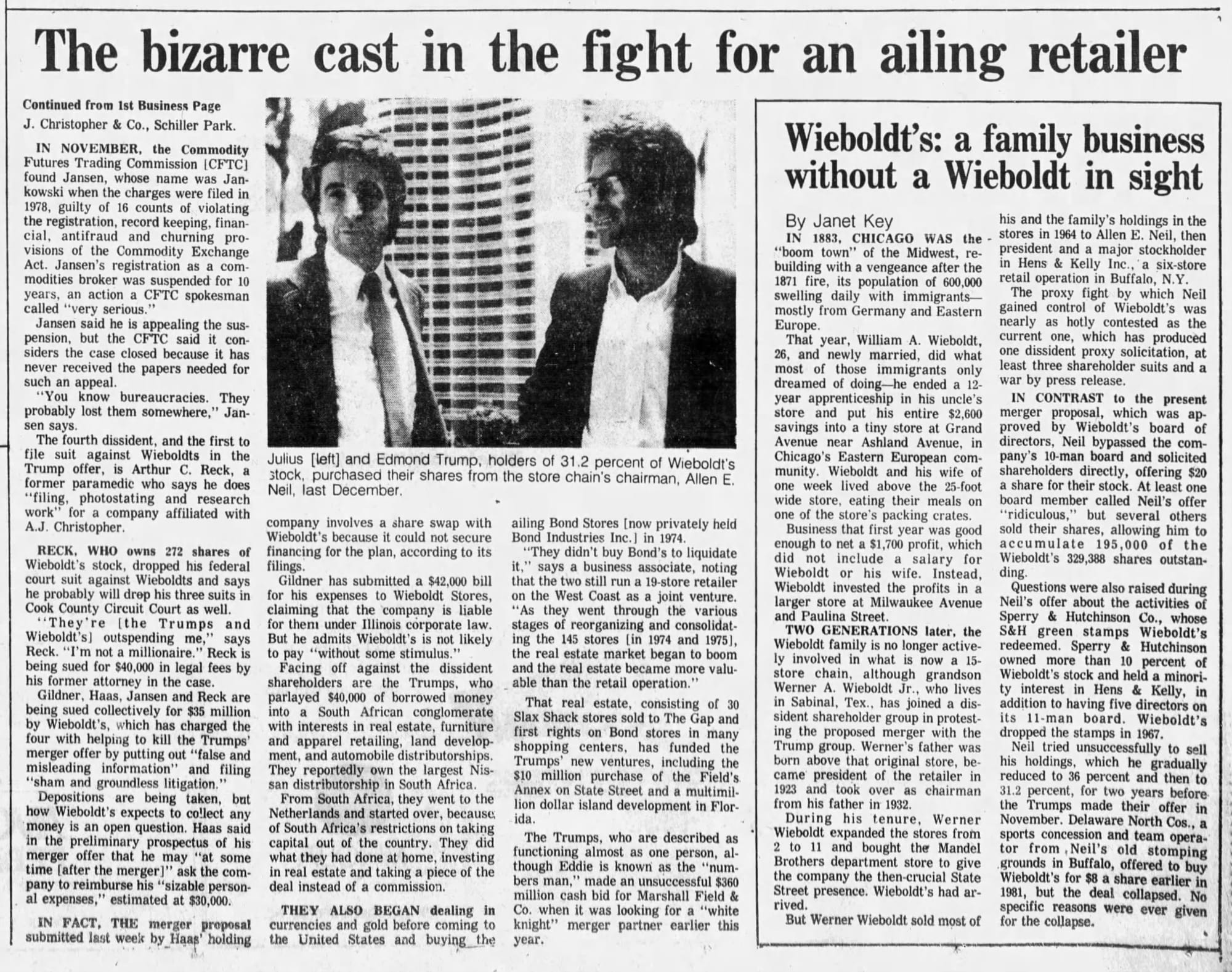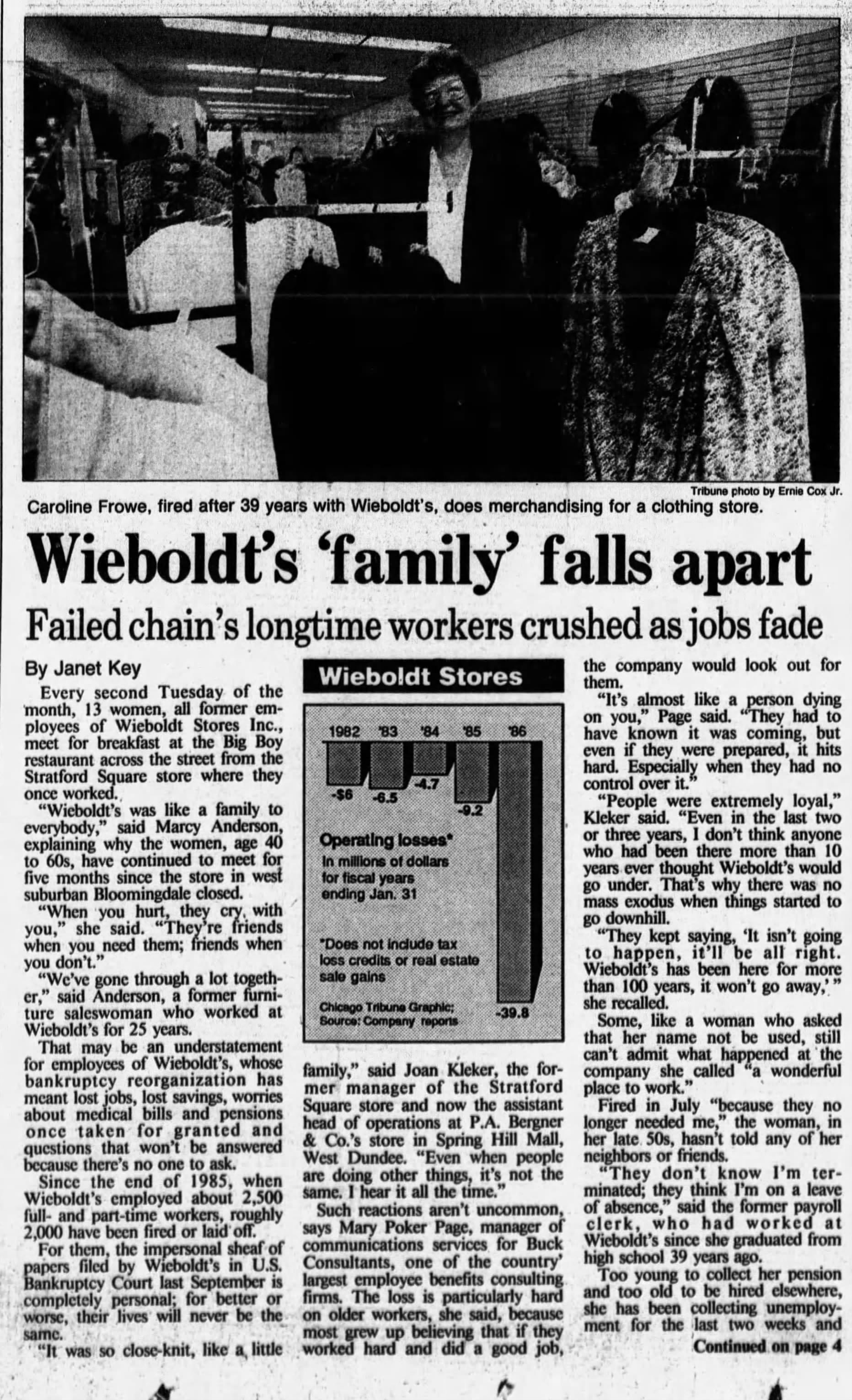 …a leveraged buyout, of course. In 1985 Baytree Investors—Gilbert Granet, Bernard M. Krakower, and Christopher A. Jansen—took out a shitload of debt to buy Wieboldt’s and then immediately dumped that debt back onto the company. Shockingly, throwing millions of dollars of debt onto the balance sheet of a declining department store chain wasn’t helpful, and by 1987 Wieboldt’s had declared bankruptcy and was in liquidation. A fraud lawsuit in connection with the LBO was settled just before going to trial in 1991 (but one of the Baytree Investors, Chris Jansen, would later end up in prison for tax fraud). It’s hard to look at the state of department stores today and say that Wieboldt’s would still be around if not for the leveraged buyout, but the LBO certainly hastened the collapse of a local institution that still employed thousands of people in 1987.
