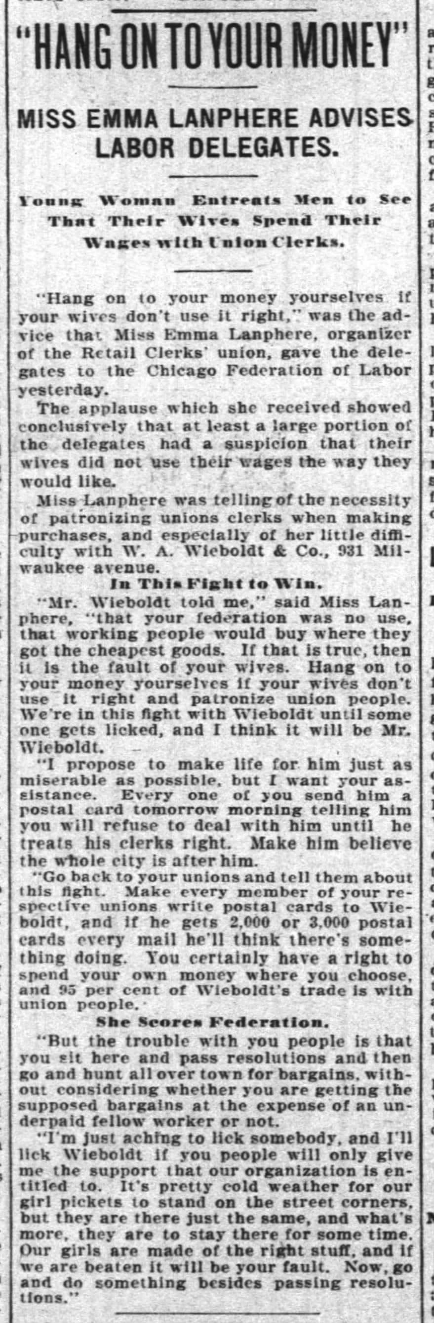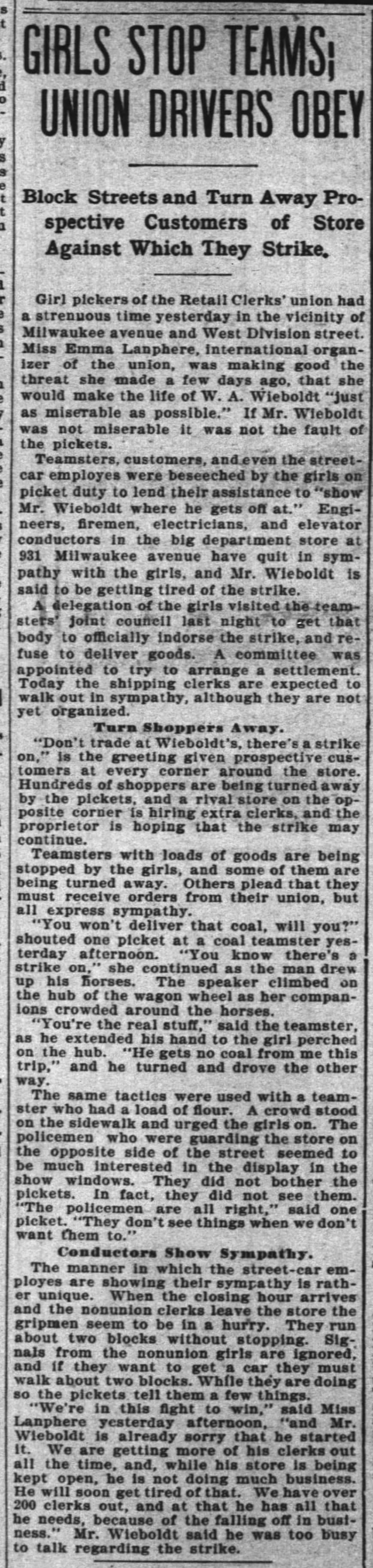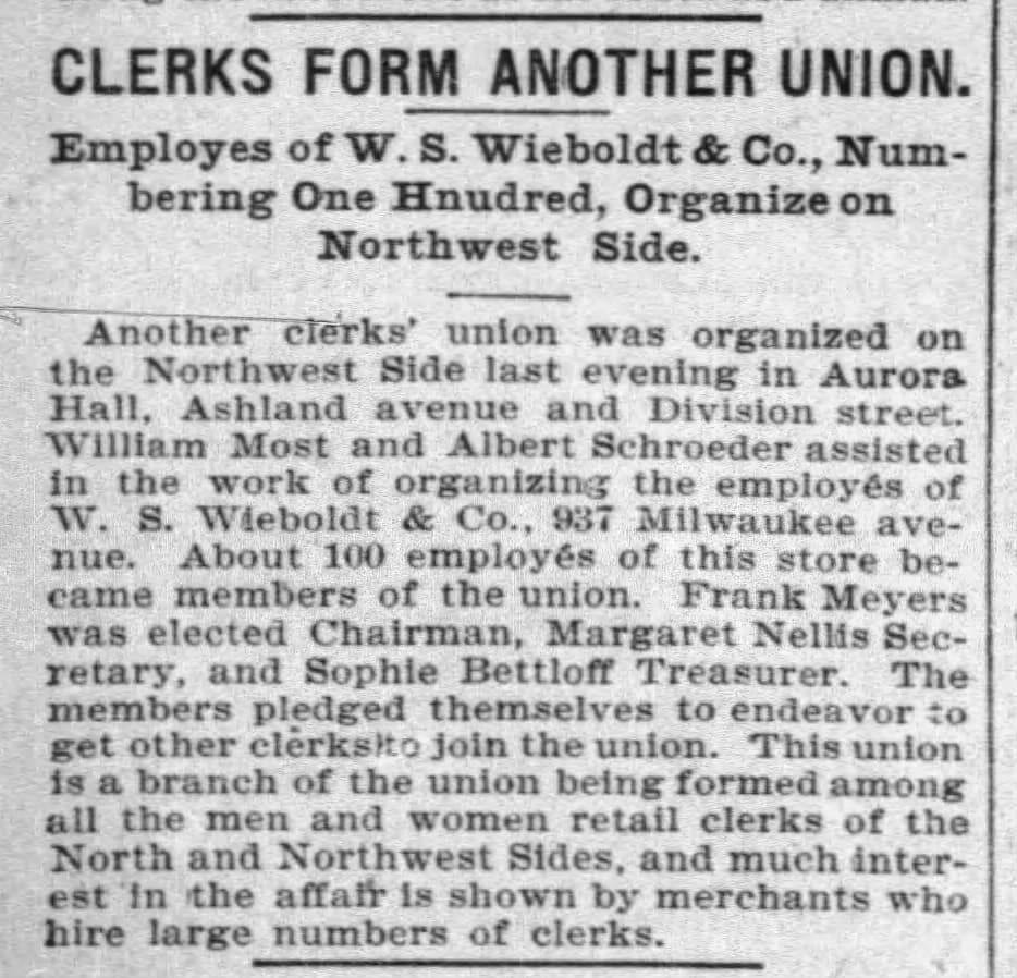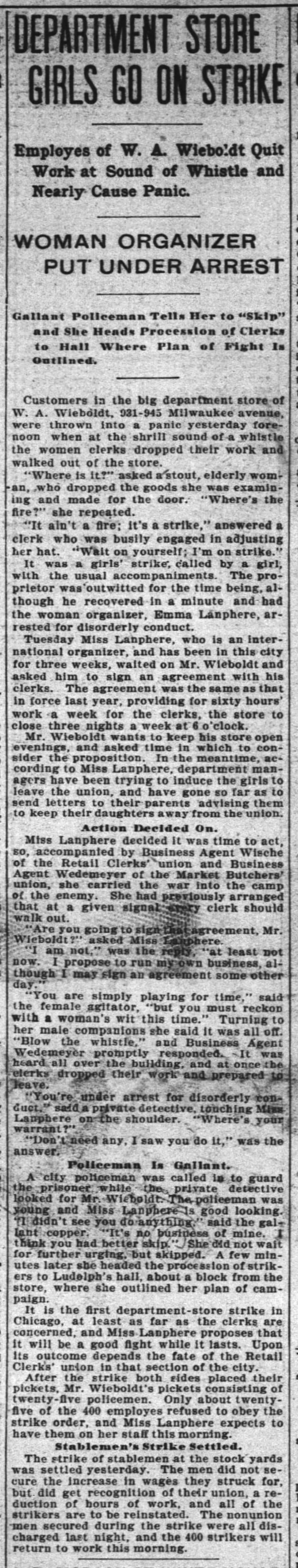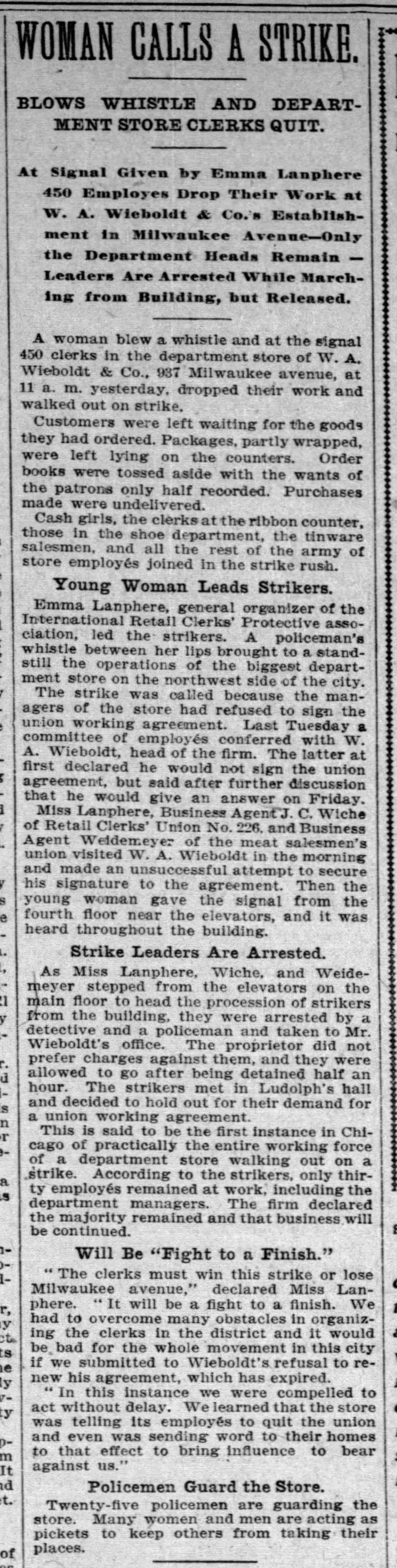 Union forms, 1901 | Wieboldt's signs a contract with the union, 1902 | 1904 articles about the retail clerks' strikes lead by Emma Lanphere