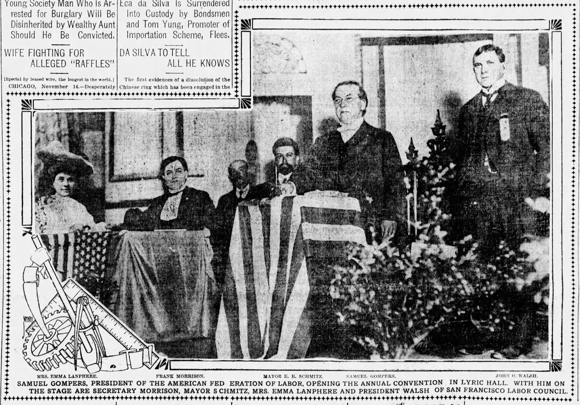 1904, Emma Lanphere in San Francisco with labor leaders including Samuel Gompers