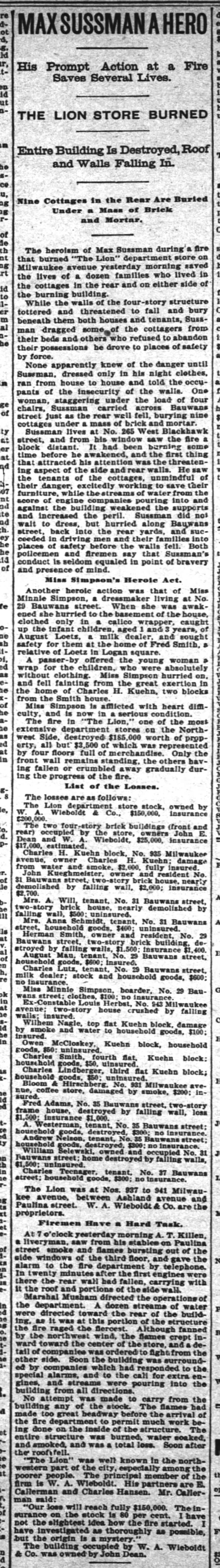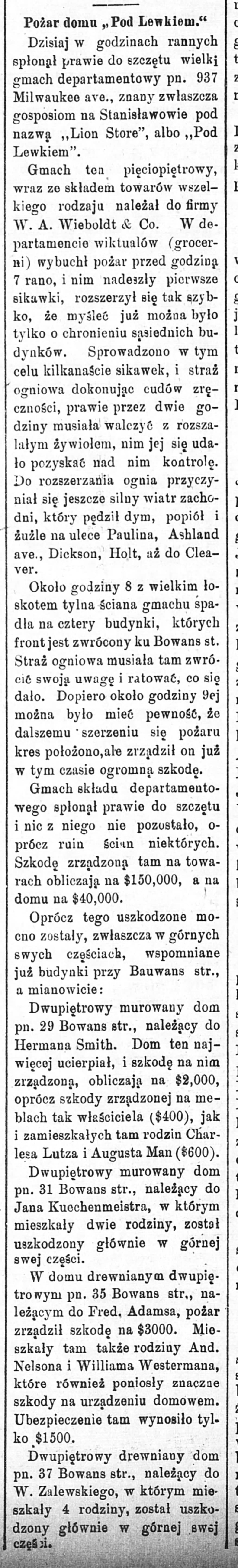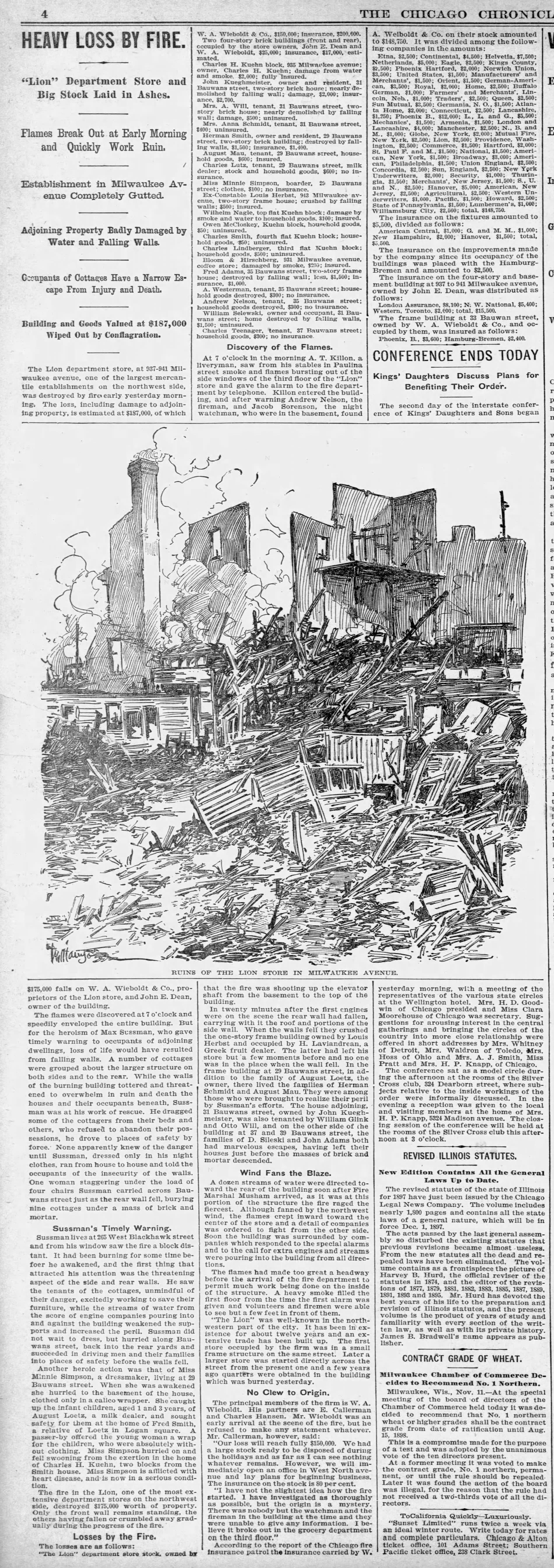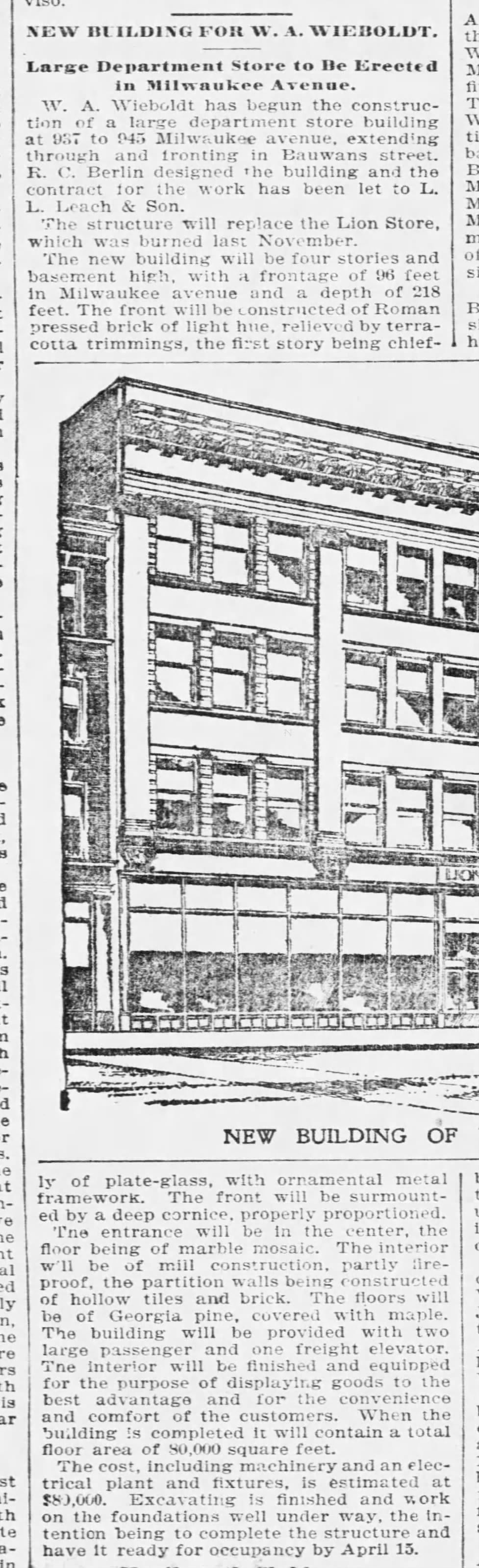 First store location, 1832 W. Grand, 1960 Shareholders Report, the Internet Archive | 1832 W. Grand, 2019 Google Streetview | Photo of the burned Lion Store, 1897 (in the Chicago Tribune in 1986) | 1897 articles about the fire in the Chicago Chronicle, the Inter Ocean, and Dziennik Chicagoski | 1898 articles about the new building | 1953 Henry Crown Wieboldt fire story
