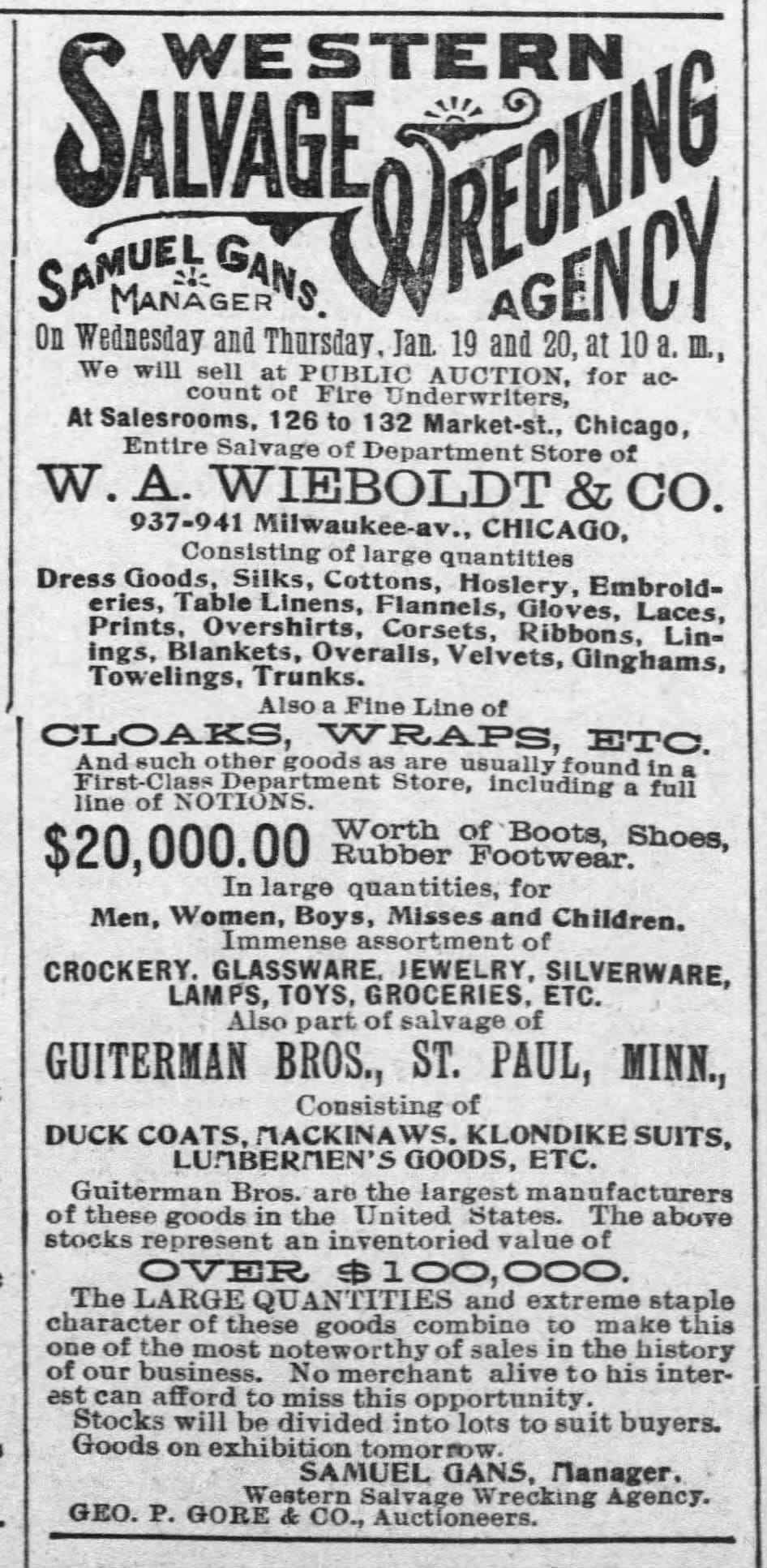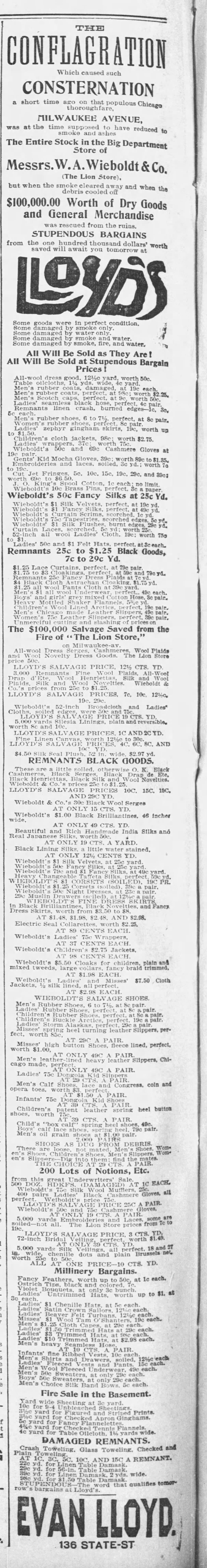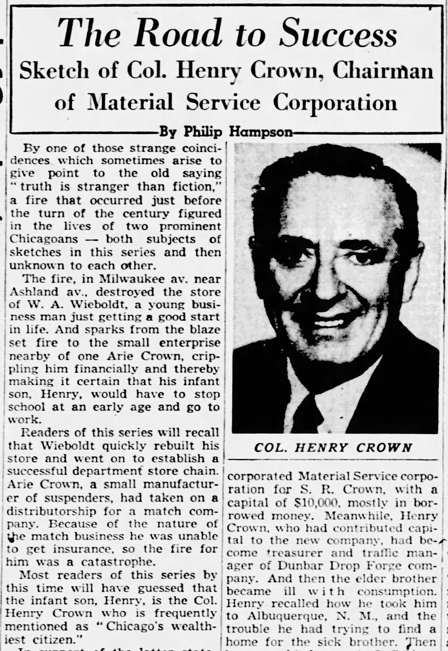 (the fire that destroyed the Lion Store also played a role in the mythology of another, even wealthier Chicago family—the Crowns, building material tycoons turned billionaire defense contractors. According to the family story, the 1897 fire destroyed match dealer Arie Crown’s entire [uninsured] stock, knocking the family back down the economic ladder and forcing young Henry—who’d go on to build the family fortune—out of school and into the workforce at a young age. [the newspapers don’t mention any Crowns or Krinskys in their list of losses, but that doesn’t necessarily mean it didn’t happen—they could’ve been so small potatoes it wasn’t worth mentioning.])