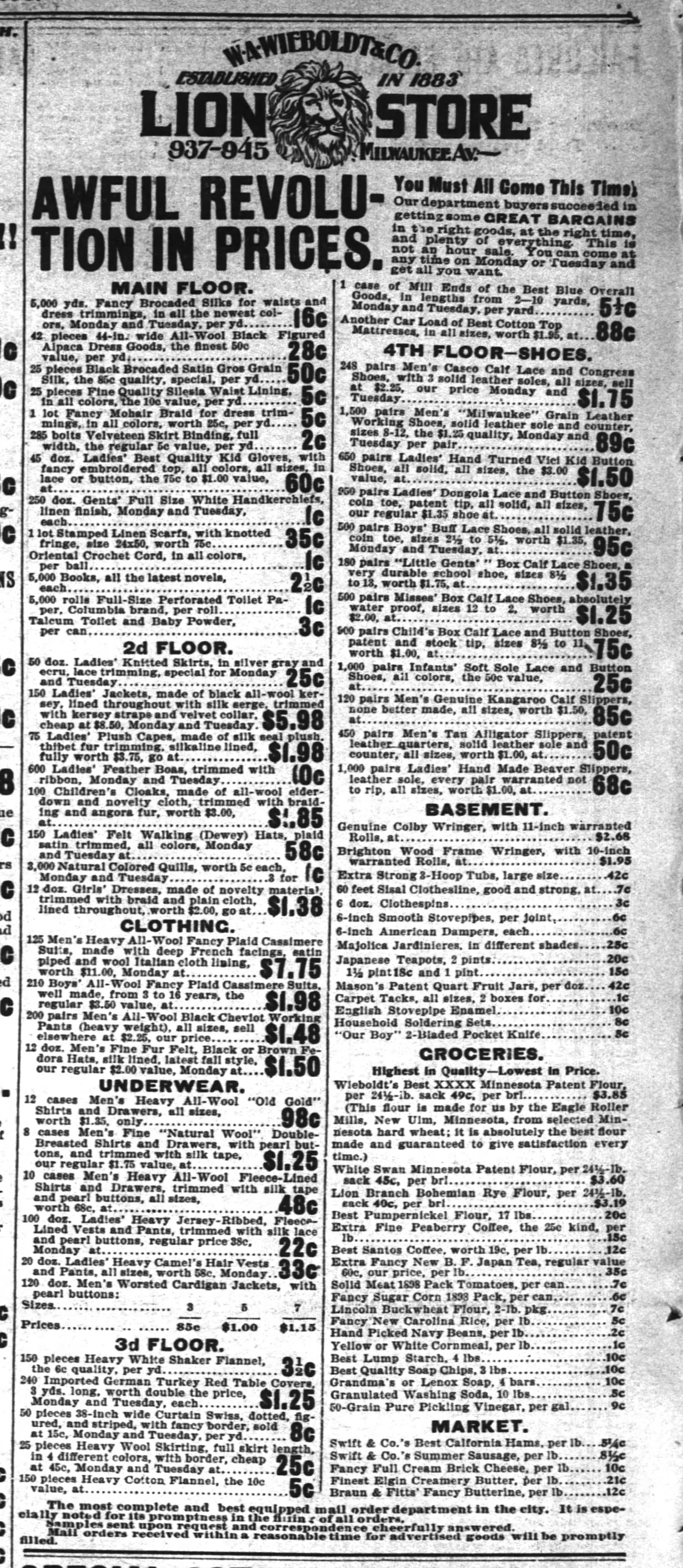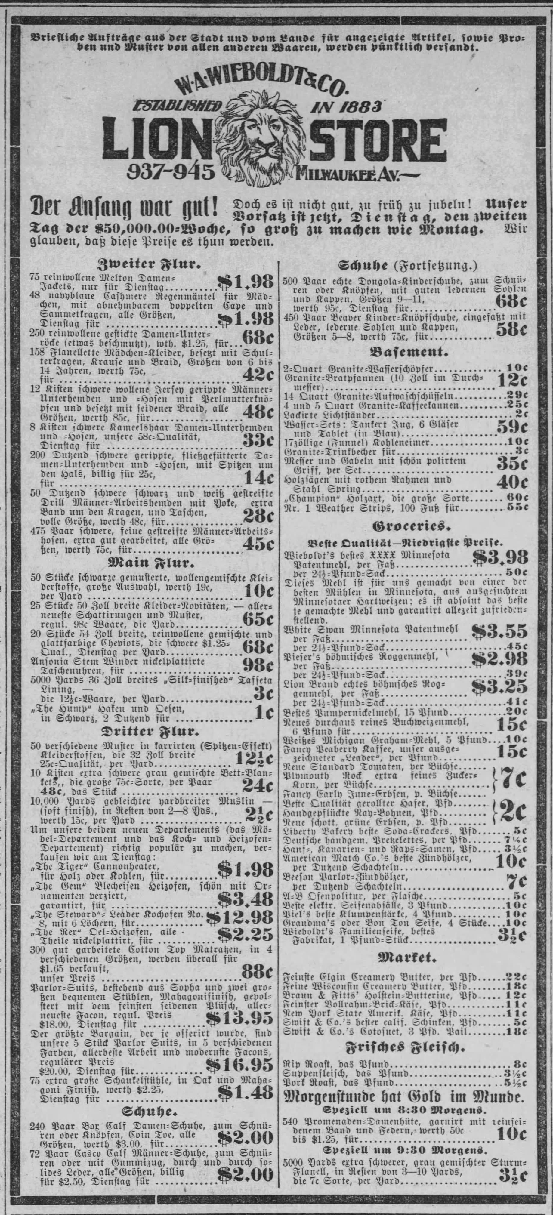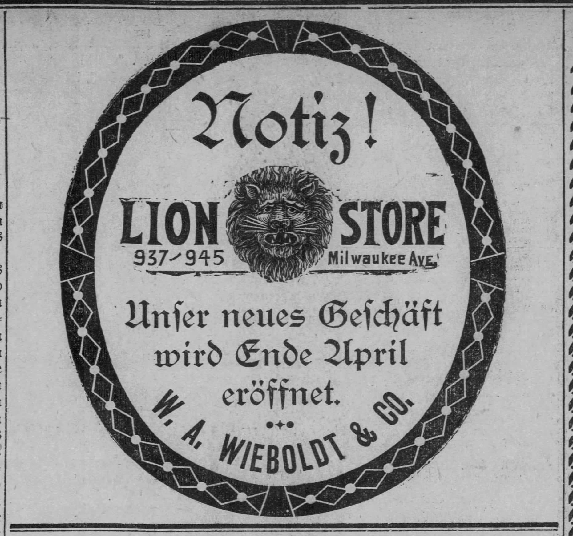 From burning rubble and the buying power of the German and Polish working classes, William A. Wieboldt built a department store empire out of this location on Chicago’s Milwaukee Avenue. Known as the Lion Store, Wieboldt’s first shop at this site burned down in November 1897. By Christmas he’d bought the land, less than six months later Wieboldt's new Lion Store (designed by architect R.C. Berlin) opened, and within five years the department store had doubled in size. Rather than compete with the big boys downtown, W.A. Wieboldt focused on serving customers in their own language and in their own neighborhoods, and over a century that approach grew the company into a 15 store chain.