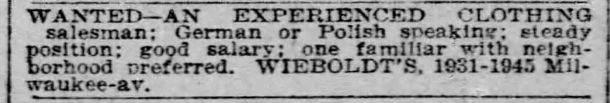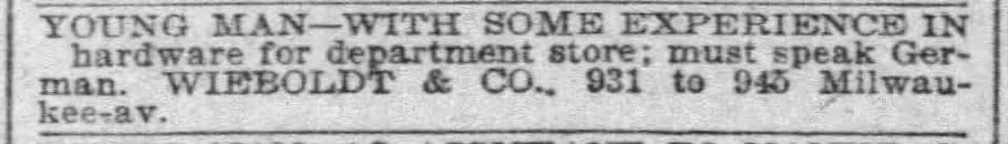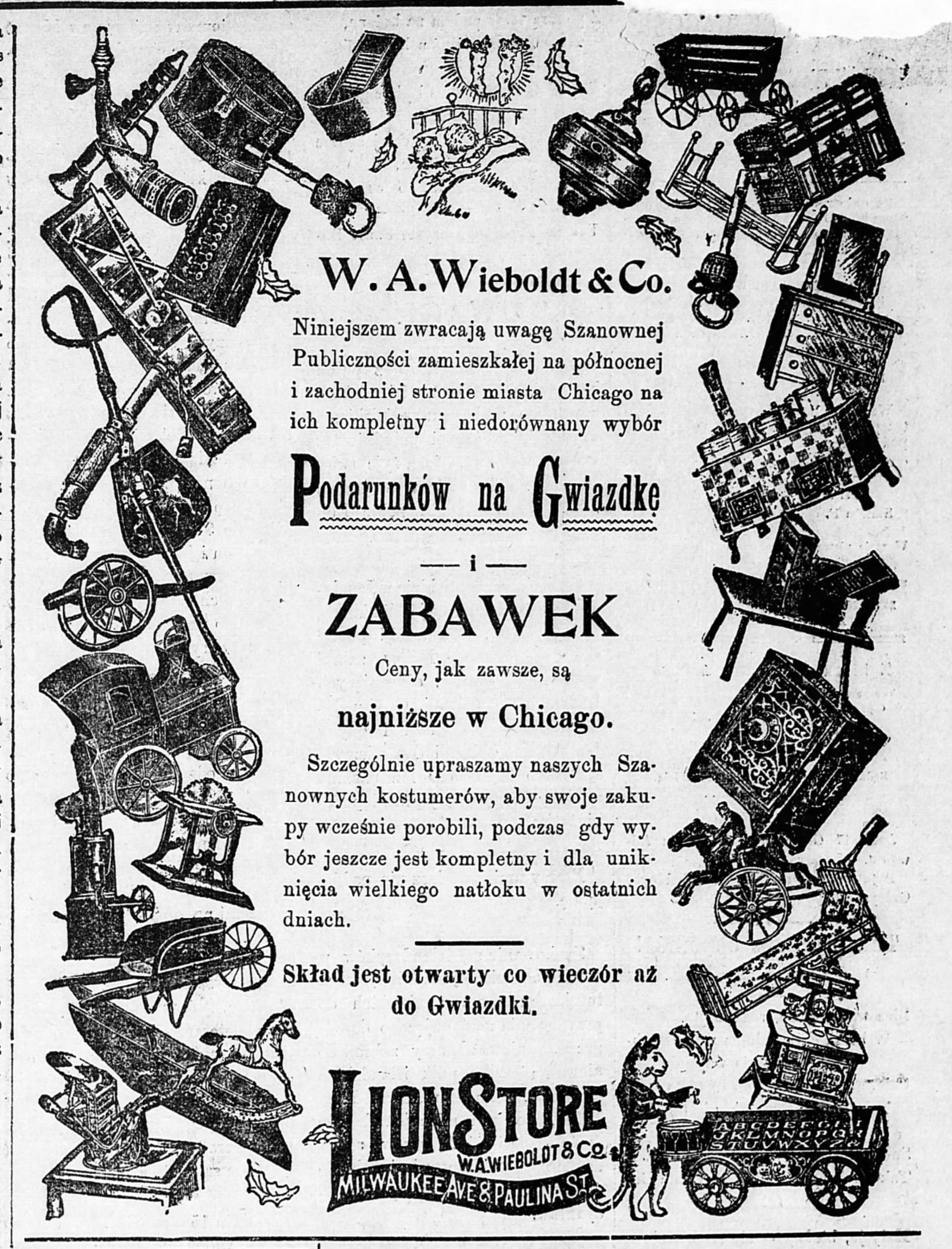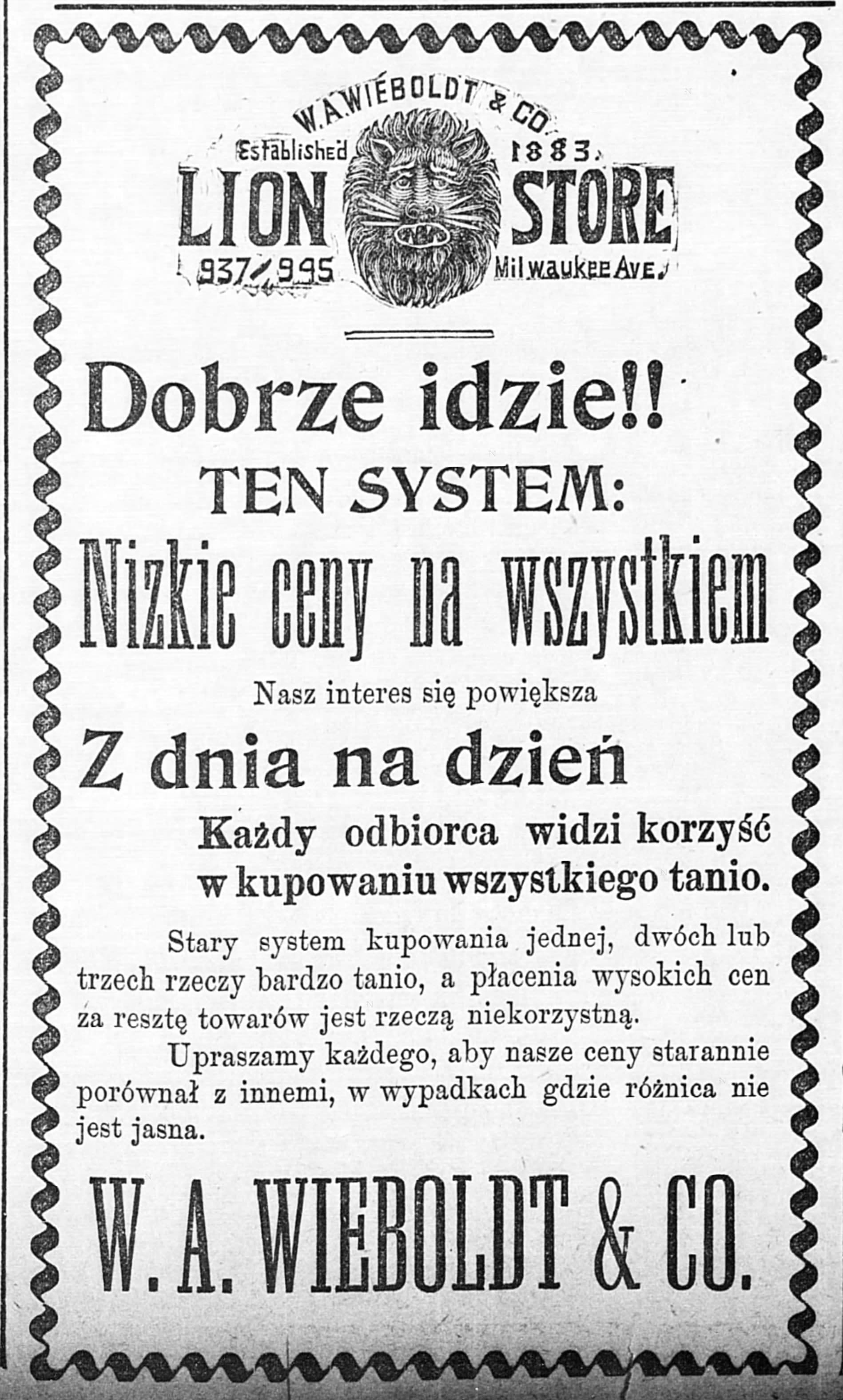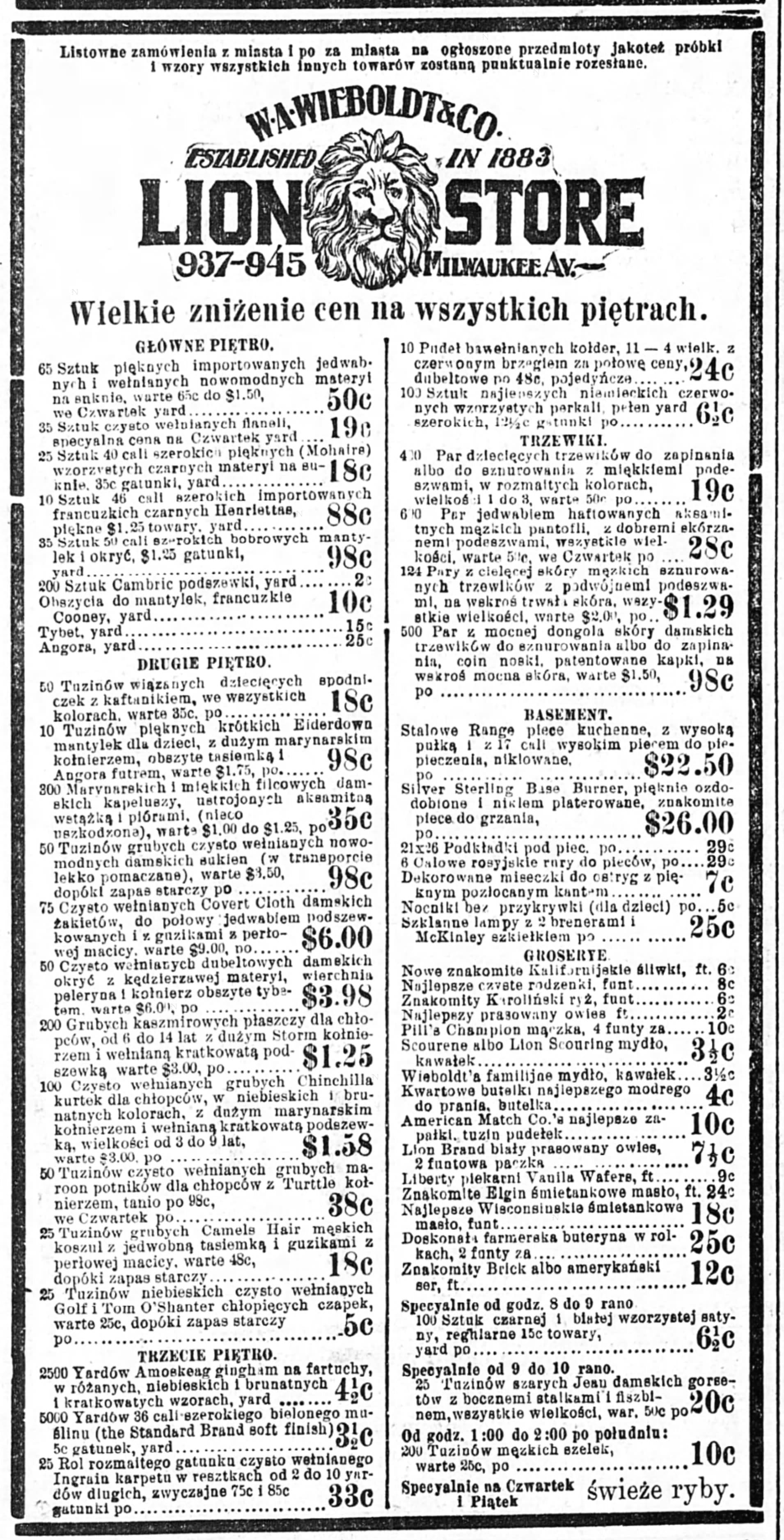 1898 Lion Store ads in Polish, German, and English | 1899 Polish-language ad | 1898 German-language ad | 1904 and 1905 help wanted ads for German and Polish speakers