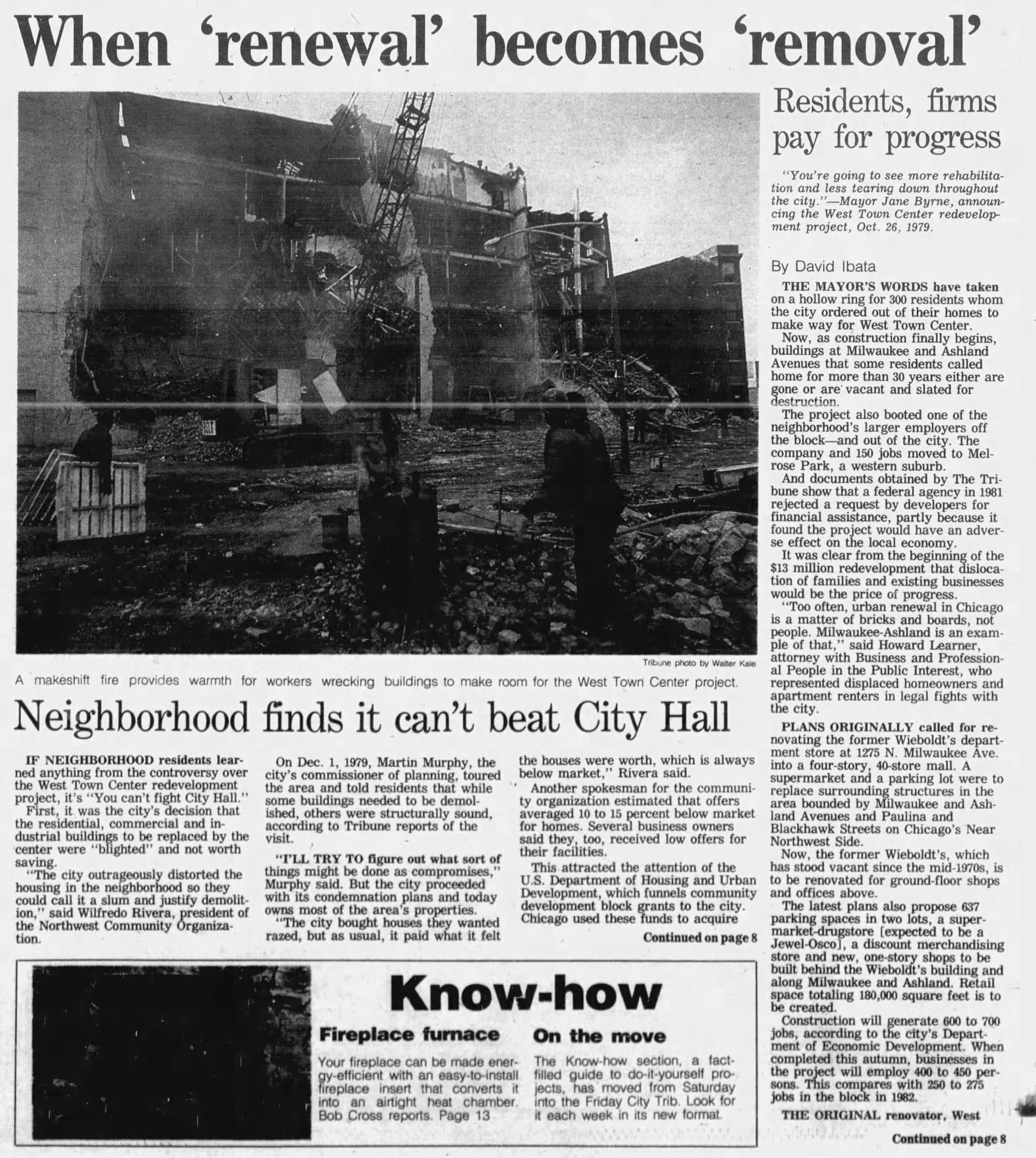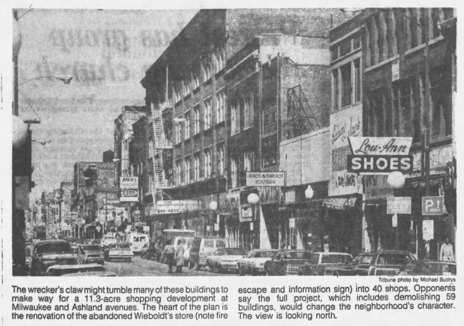Wieboldt’s closure turned the building into a giant lifeless void on Milwaukee Avenue, and in response capital and government turned to their favorite mid-century tool—urban renewal. Flush with $3.7m ($17m today) in funding from the Department of Housing & Urban Development to condemn, acquire, and clear the site, a developer embarked on a $15m project to build “West Town Center”, renovating the empty Wieboldt’s building into a 40 store indoor mall, surrounded by hundreds of parking spaces and with a new, single-story shopping center. To pave the way for the development, the City of Chicago condemned 59 residential and commercial properties in the block bounded by Milwaukee, Paulina, Blackhawk, and Ashland.